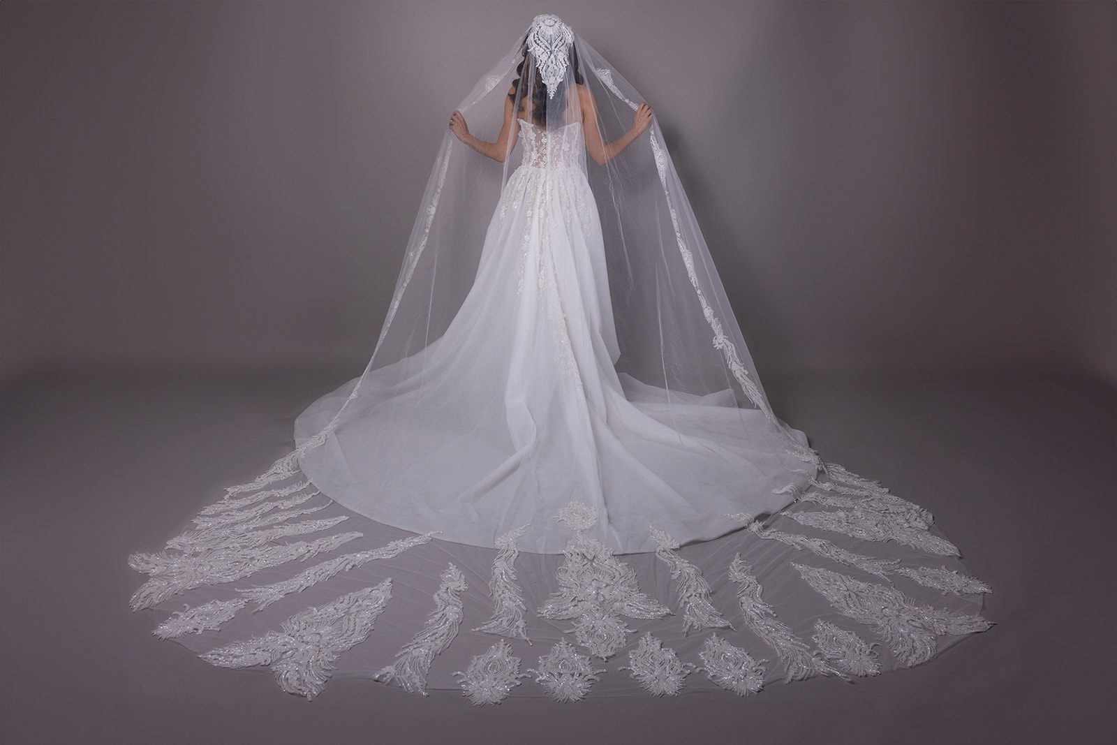 Infuse your bridal look with Spanish flair and elegance. The combination of embodied lace and beading creates a veil that is not just an accessory but a symbol of passionate love and cultural richness.