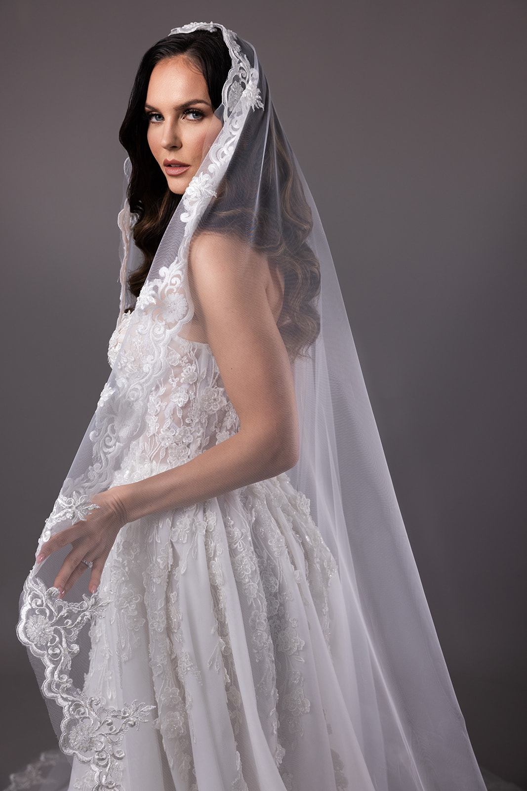 Walk into a world of timeless romance with our Classic Lace Spanish Style Veil. The intricate lacework captures the essence of tradition, creating a veil that stands as a symbol of enduring love.