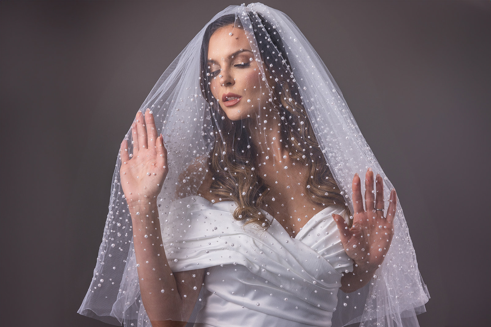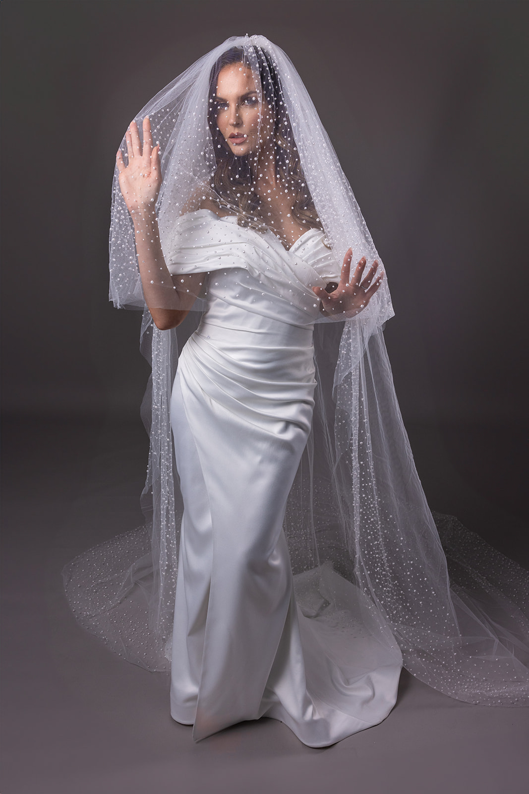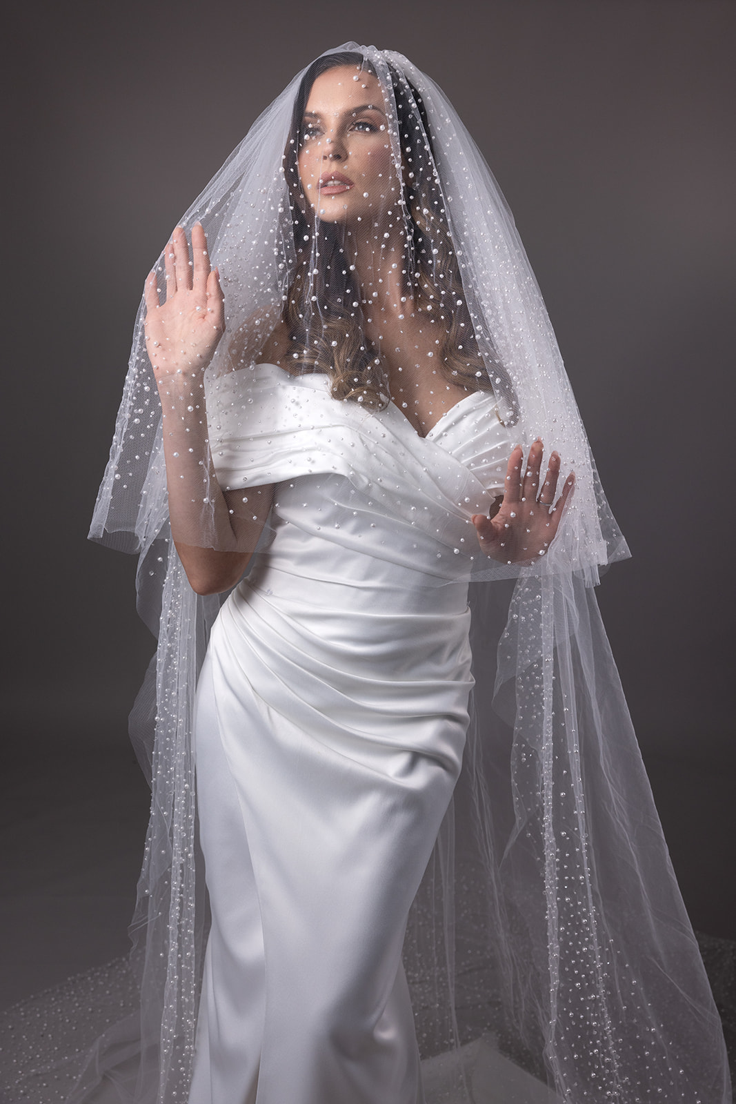 Unveil pearlized grace on your wedding day with our Crystal and Pearl Veil featuring a blusher. The combination of pearls, crystals, and a blusher makes it a perfect choice for the bride who desires a romantic and graceful look with a touch of luxury.
