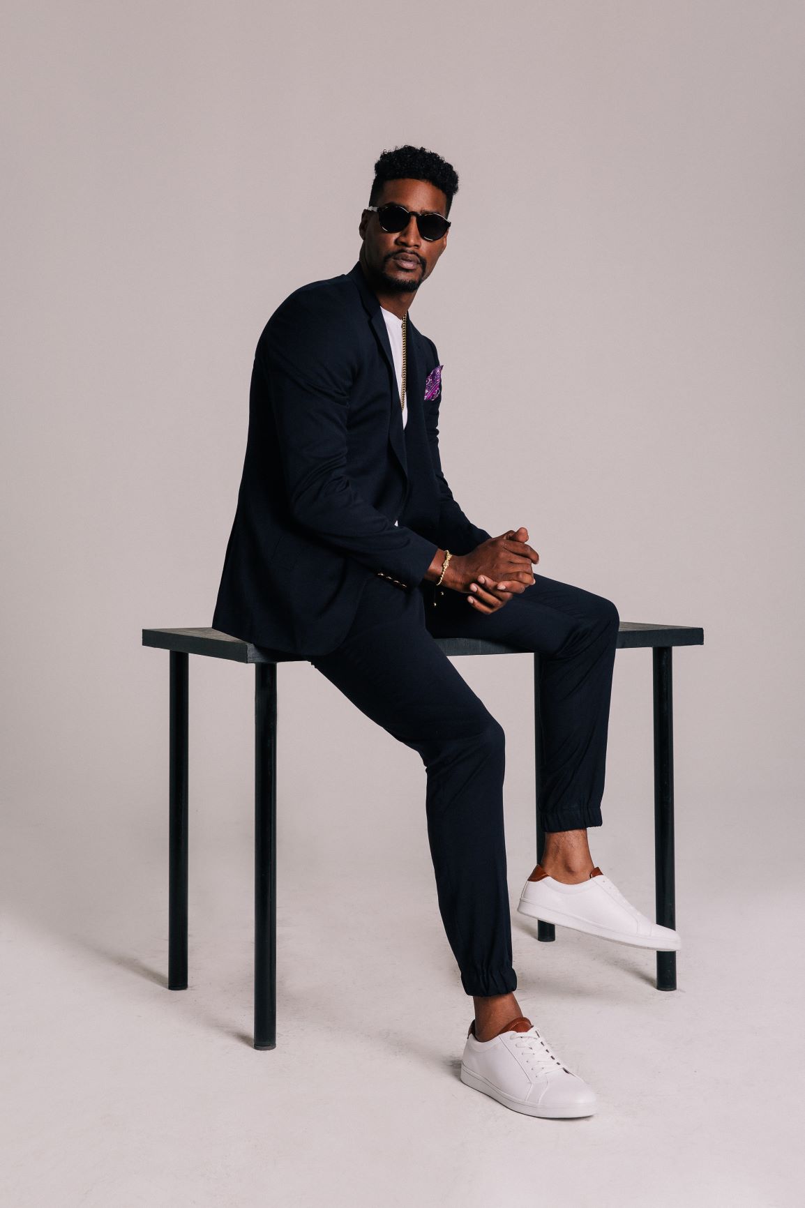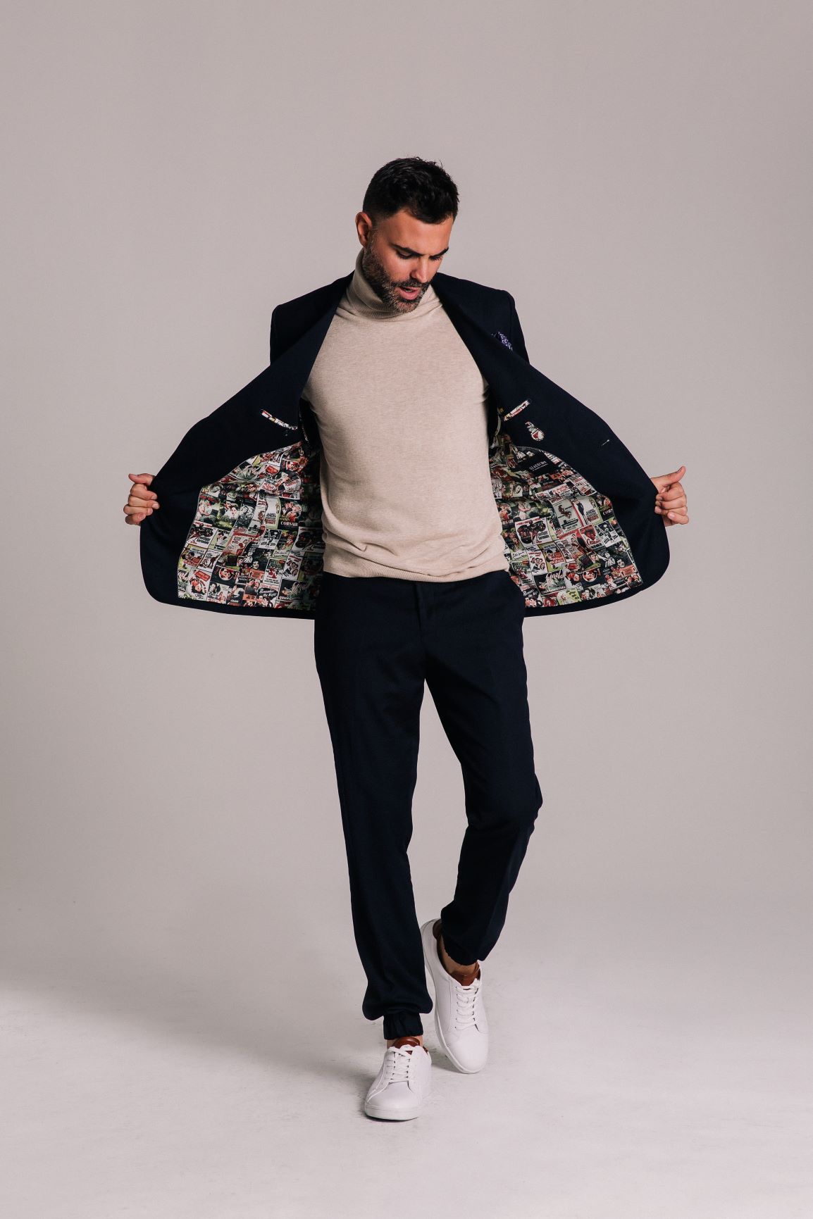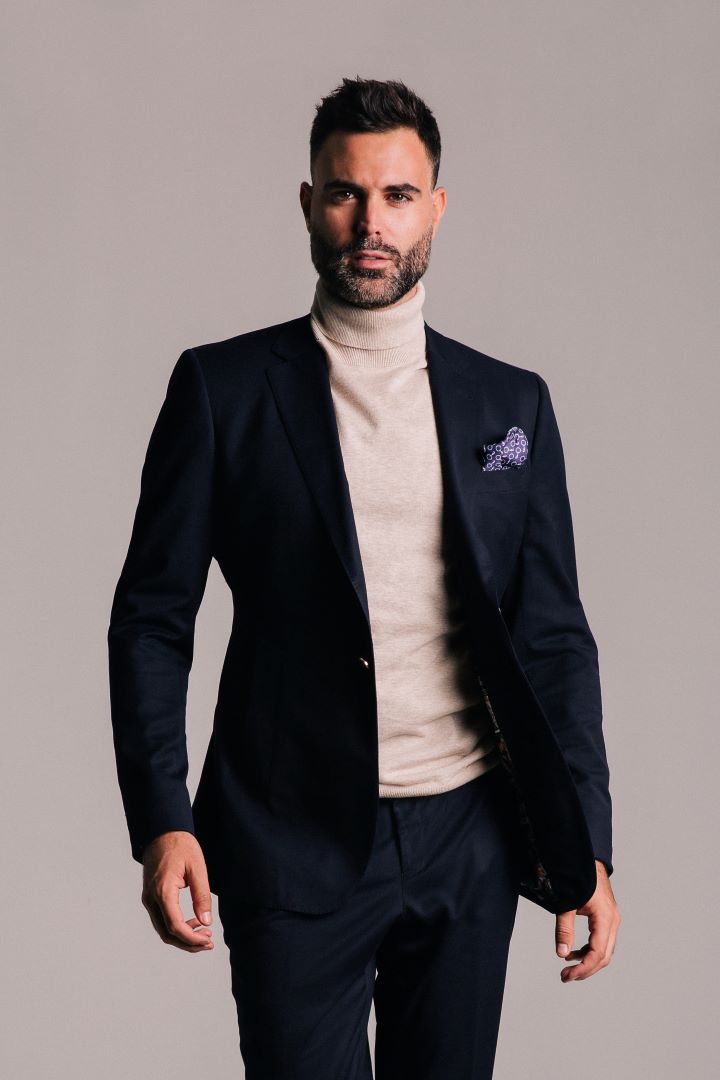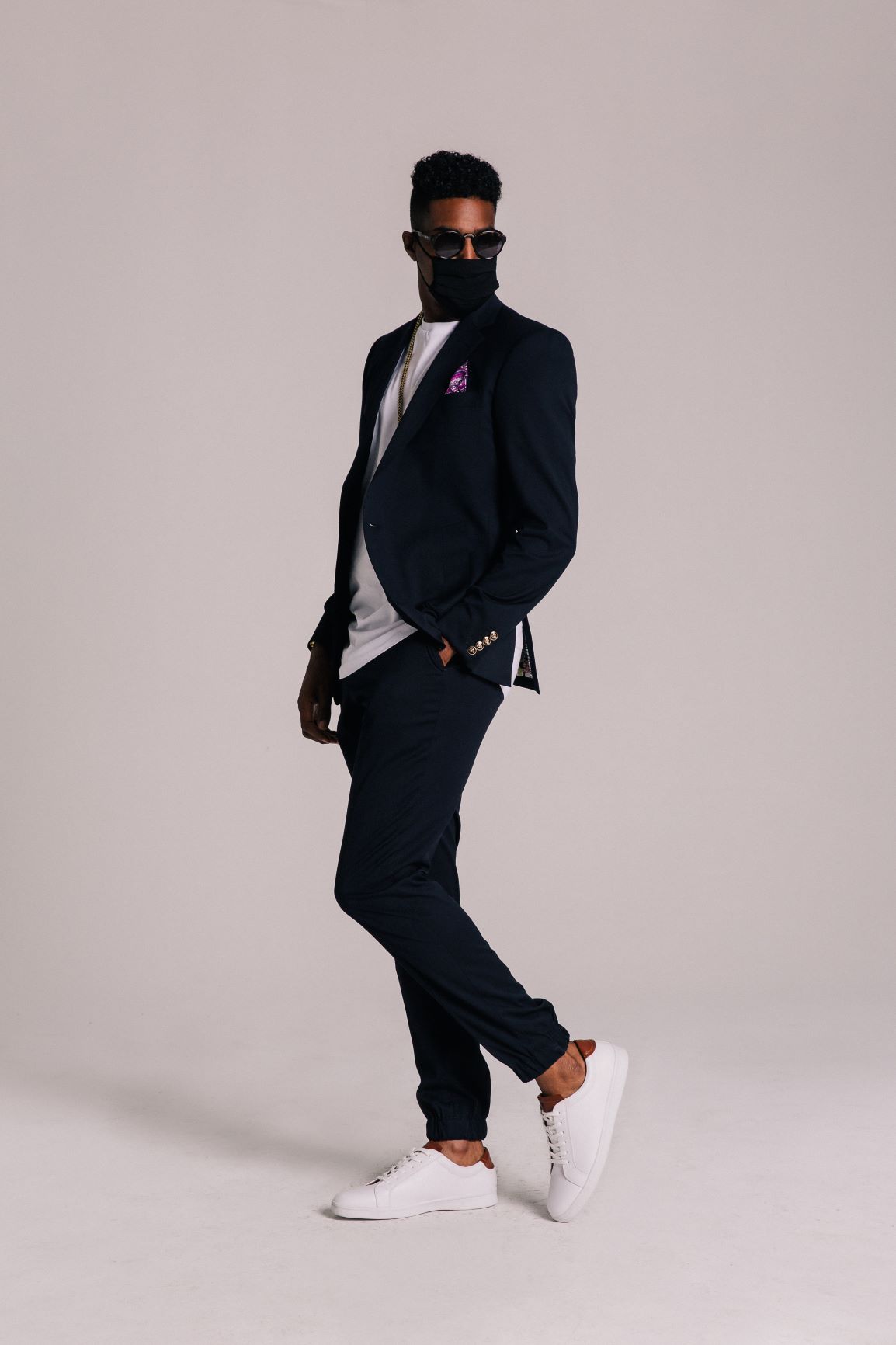 Midnight Blue Blazer is innovative with its relaxed but tailored look for the stylish and luxurious 2020 Man. Feel confident wearing a perfect fit blazer with gold detailed buttons, tailored jogger pants with cuff to show off your favorite sneakers, and finish up with a matching mask.