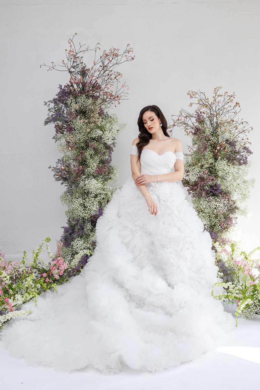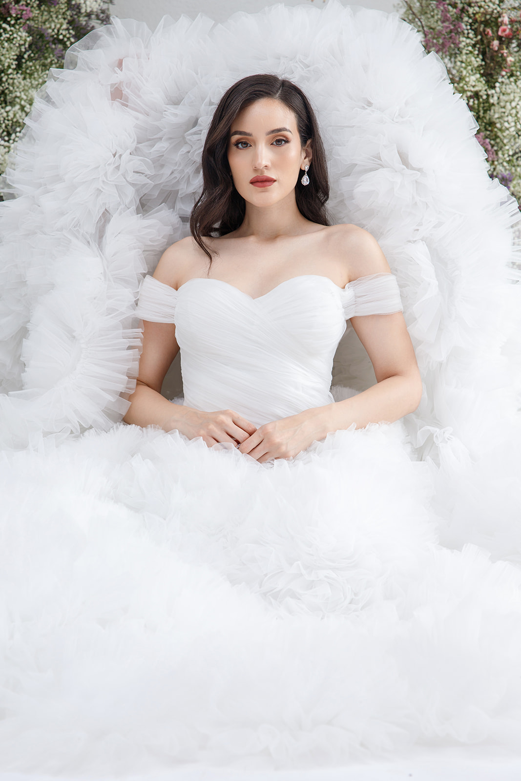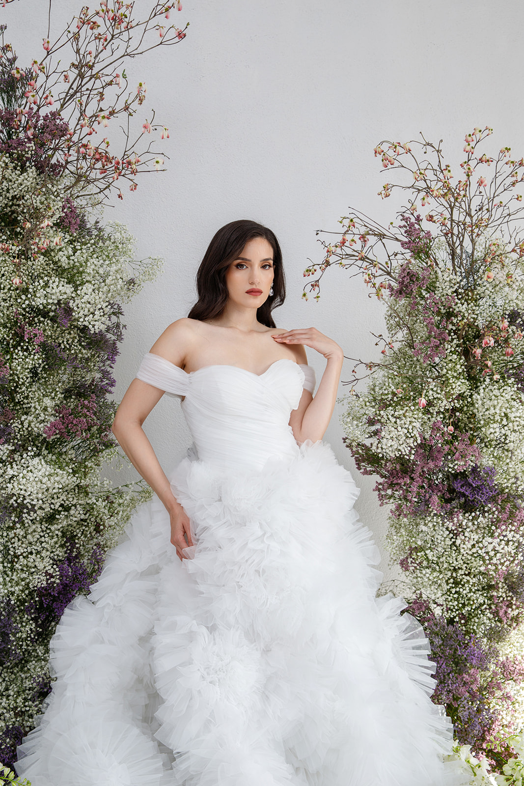 Introducing our unique ruffle ballgown, where cascading ruffles evoke the beauty of blooming flowers. With an off-the-shoulder pleated top, this gown has been showcased by Designer Johana Hernández for a touch of haute couture elegance.