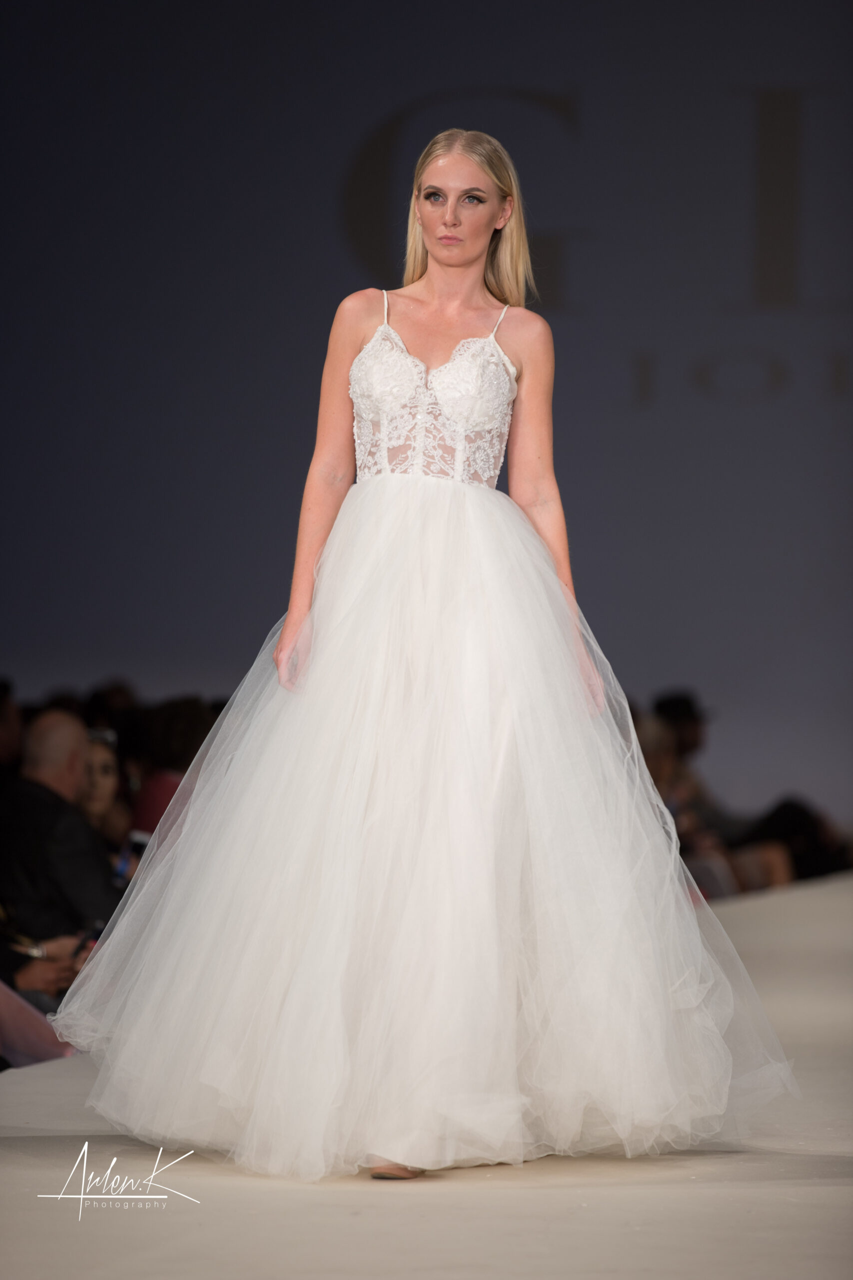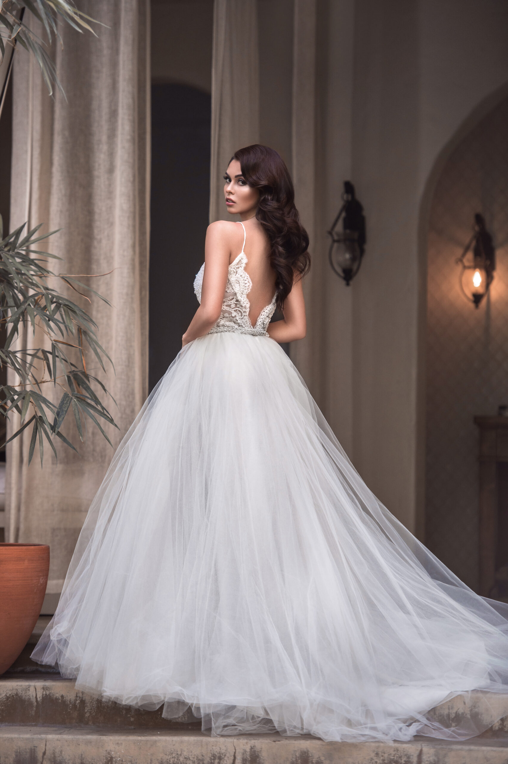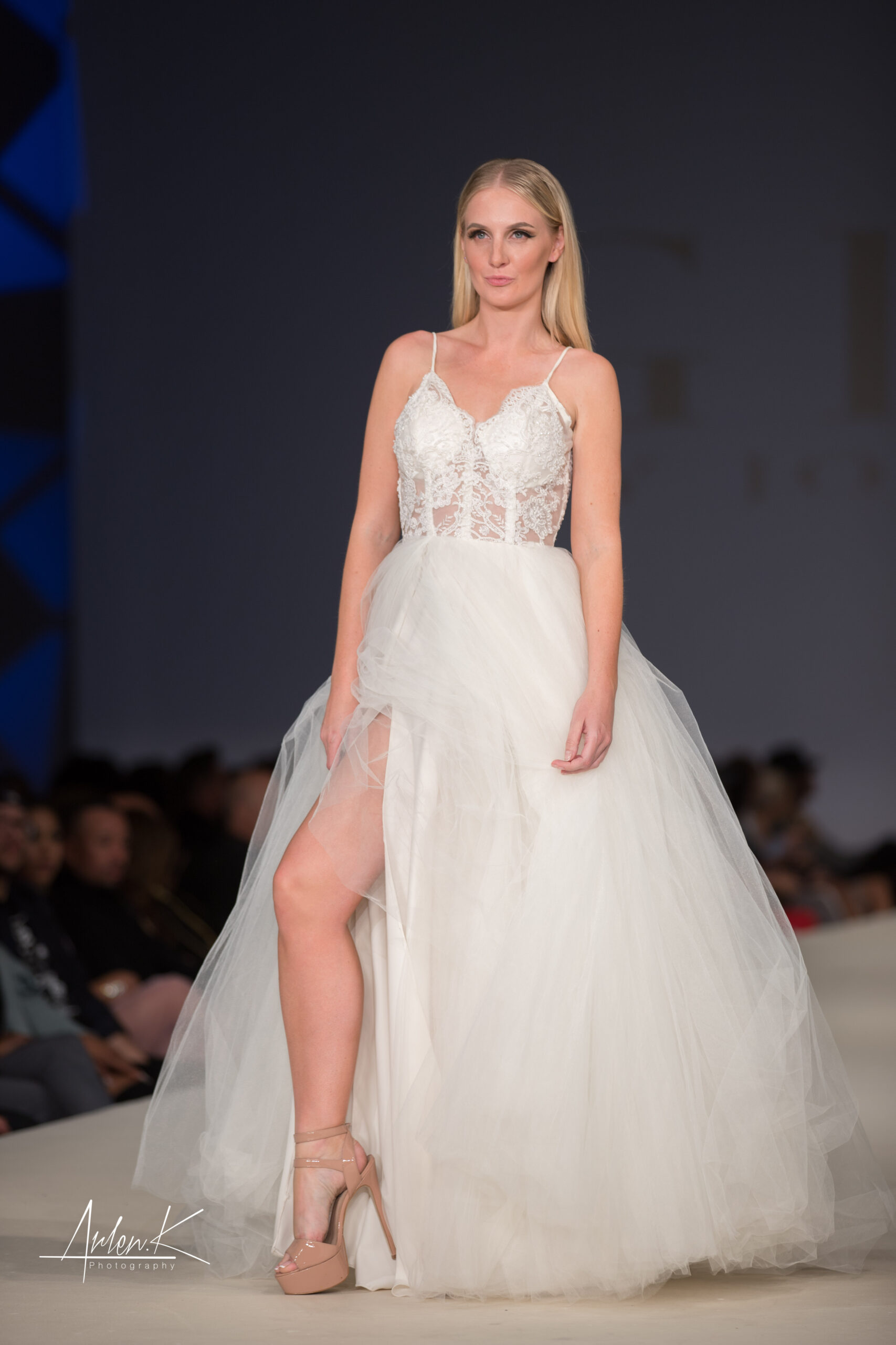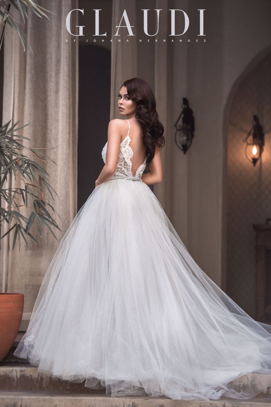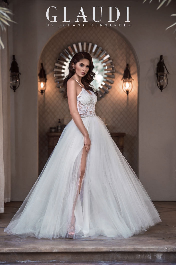 A sexy but sophisticated look for your amazing wedding day, with detail lace and beading on the top. Corset sheer spaghetti strap beaded lace top with tulle ball gown and slit two detail slits with ivory tulle on top for the perfect A line gown.