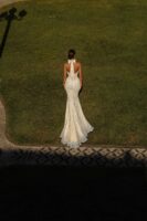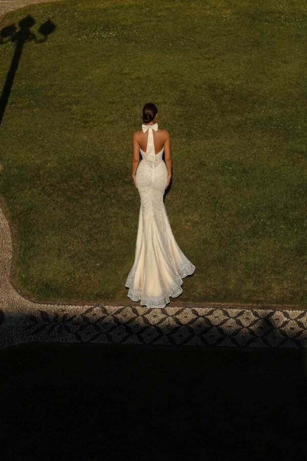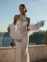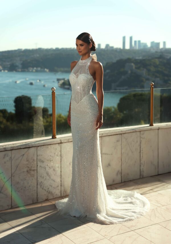 Sleek, modern, and radiant, fully beaded halter gown hugs the body with a sculpted silhouette and sheer high neckline. Perfect for the bride who wants to sparkle with sophistication from every angle.