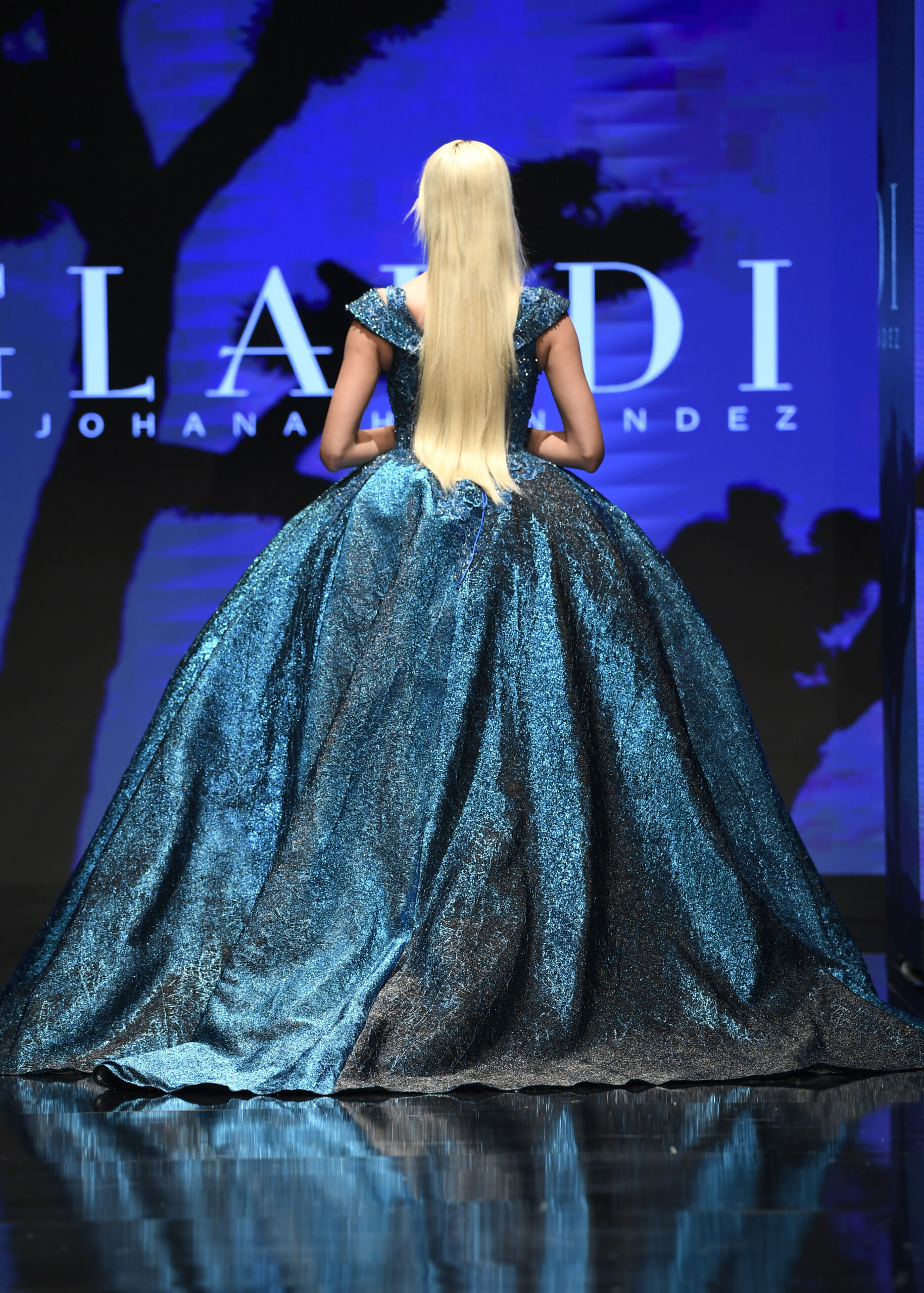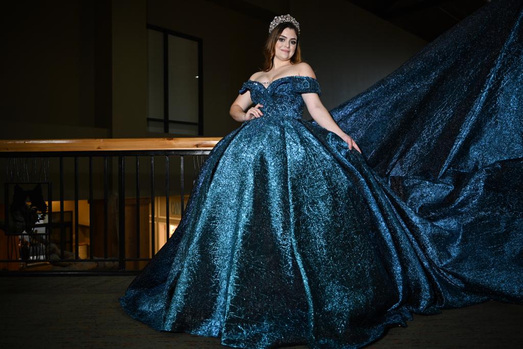 This gown is perfect for the quinceanera that wants to stand out! It is truly one of a kind made entirely of ultra shiny blue fabric, and features off the shoulder detail.