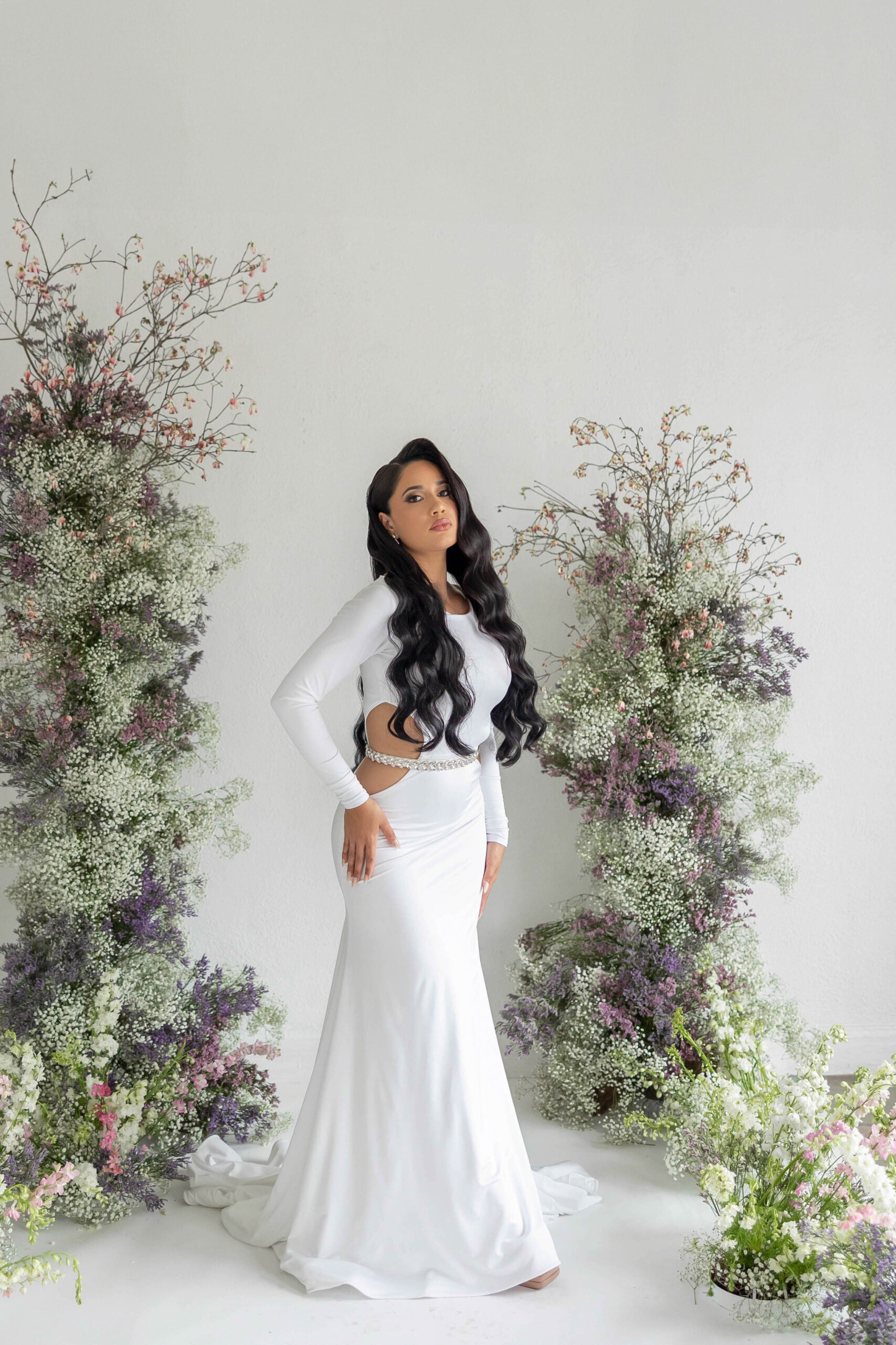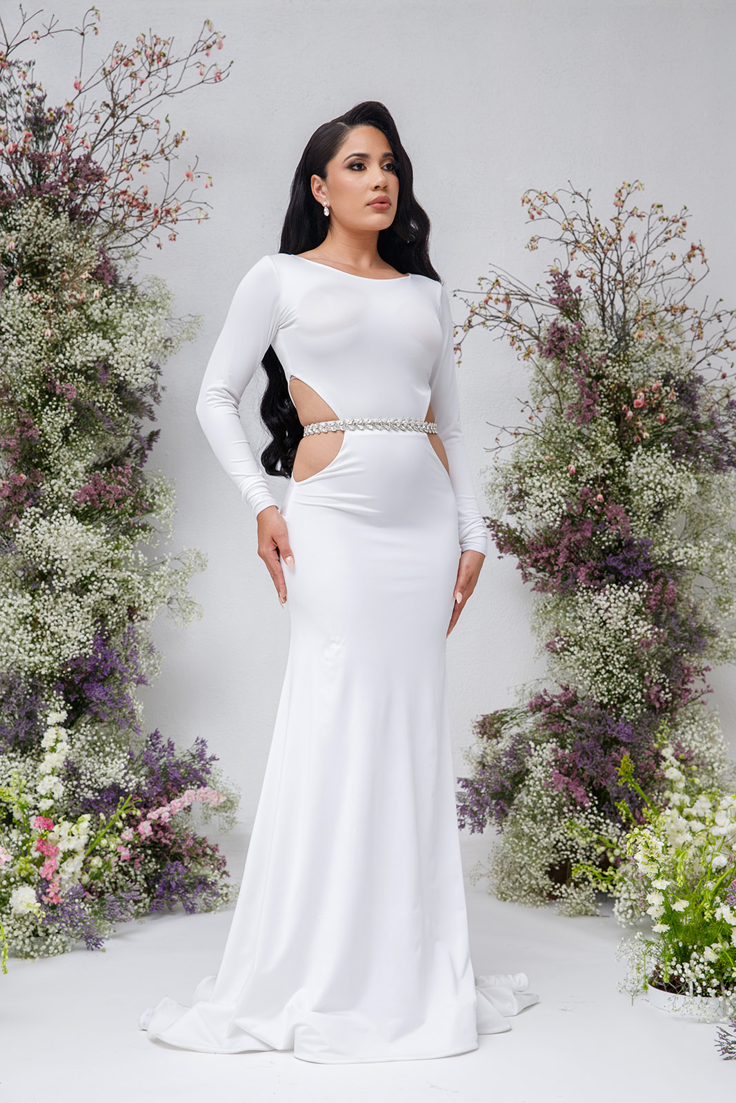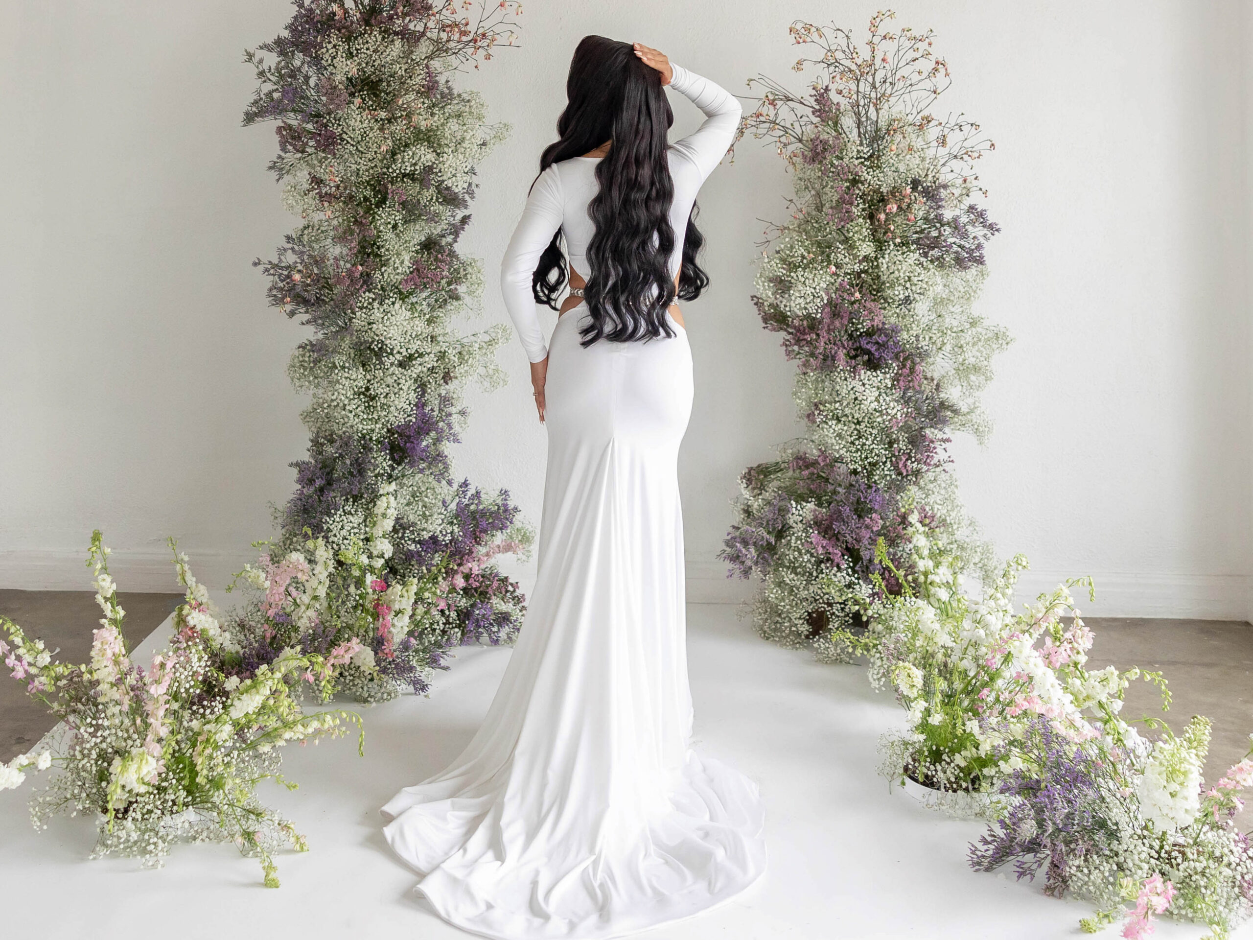 A chic off-the-shoulder wedding dress with a trailing train, featuring a corset and the option to add a detachable single sleeve for extra flair.