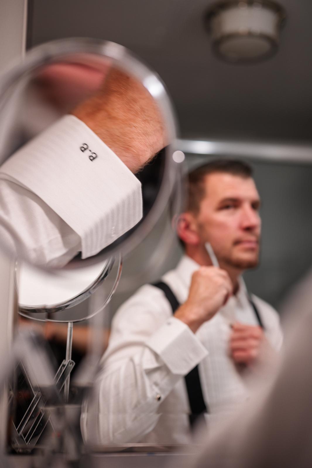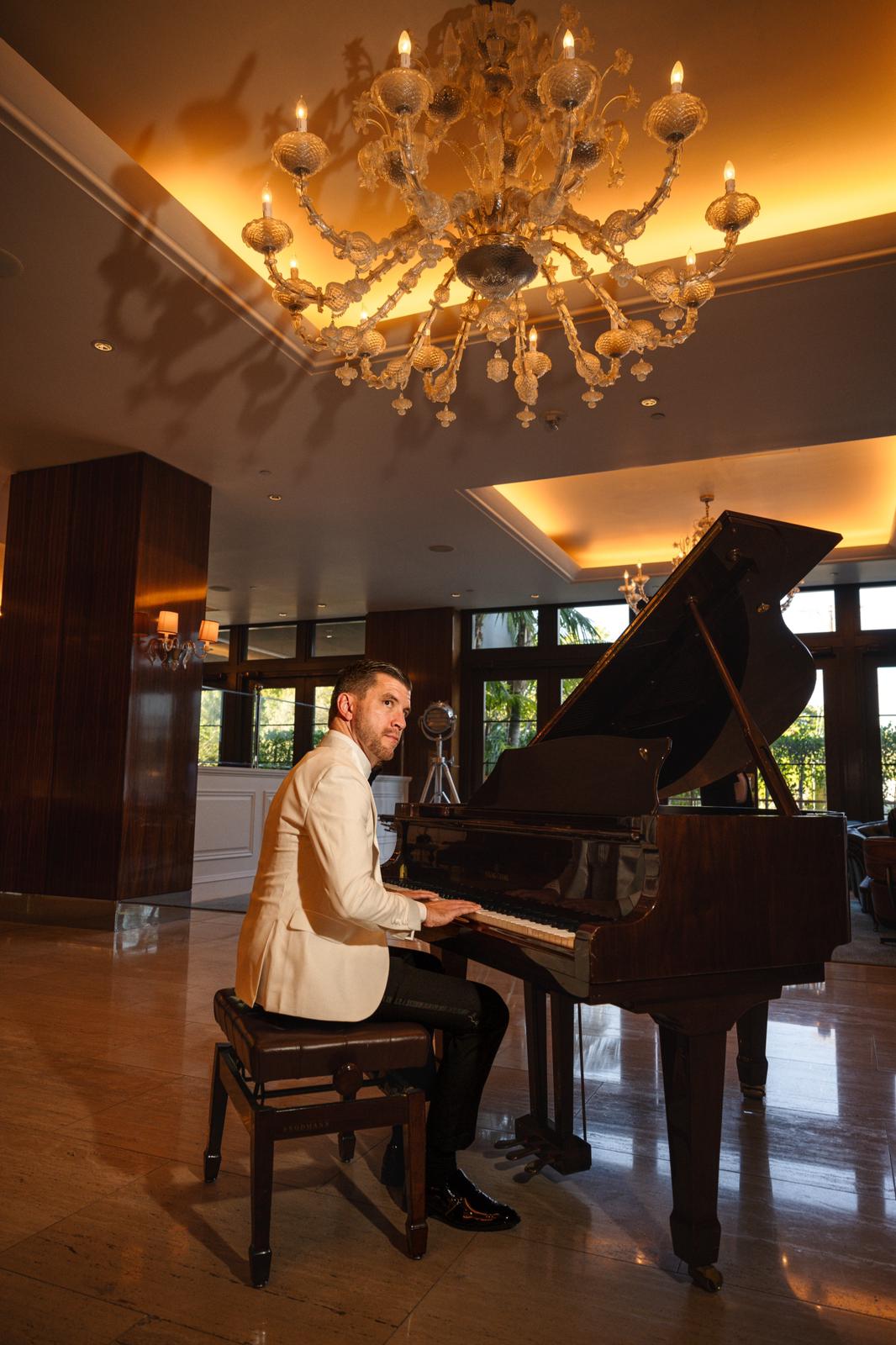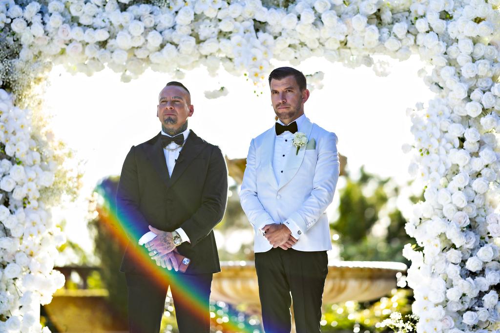 A sophisticated ensemble designed by Johana Hernandez. This exquisite tuxedo features a shawl silk lapel, personalized with the groom’s name and initials on the shirt, adorned with sleek black glossy buttons for a modern flair. Complete the polished look with tailored black pants for a timeless and elegant style.