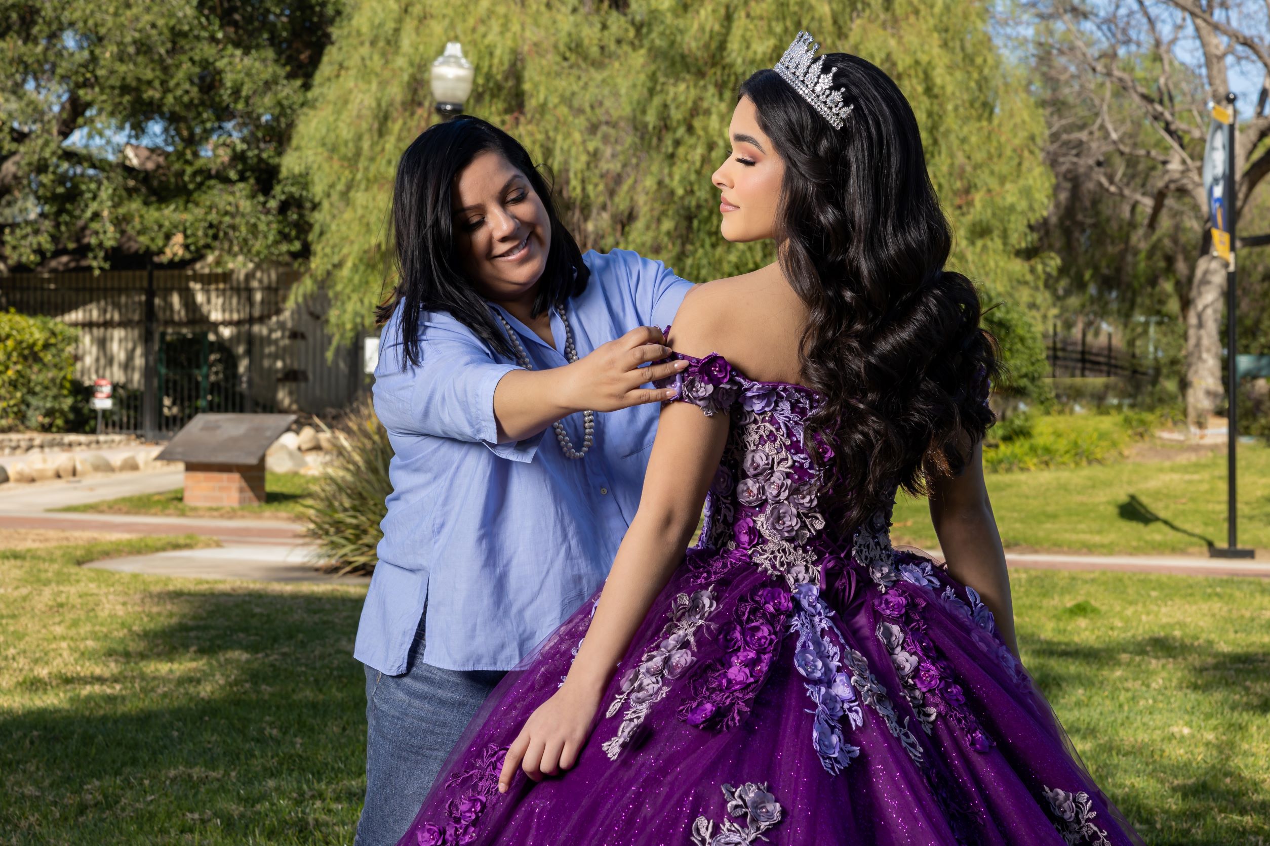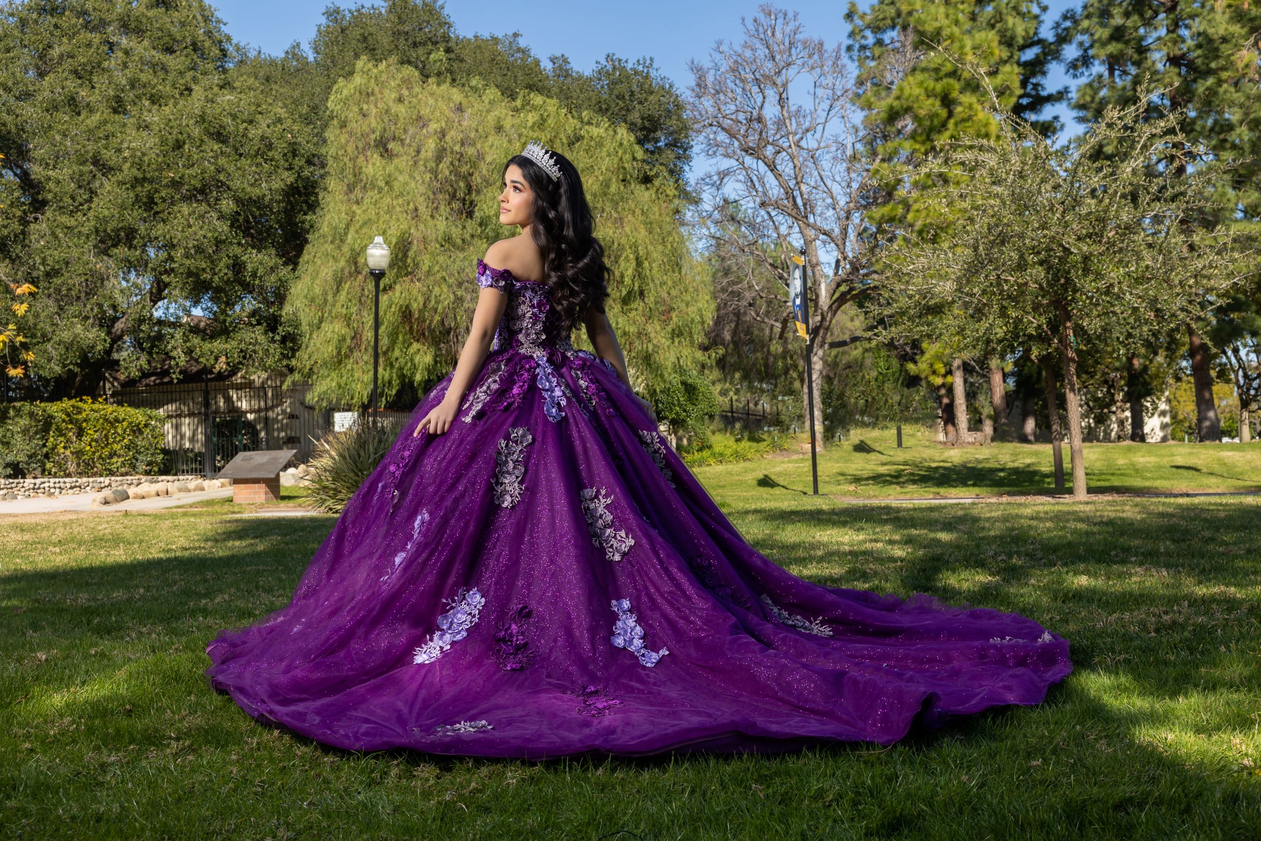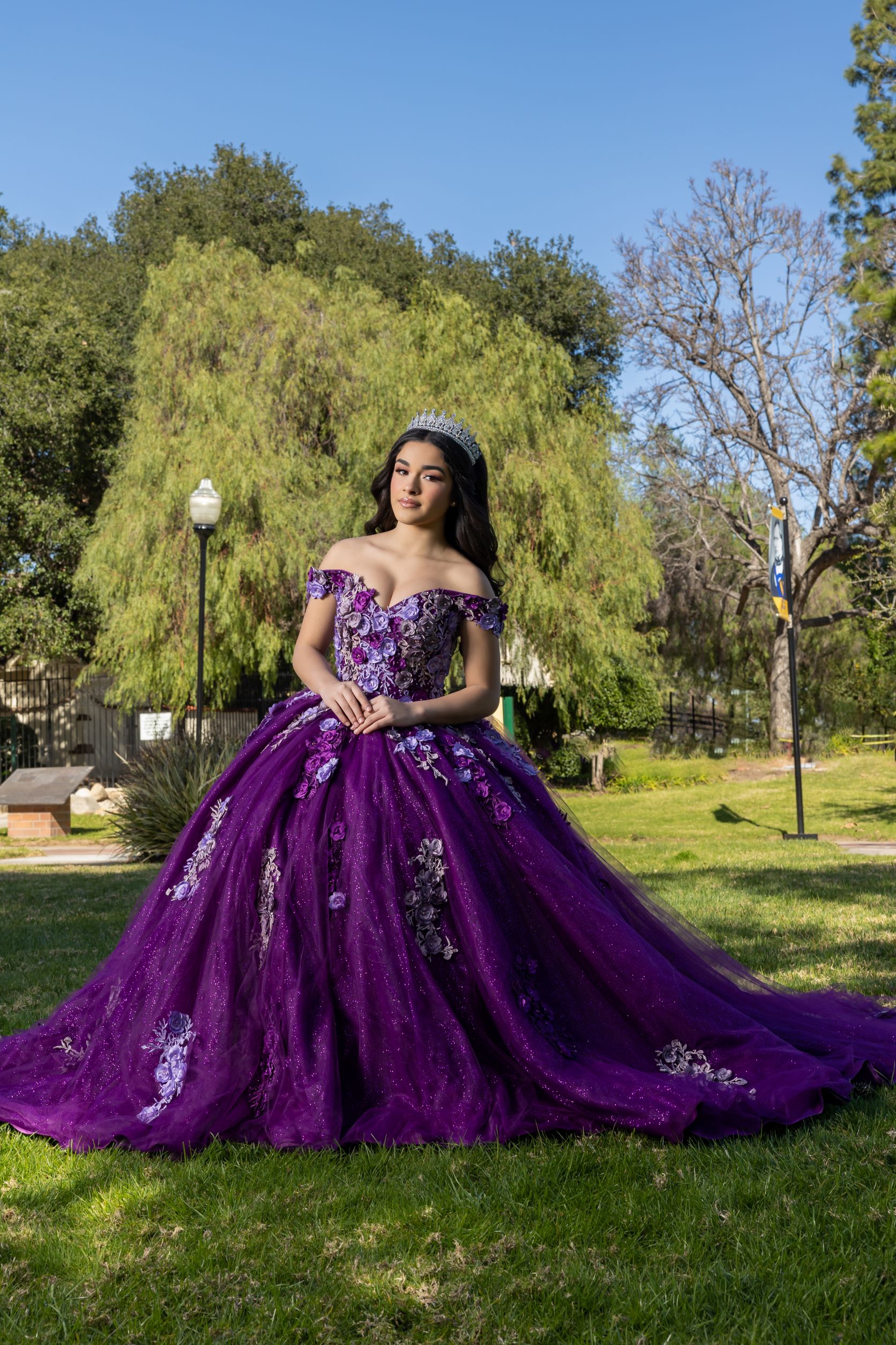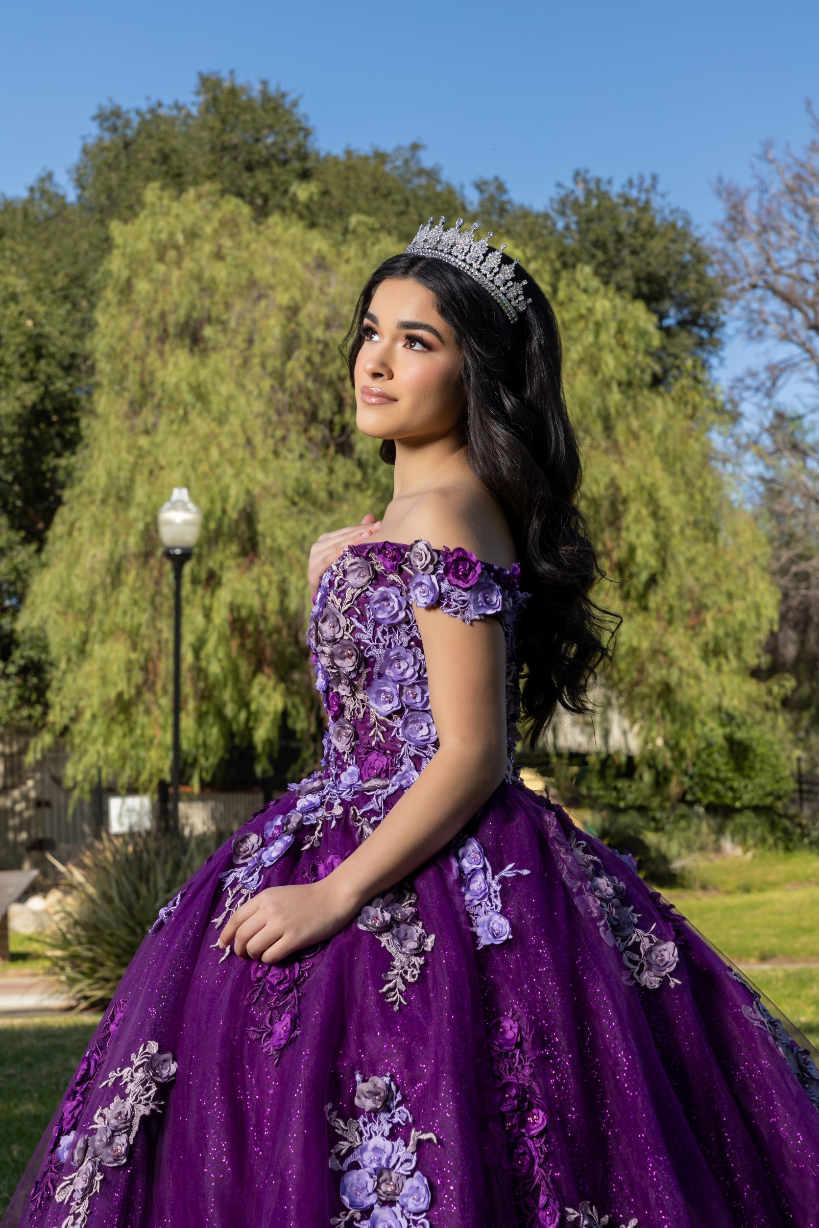 All lovely shades of purple, bringing light and dark tones together to create a magical piece! 3D flower effect with a shimmer layer on the skirt. Creating the perfect glow for your quince. Corset back