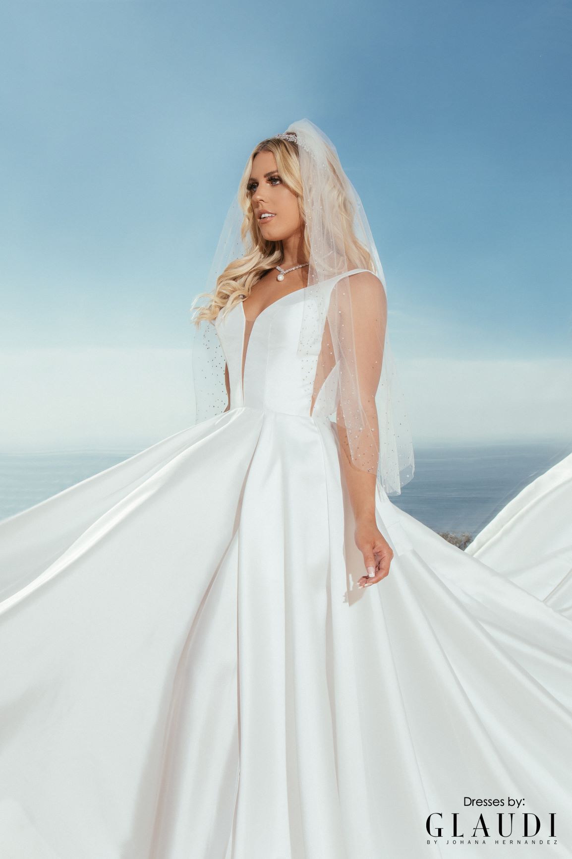 Our bridal satin A line gown is perfect design for any outdoor wedding. Elegance with your amazing train, nude mesh v cut in the front and side opening, deep v cut back, and a front side slit! Paired with a back bow and underling skirt.