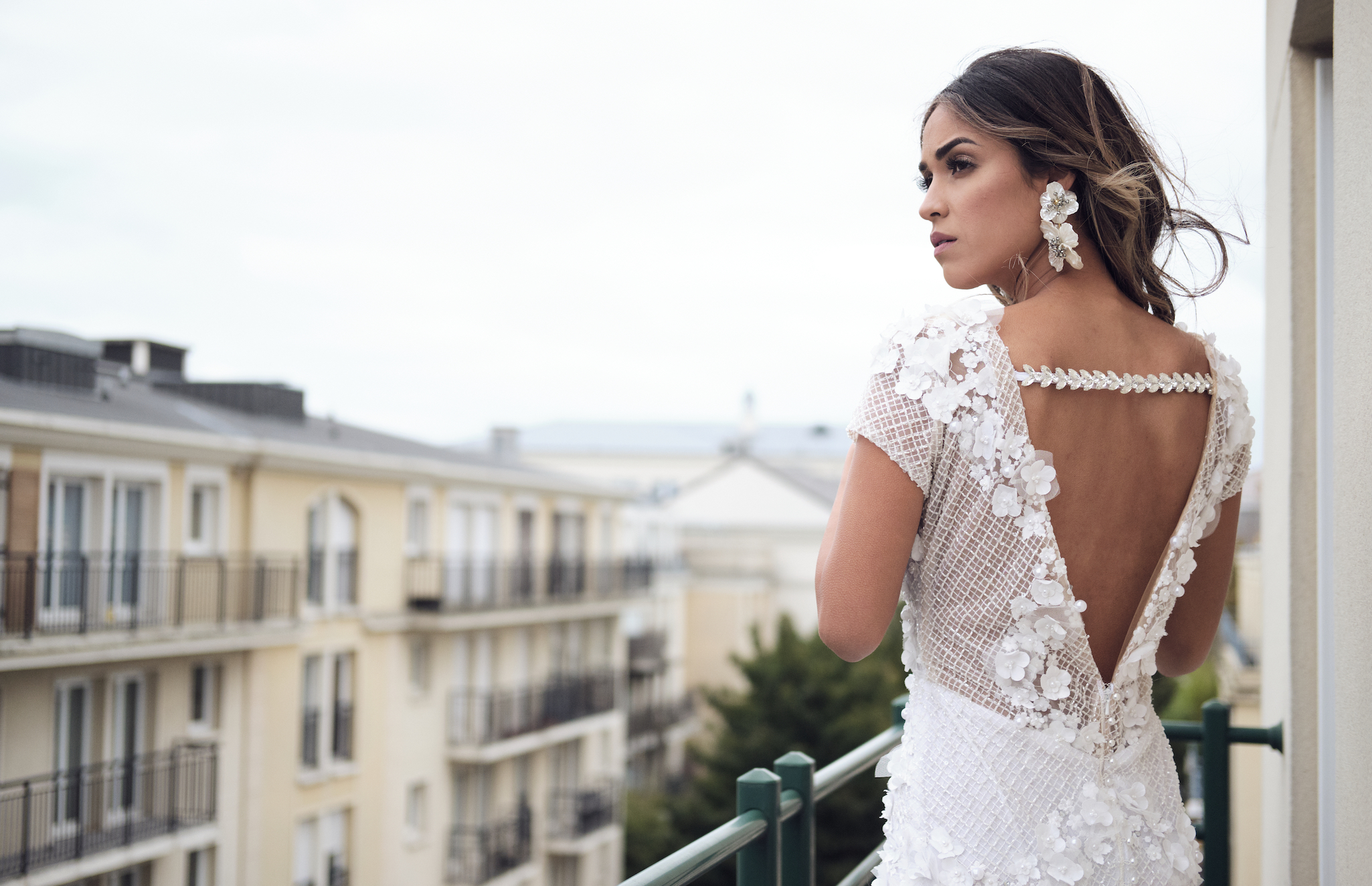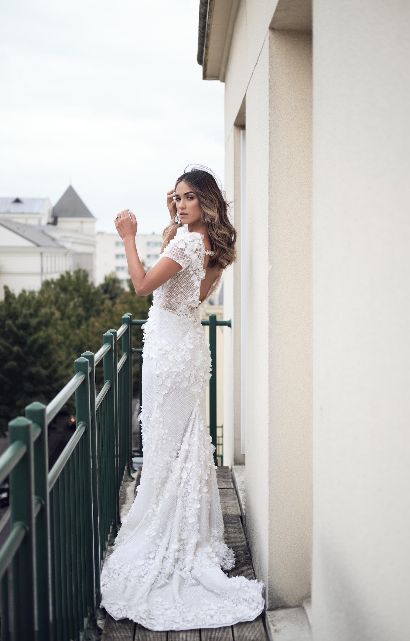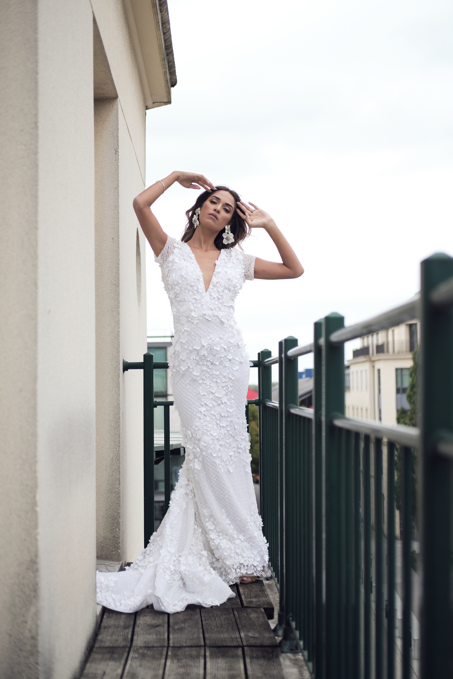 This gown is hand beaded to perfection featuring hand made floral appliqués and pearls. A sheath style gown with a lovely beaded cap sleeve, deep V neck, and long embellished train.