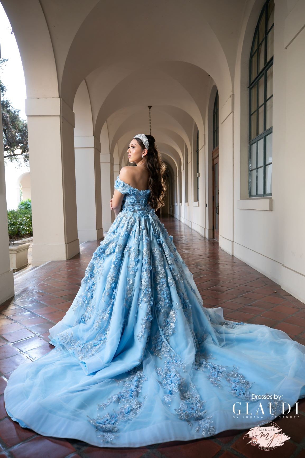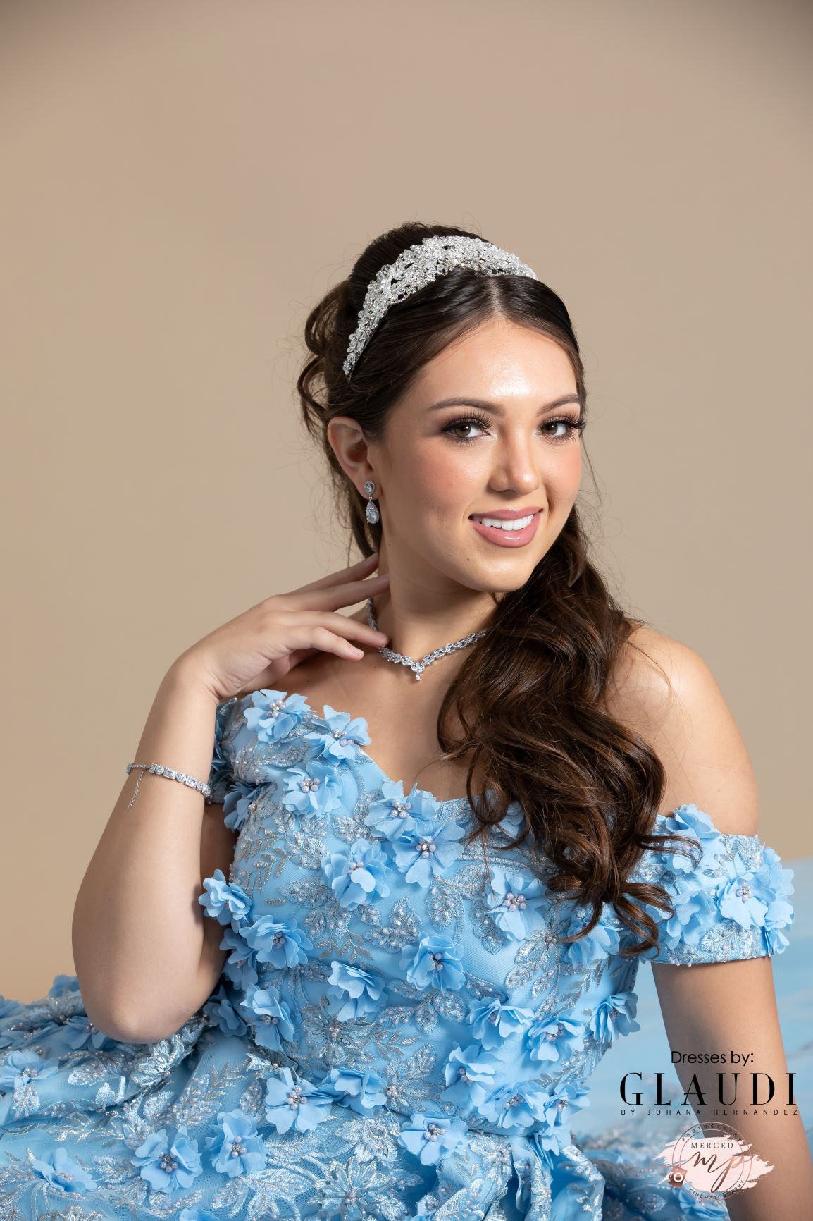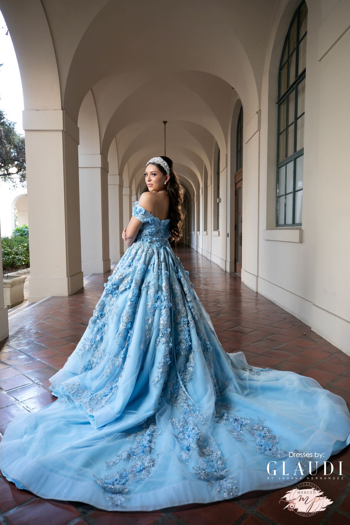 This gown is so dreamy for your quince, with 3D hand sewn flowers throughout the gown and pleats. Amazing long train and off the shoulder style with back corset.