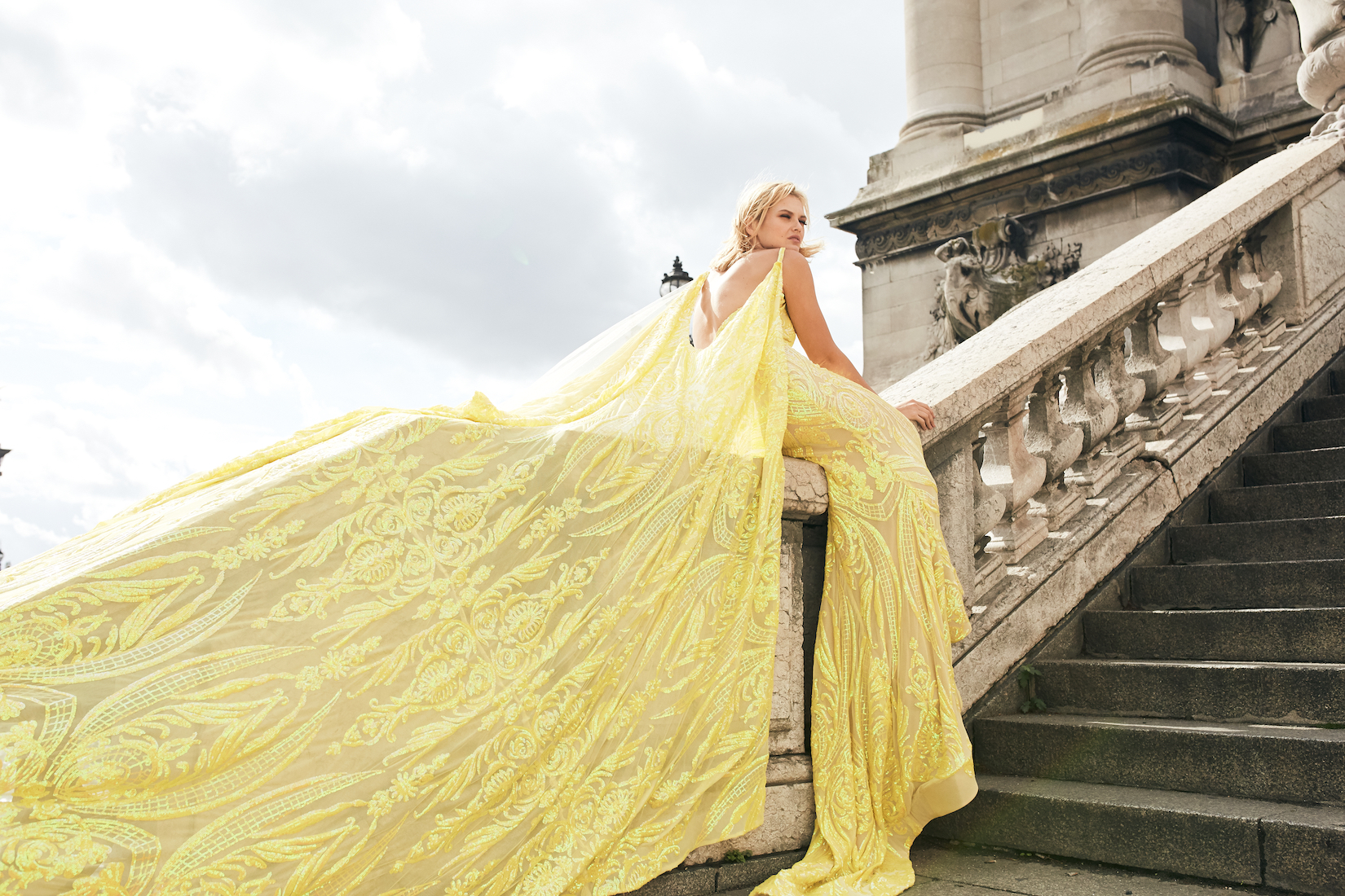 This show stopping gown is made from incredibly comfortable stretch nude illusion fabric covered in brilliant yellow sequins. This dress features a form fitting mermaid silhouette, spaghetti straps, V neck, low back, and a long stunning cape. Truly a one-of-a-kind gown.