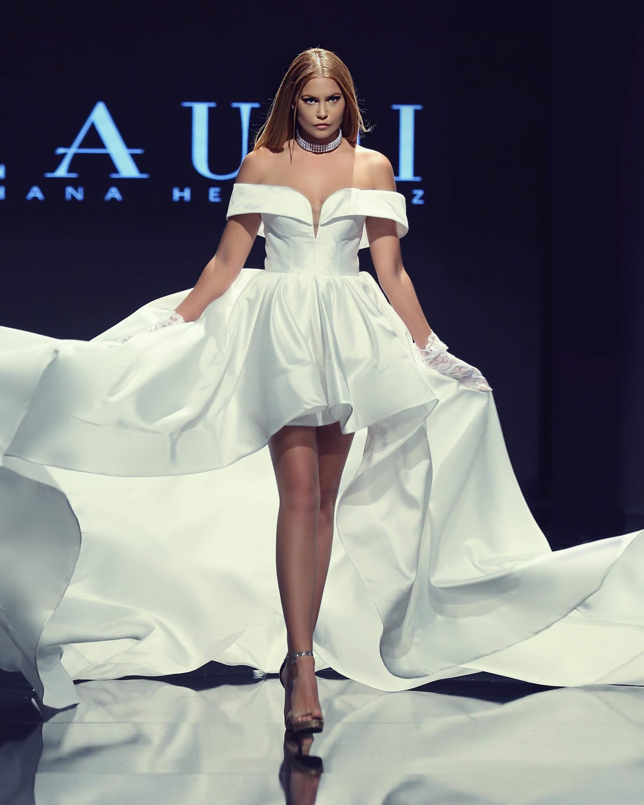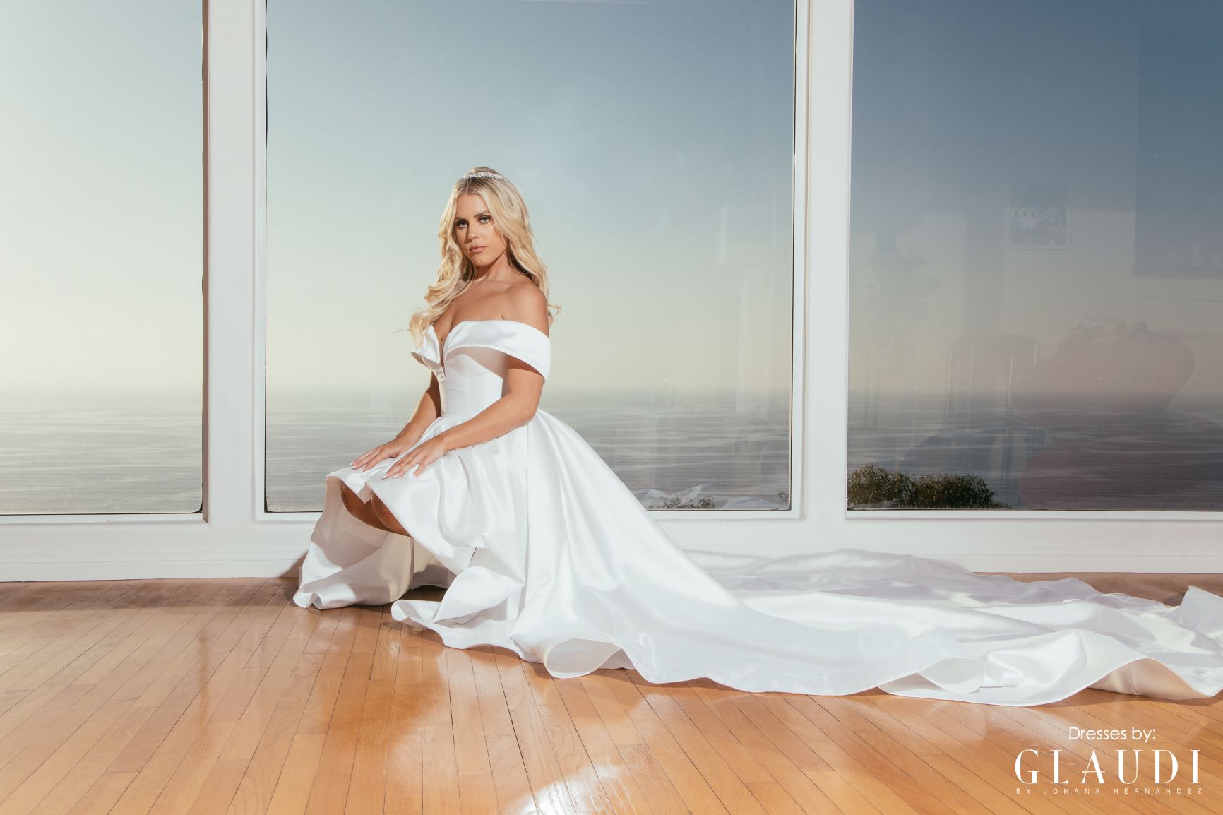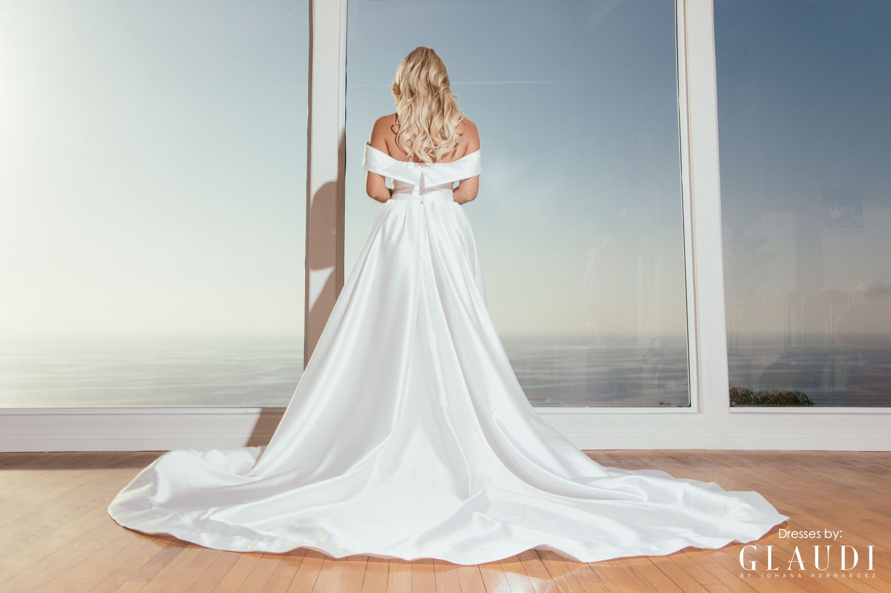 Style and grace in our one of a kind high low gown! A new bridal off the shoulder gown with the illusion of short in the front and long train in the back with pockets! Built in corset and pearl buttons down the back.