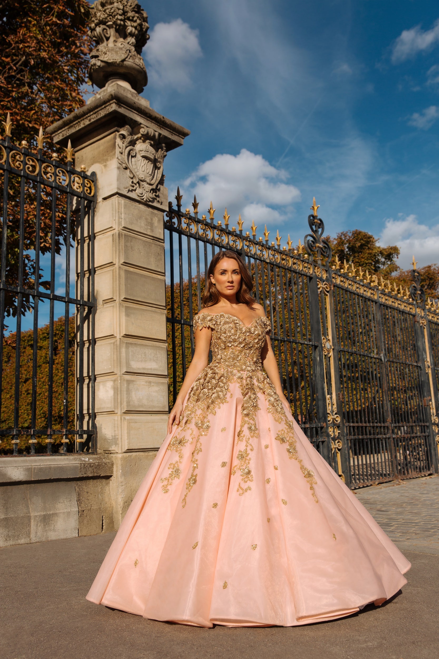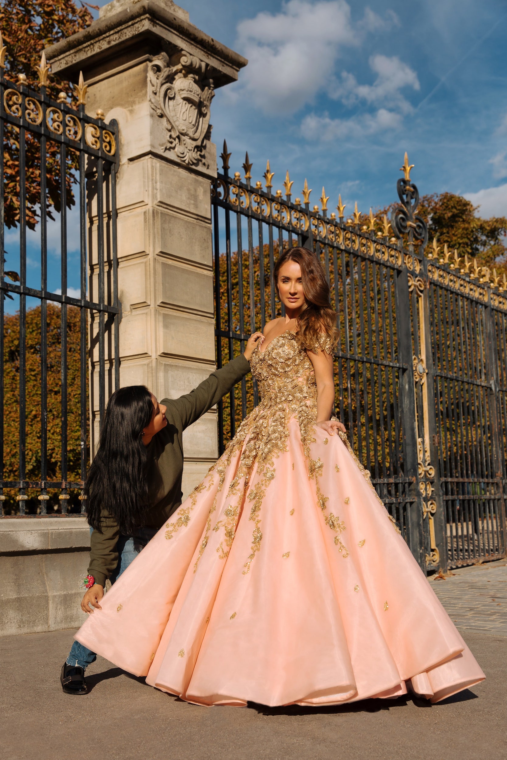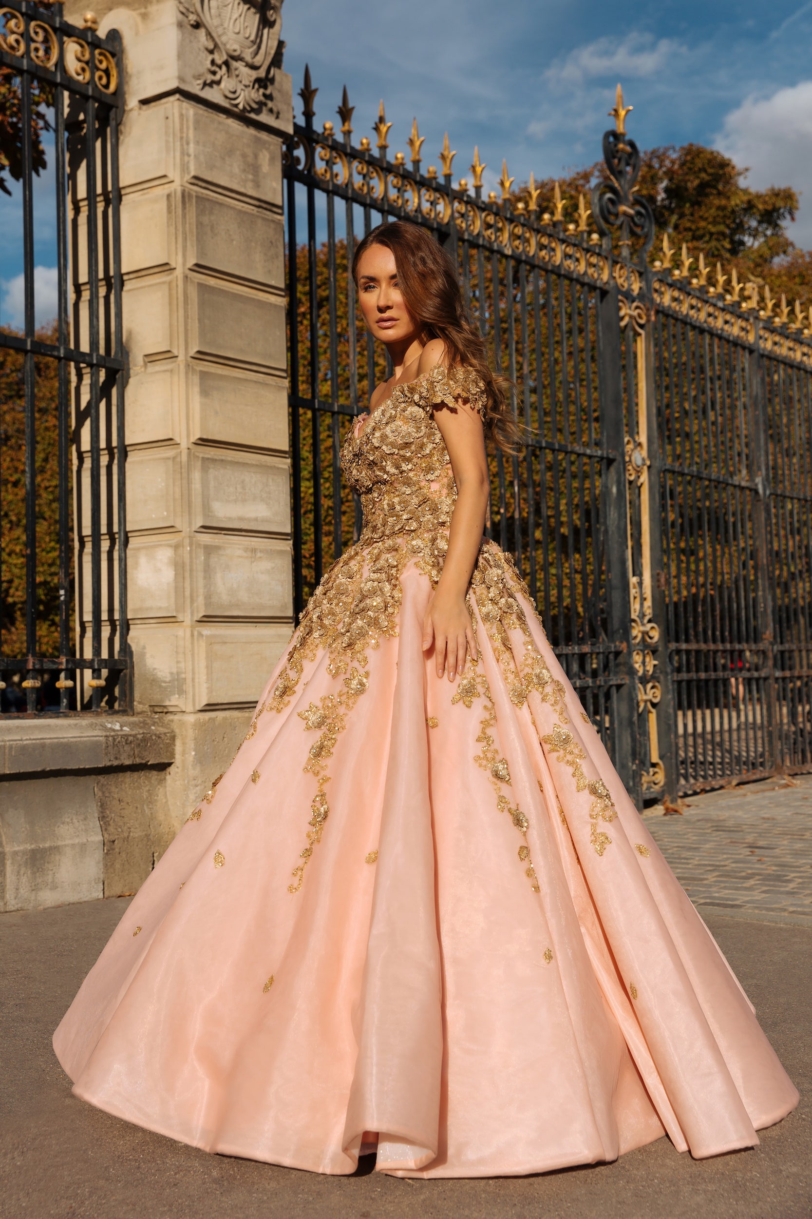 3D Gold Flower embroidered lace with hand sewn crystals ball gown. Corset back to give you the perfect shape. Blush skirt with beautiful deep pleats to give you the perfect ball gown all night. Jacquie design is custom and can be made in any color.