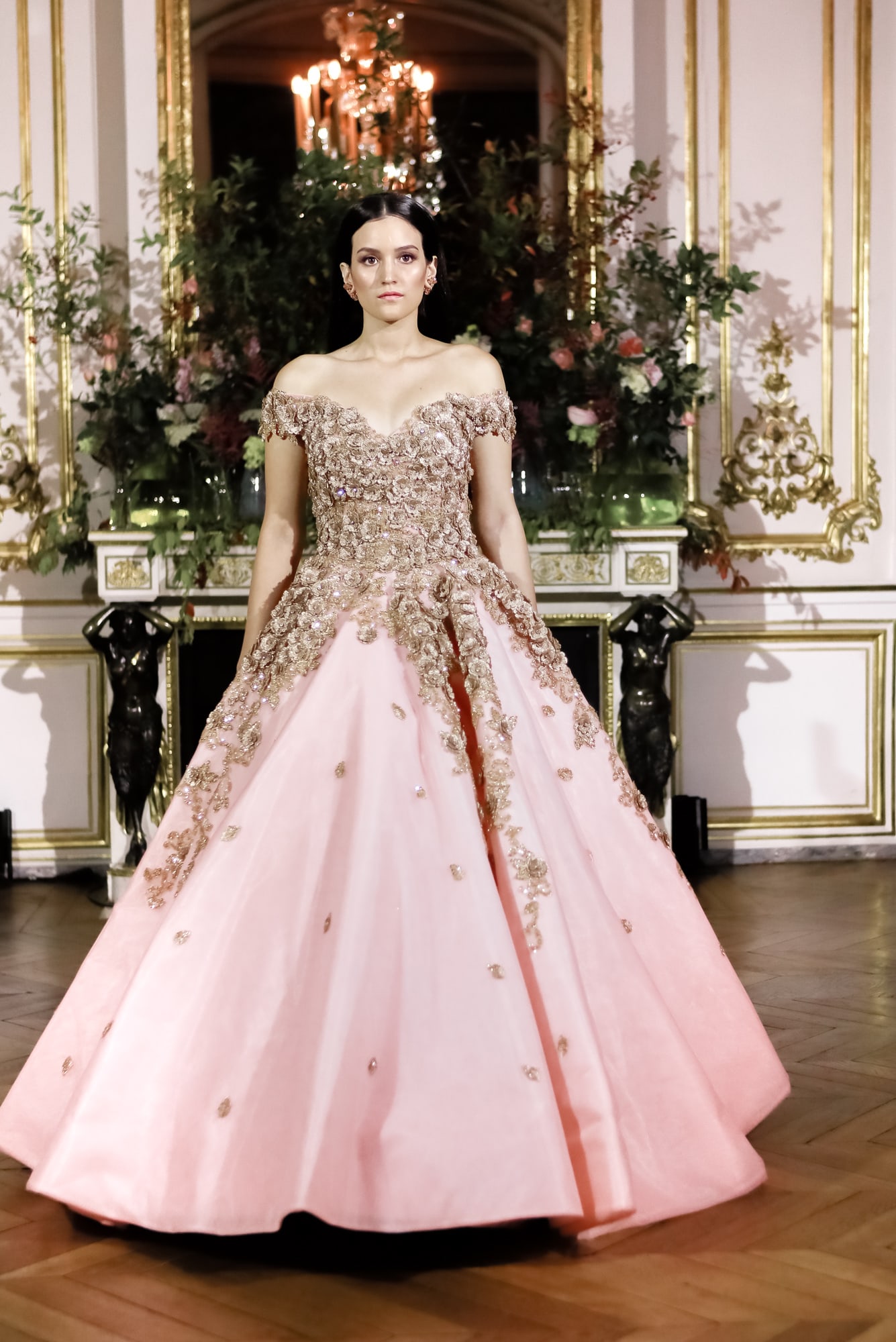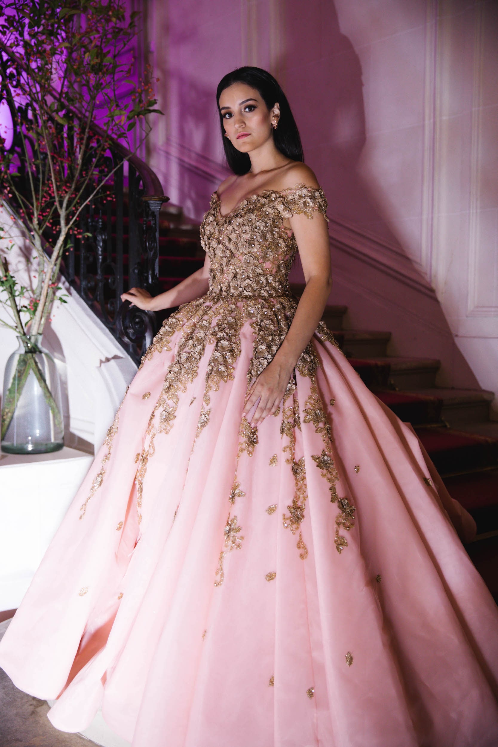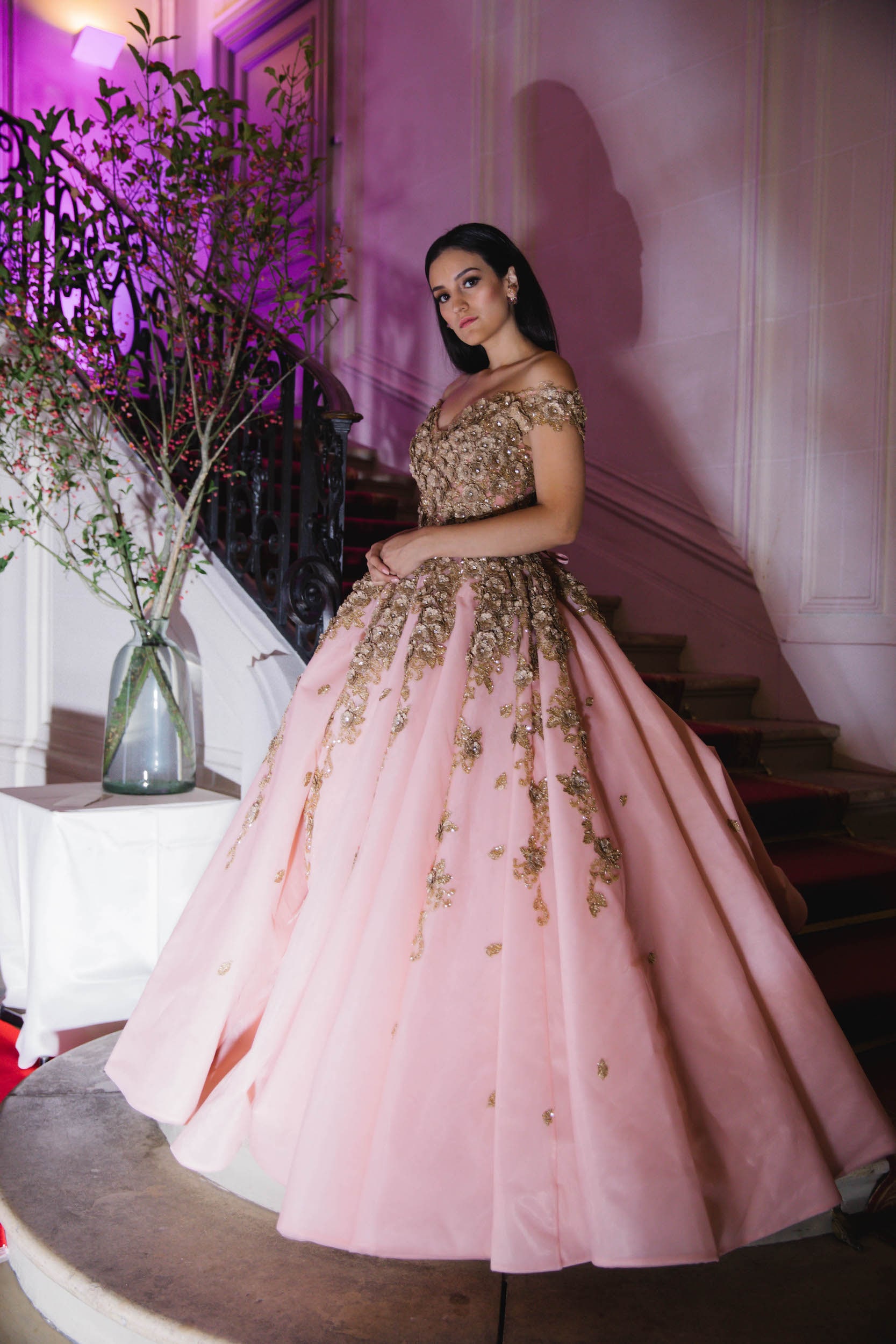3D Gold Flower embroidered lace with hand sewn crystals ball gown. Corset back to give you the perfect shape. Blush skirt with beautiful deep pleats to give you the perfect ball gown all night. Jacquie design is custom and can be made in any color.