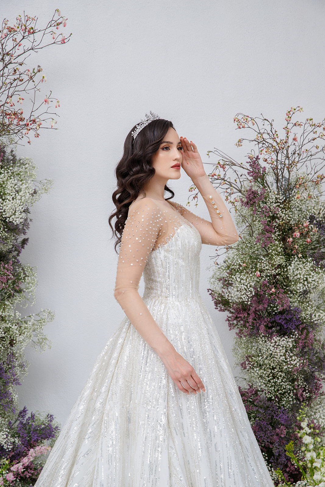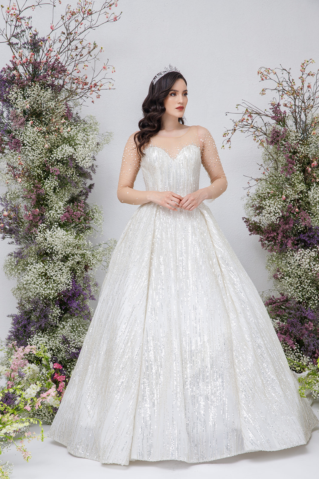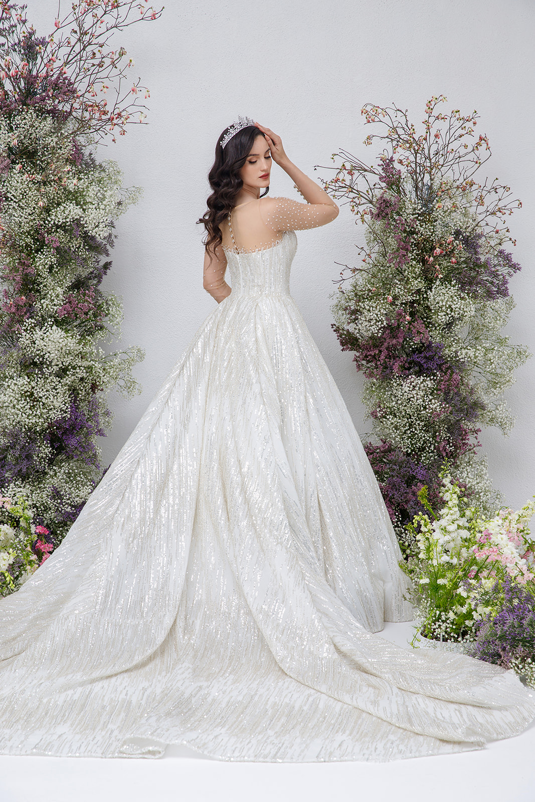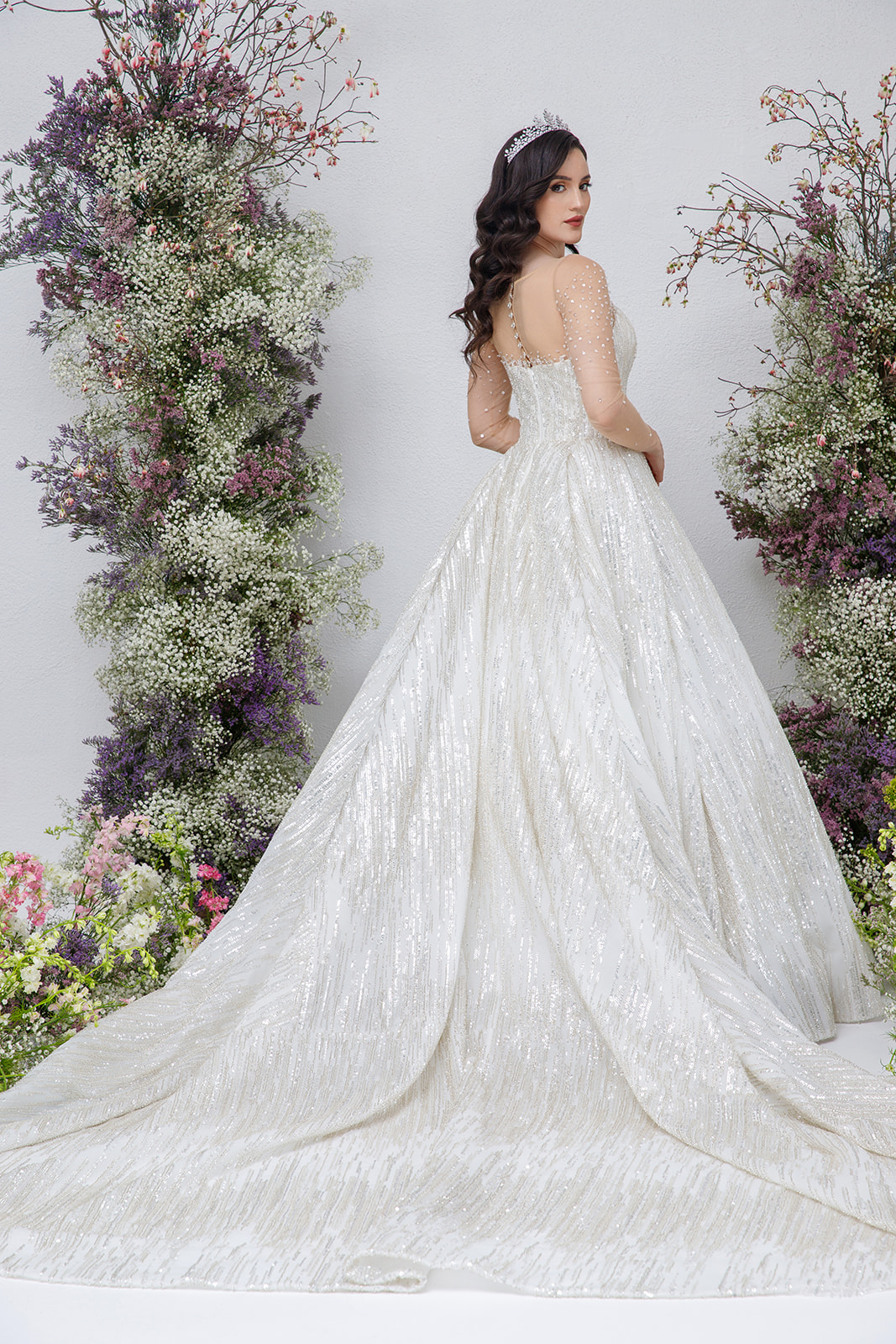 Adorn yourself in the Johana Hernández ceremony ensemble for your special day! Featuring intricate beading, crystals, and sequins, this gown promises to dazzle with its shimmering allure. Complete with nude mesh skin-tone sleeves embellished on the chest, and accentuated by crystal buttons cascading down the back, this gown boasts an extra-long train for an added touch of glamour.