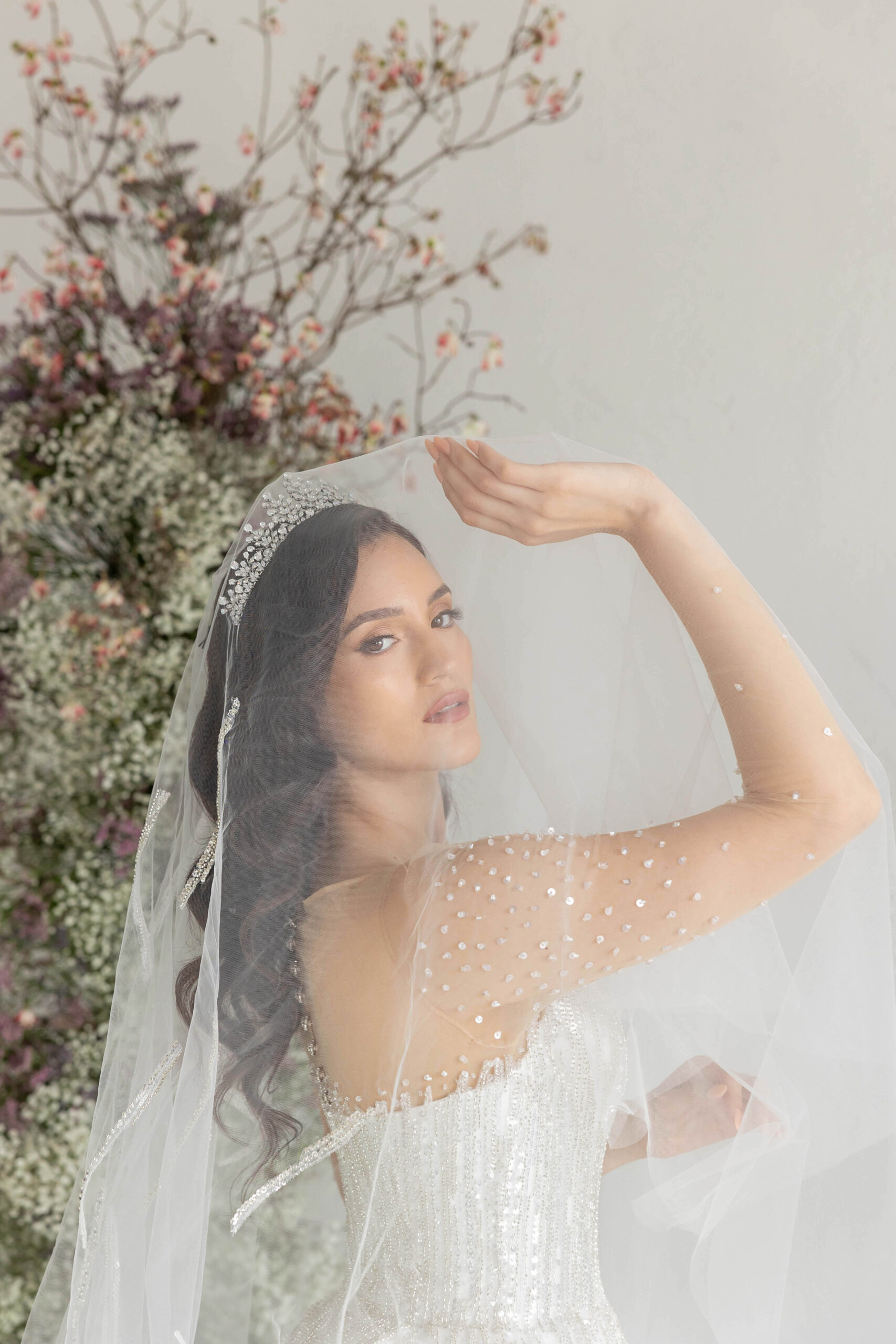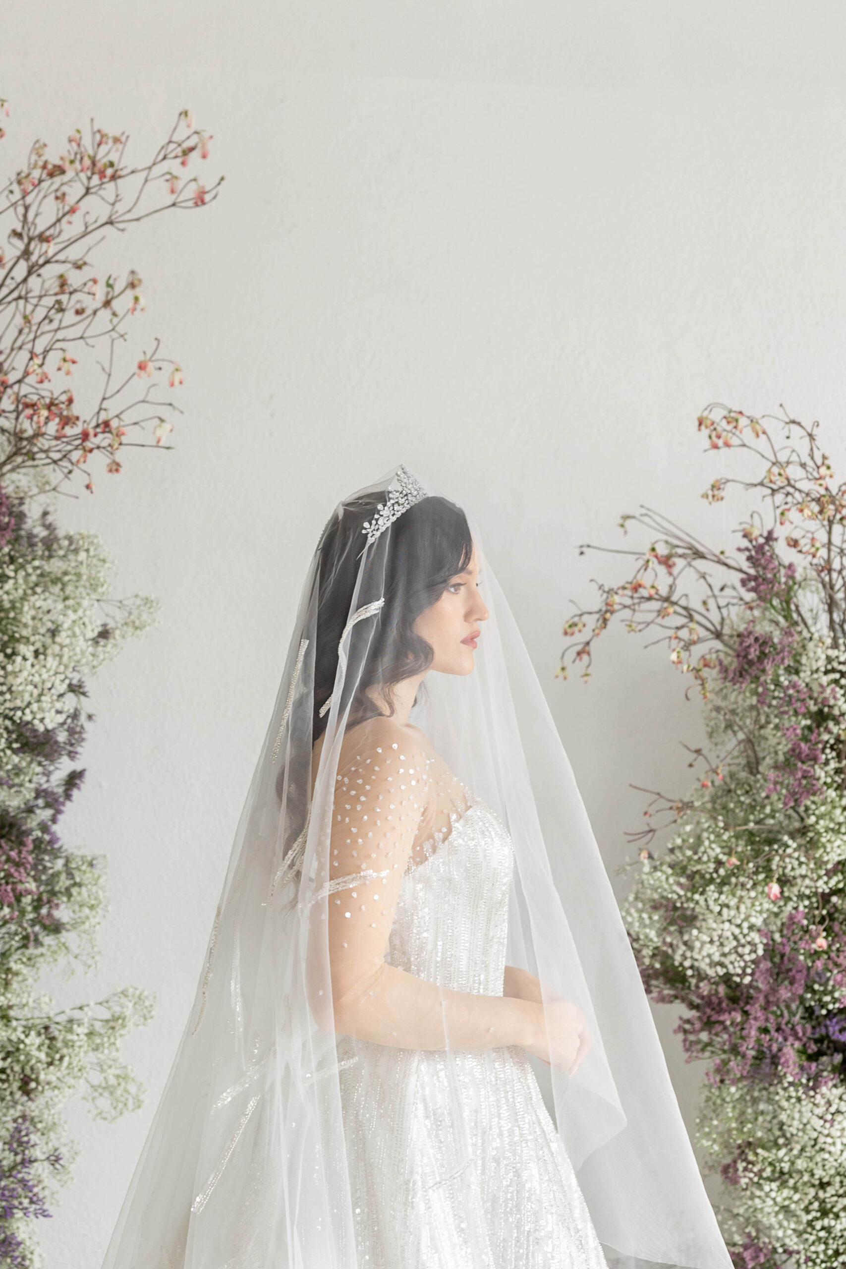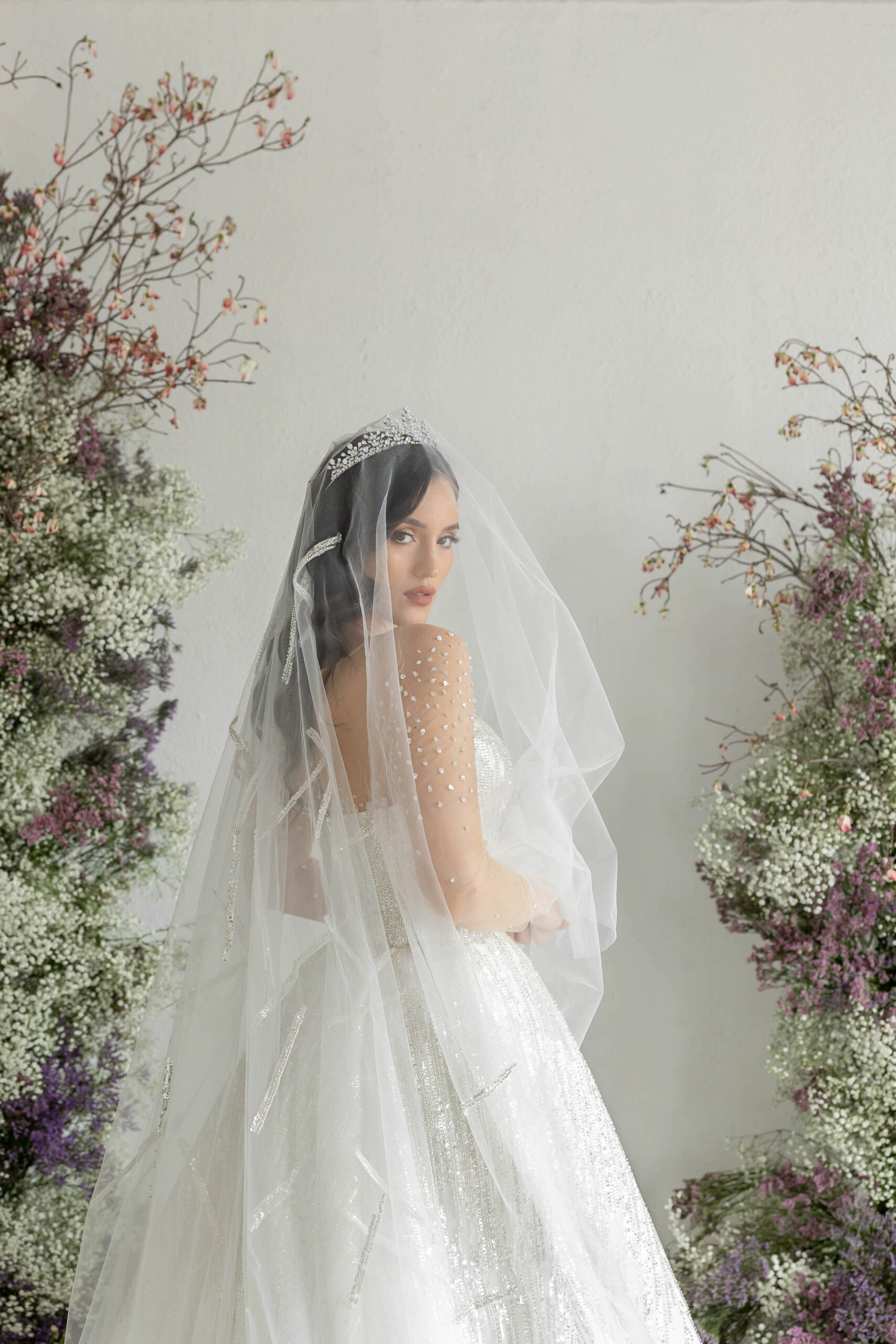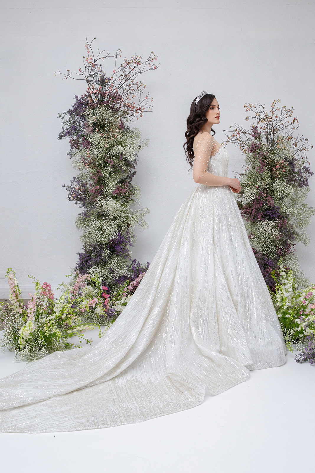Adorn yourself in the Johana Hernández ceremony ensemble for your special day! Featuring intricate beading, crystals, and sequins, this gown promises to dazzle with its shimmering allure. Complete with nude mesh skin-tone sleeves embellished on the chest, and accentuated by crystal buttons cascading down the back, this gown boasts an extra-long train for an added touch of glamour.