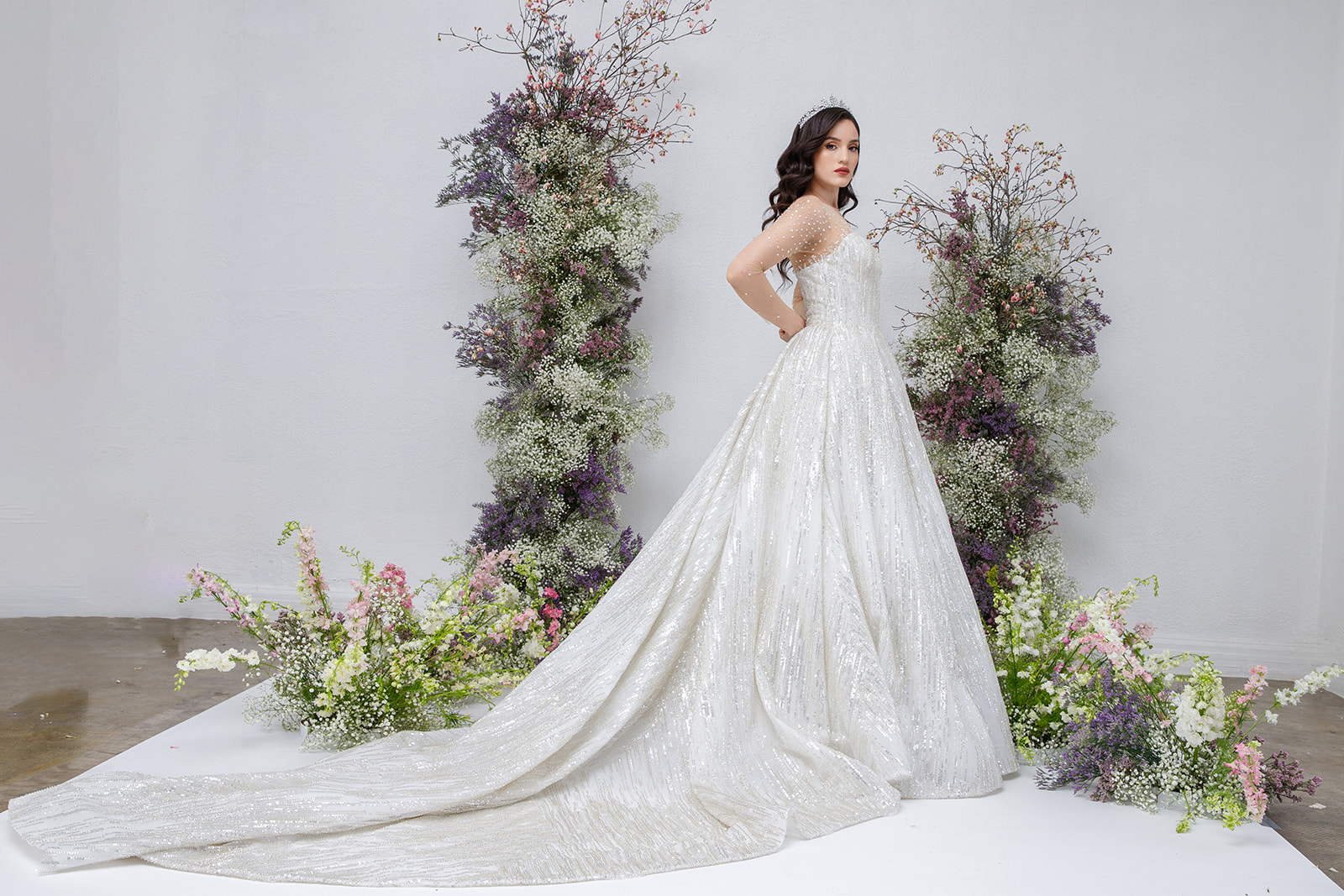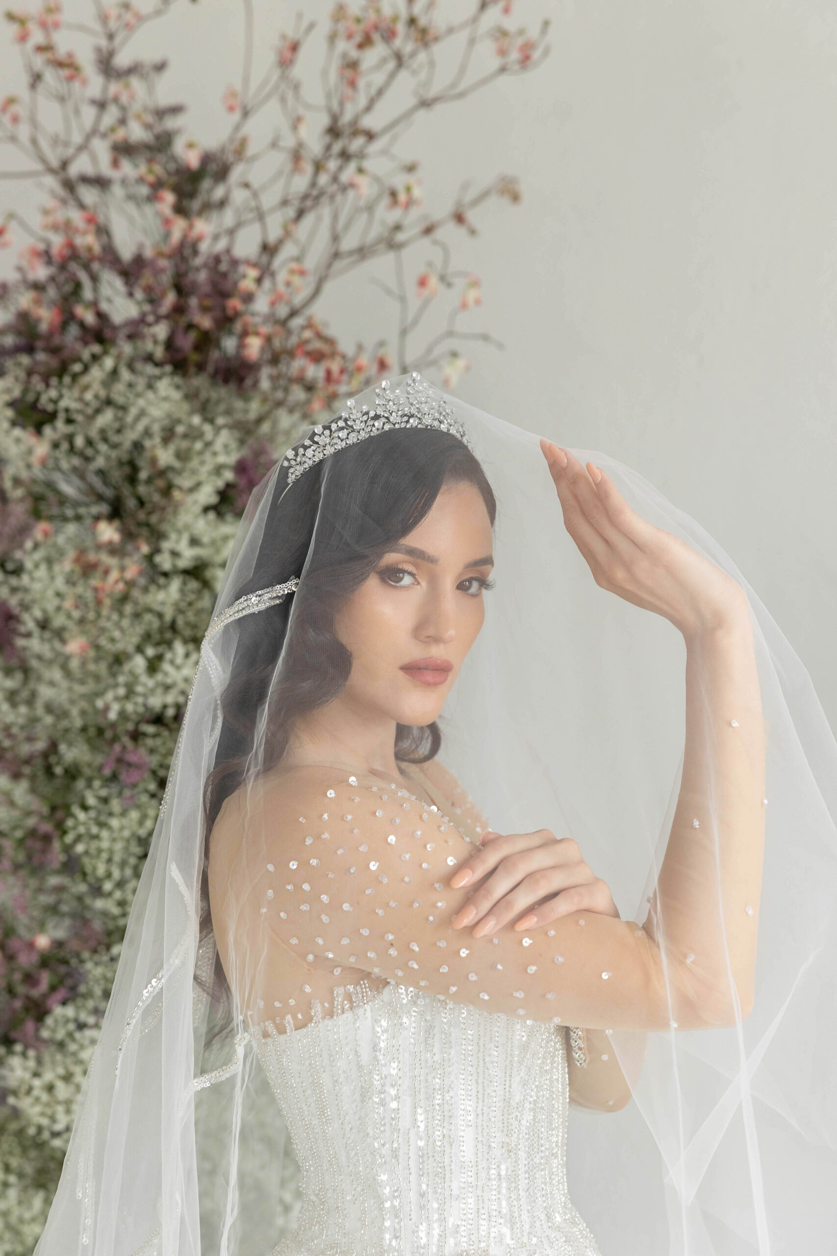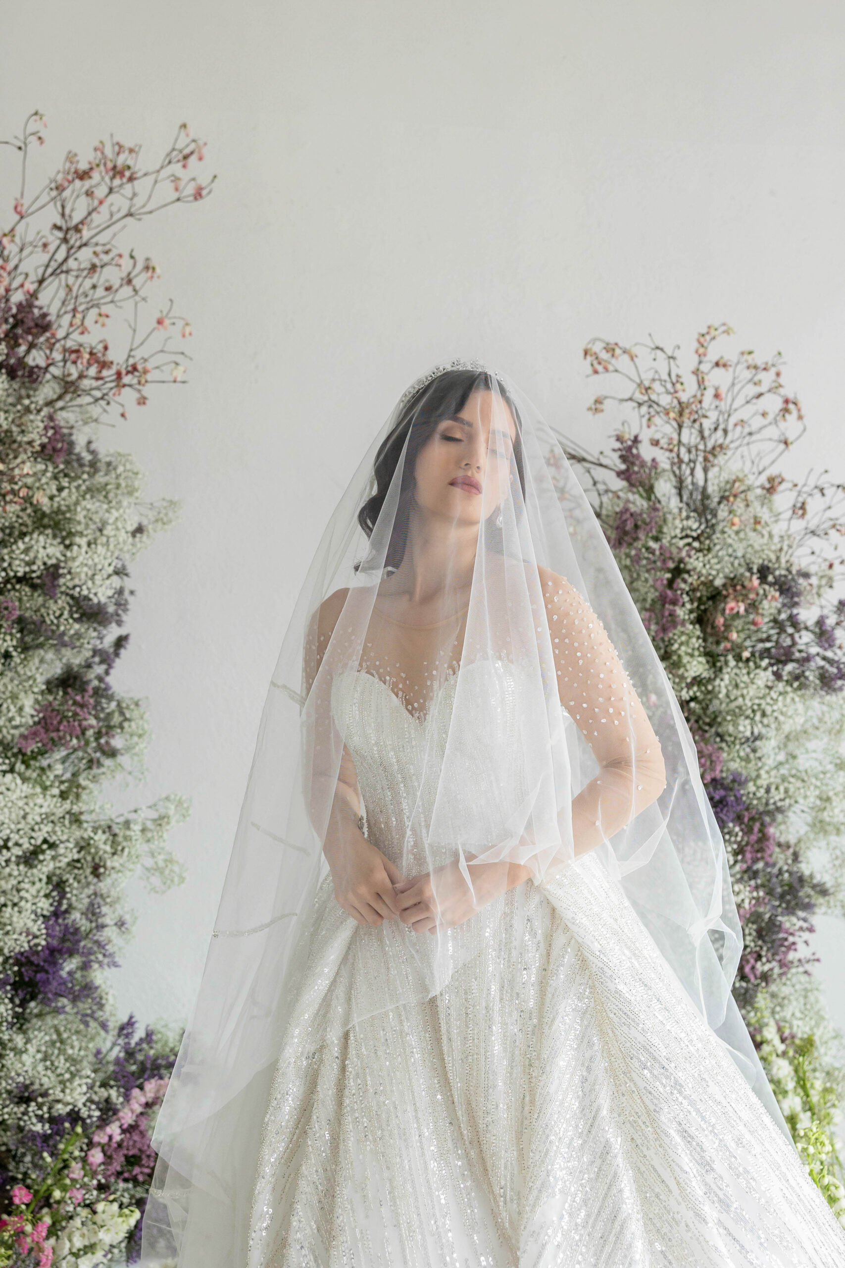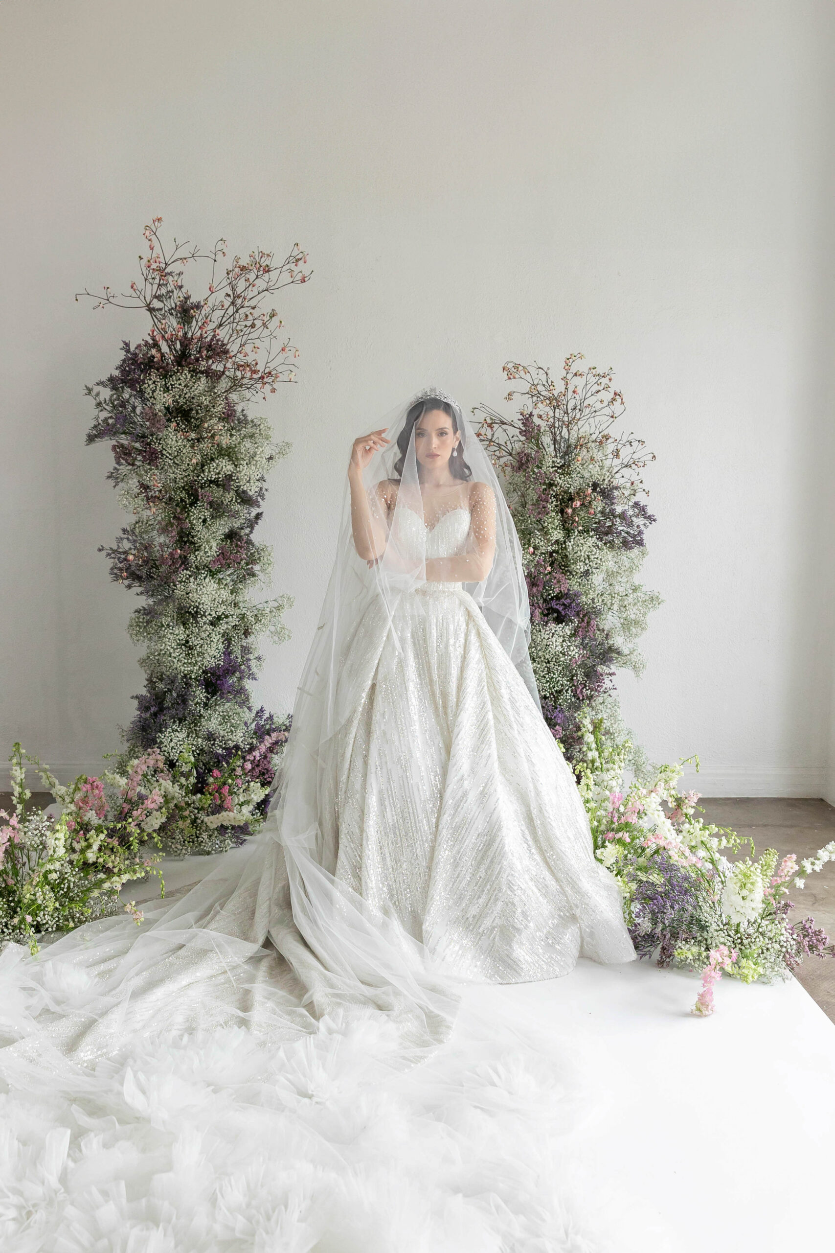 Adorn yourself in the Johana Hernández ceremony ensemble for your special day! Featuring intricate beading, crystals, and sequins, this gown promises to dazzle with its shimmering allure. Complete with nude mesh skin-tone sleeves embellished on the chest, and accentuated by crystal buttons cascading down the back, this gown boasts an extra-long train for an added touch of glamour.