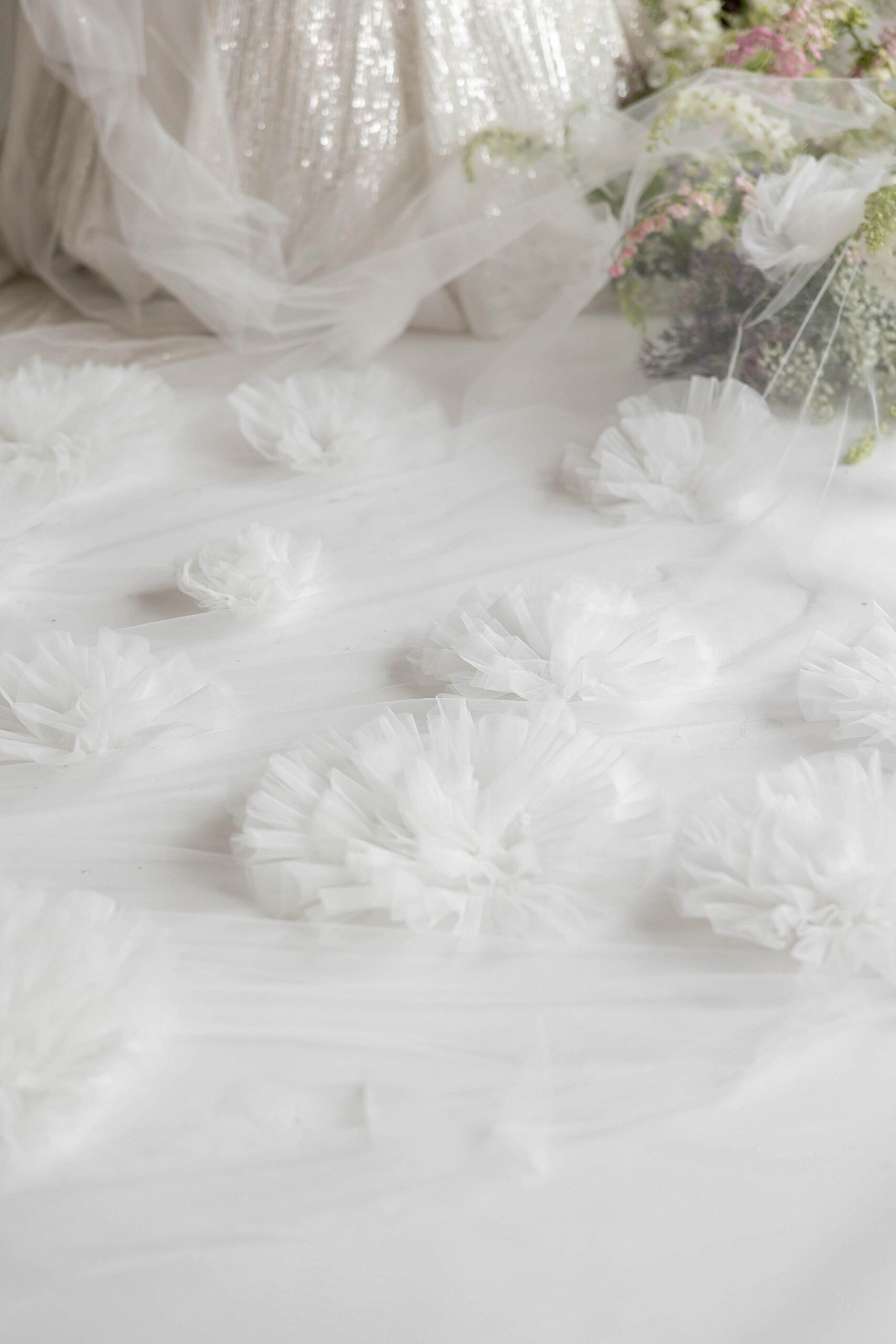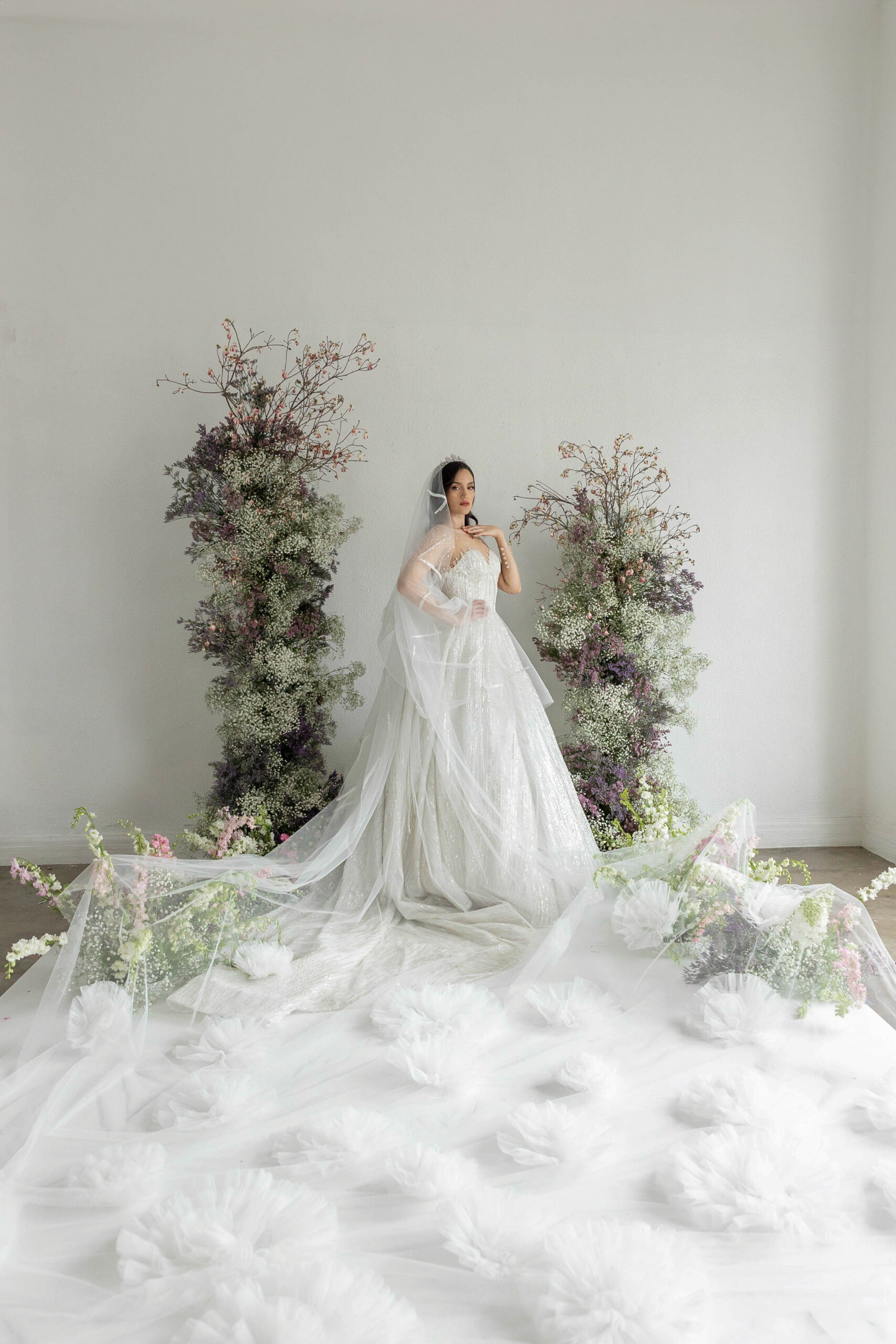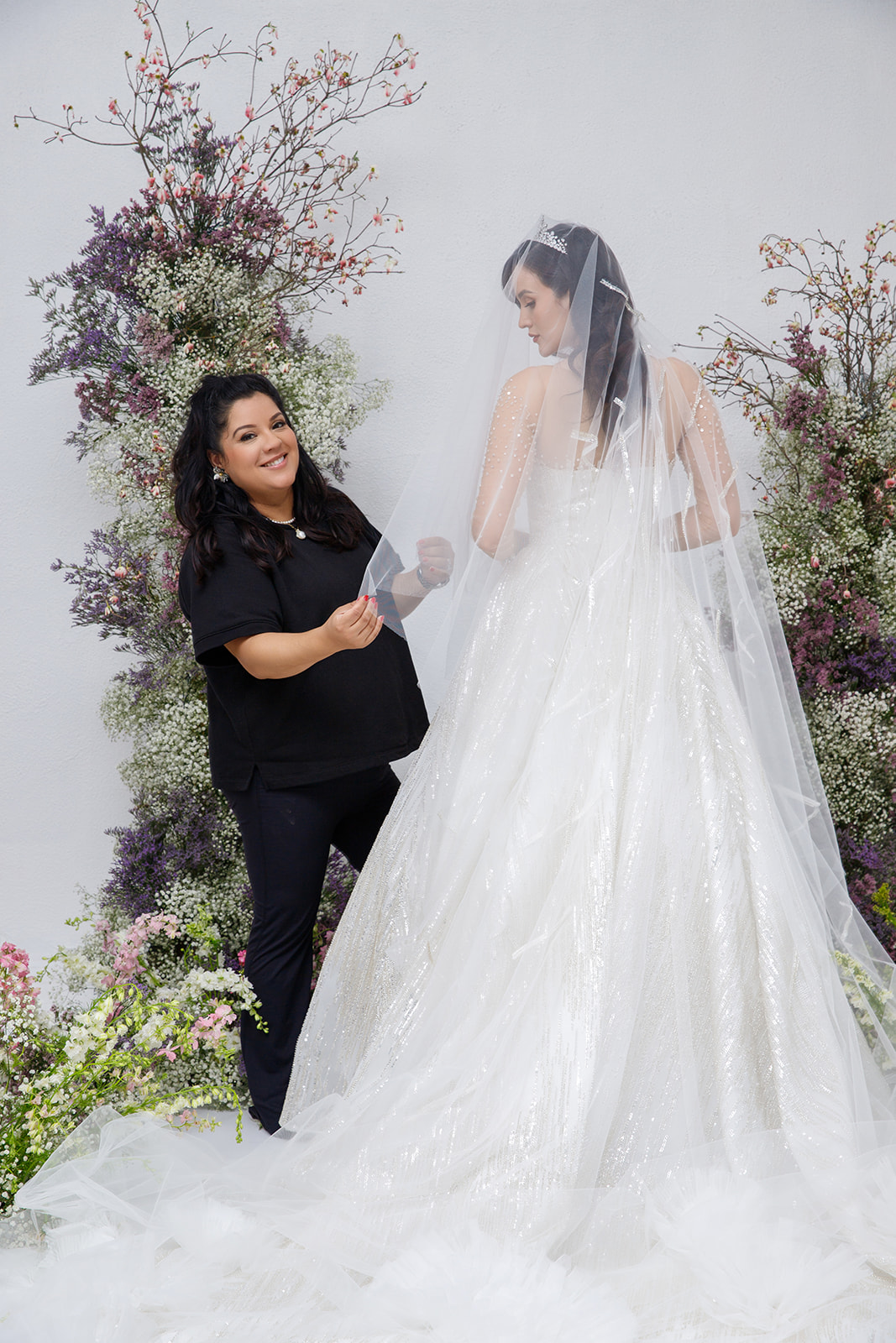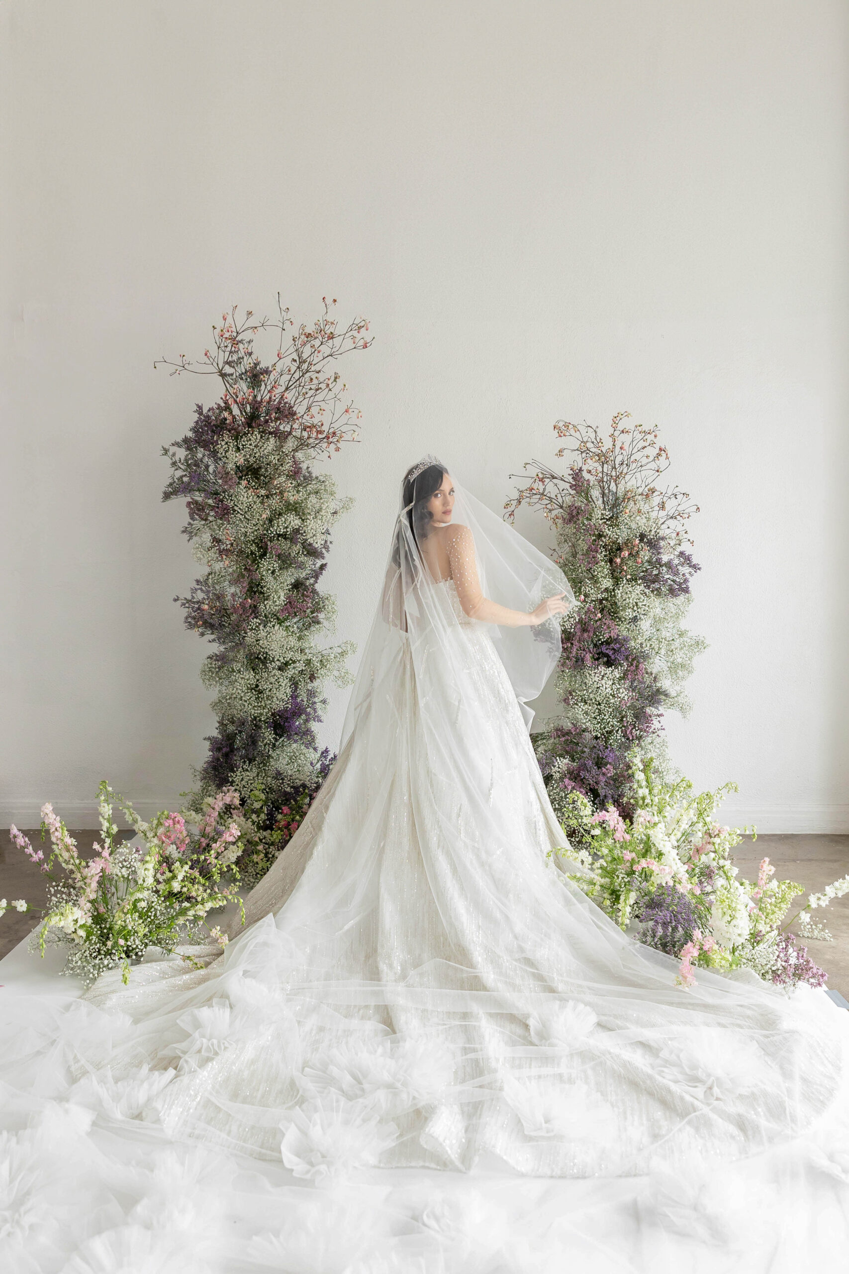 Adorn yourself in the Johana Hernández ceremony ensemble for your special day! Featuring intricate beading, crystals, and sequins, this gown promises to dazzle with its shimmering allure. Complete with nude mesh skin-tone sleeves embellished on the chest, and accentuated by crystal buttons cascading down the back, this gown boasts an extra-long train for an added touch of glamour.