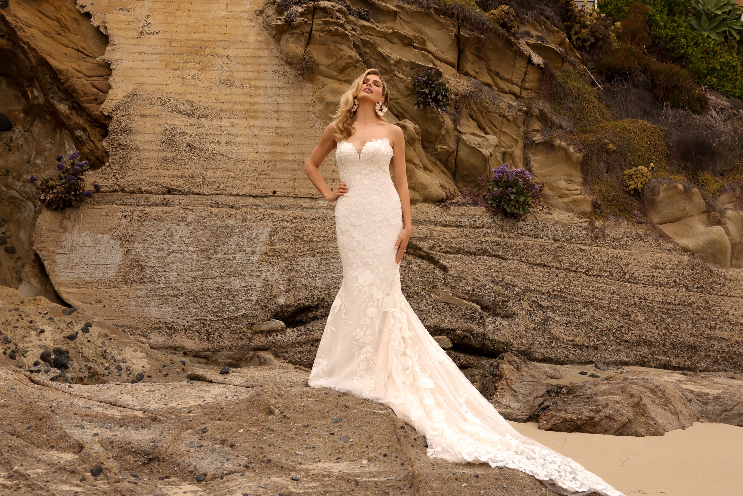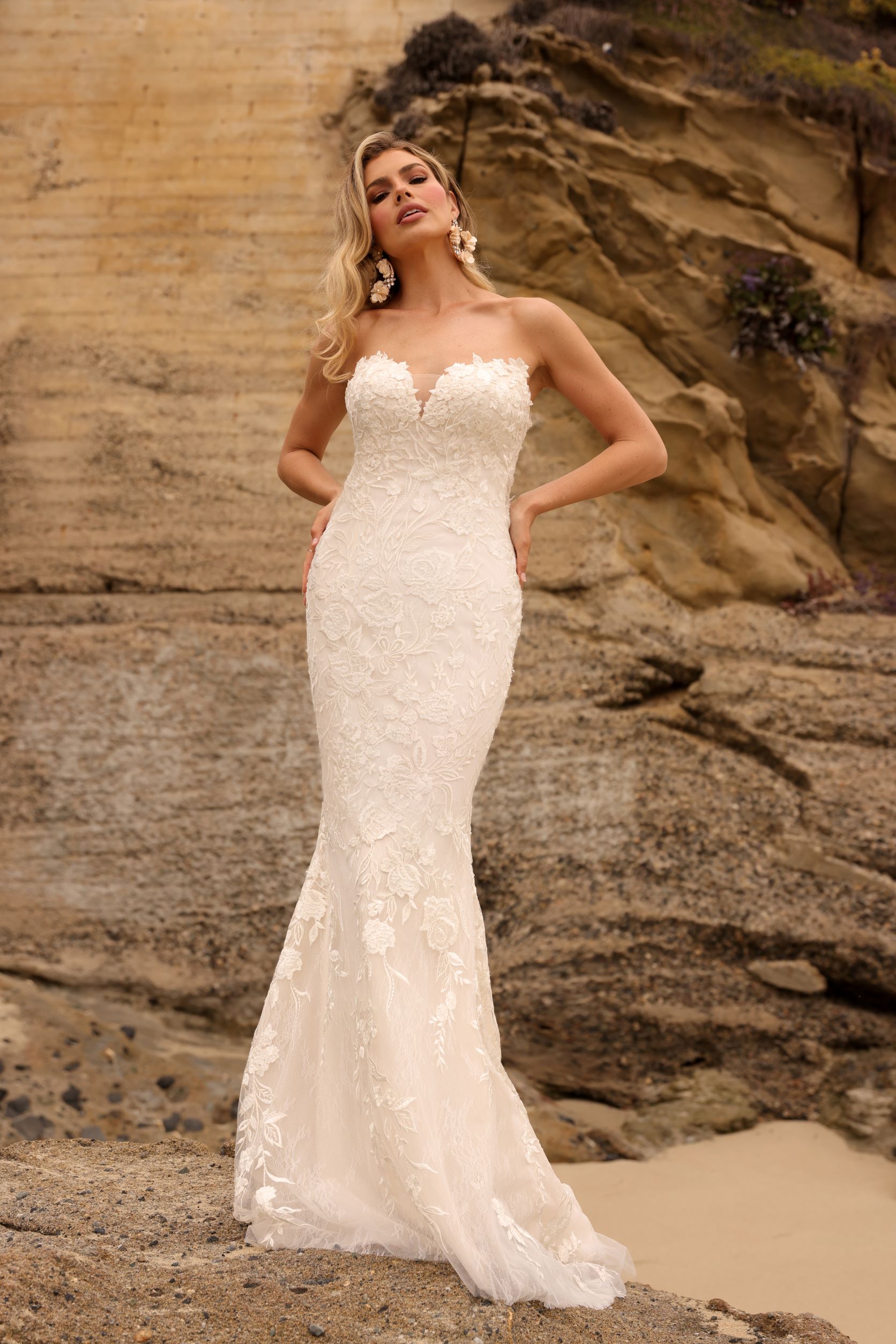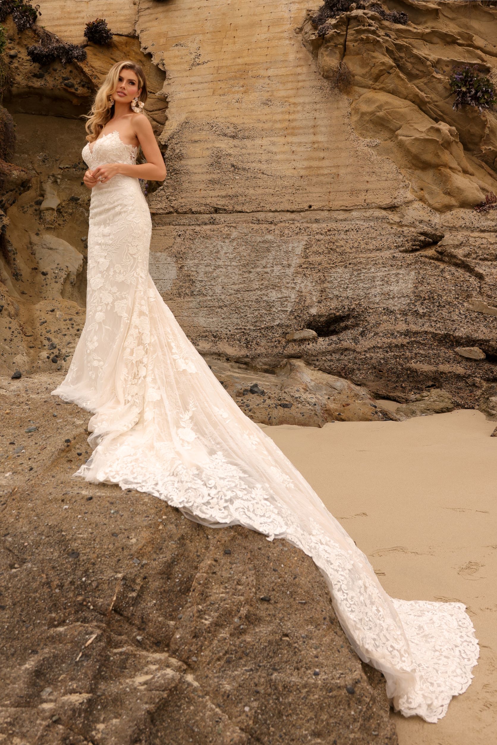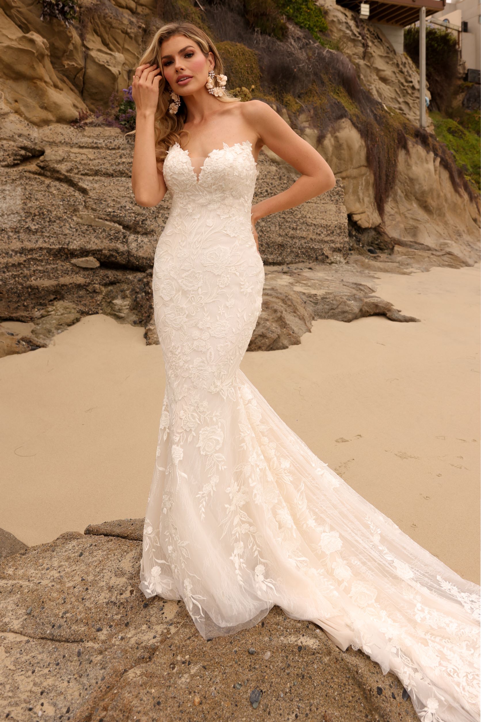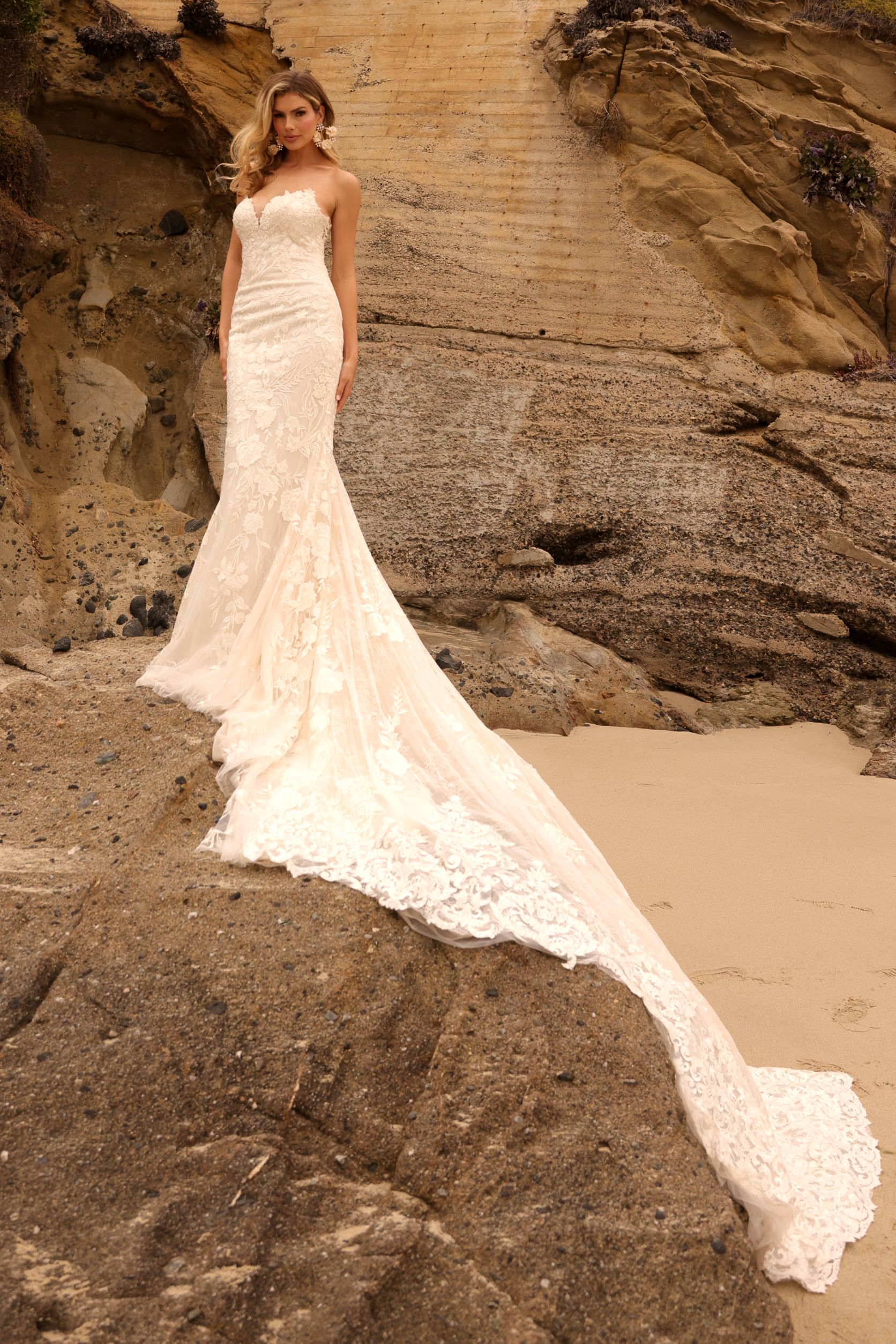 In love with our new strapless lace mermaid gown! Long beautiful train, and nude undertone! French lace and lace embellishment design! Classic but sexy for your wedding day.