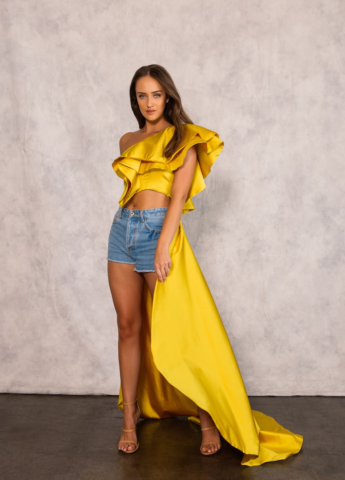 Gown Top perfect look to style with skinny jeans or shorts! off the shoulder top gives you the couture look with big ruffles adding volume to your shoulders and the back train is stunning !