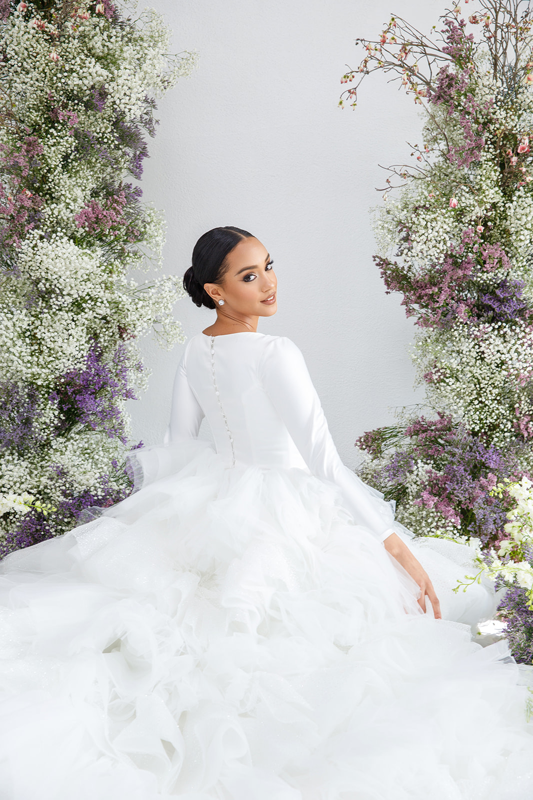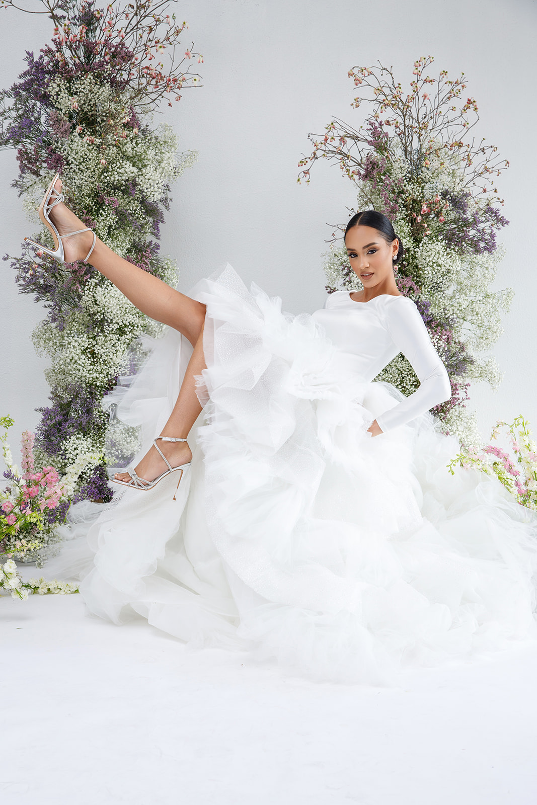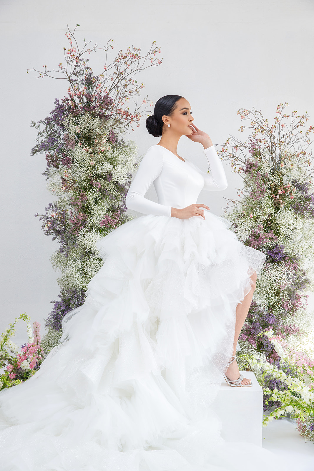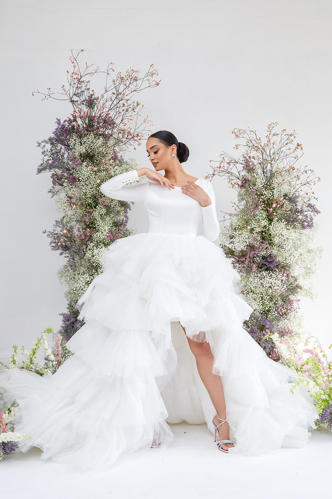 Embark on a journey of ruffled elegance with our layered high-low gown, now embellished with shimmering details. As seen in Designer Johana Hernández's wedding reception look, this ensemble combines the allure of bridal satin with long sleeves for a truly unforgettable look.