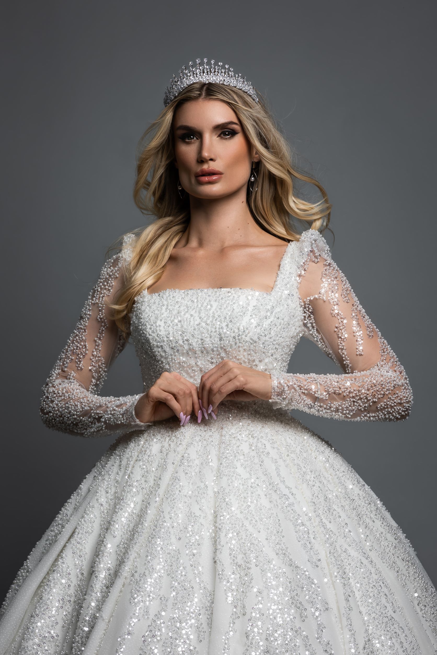 A truly dreamy ball gown featuring shimmering fabric from bodice to hem, flattering square neckline, mesh hand beaded long sleeves! Our Issa gown is made for the modern Cinderella!