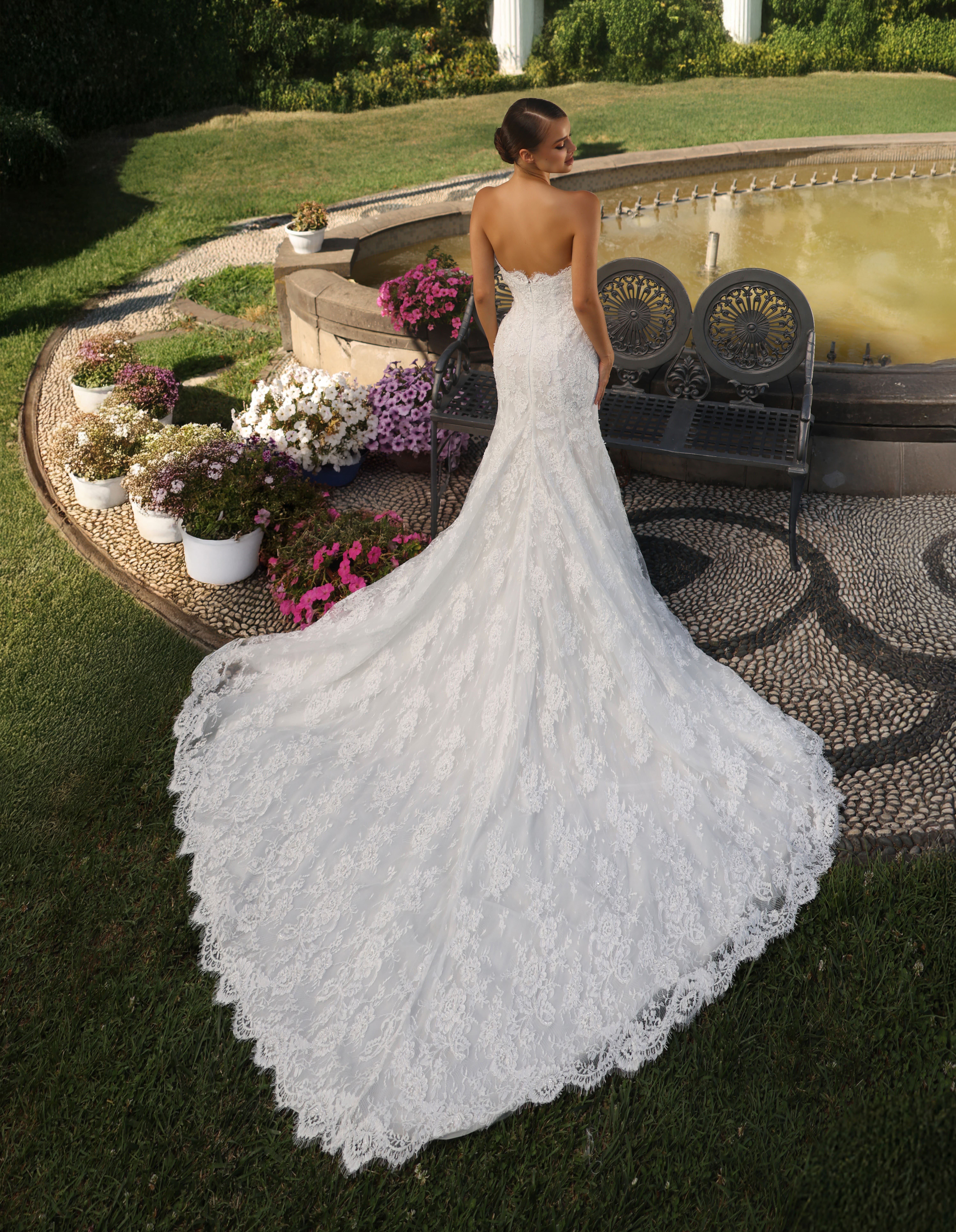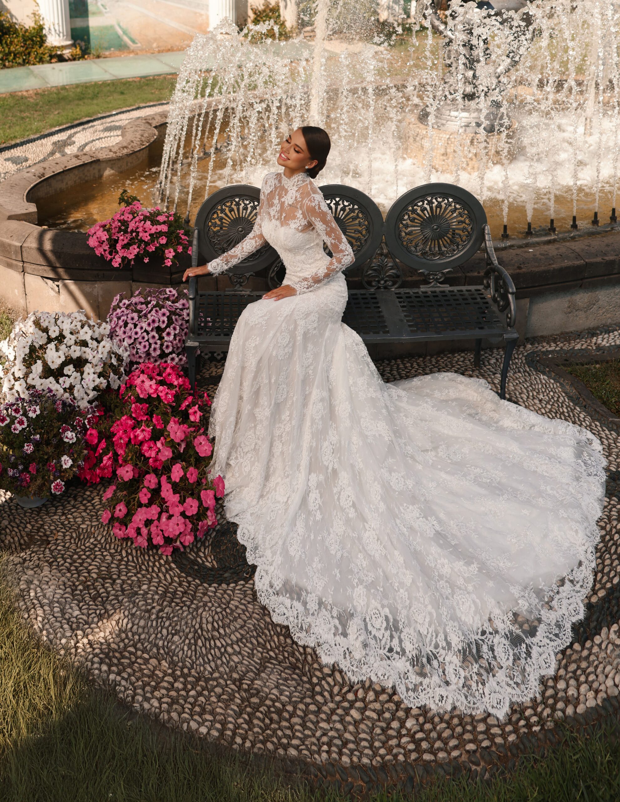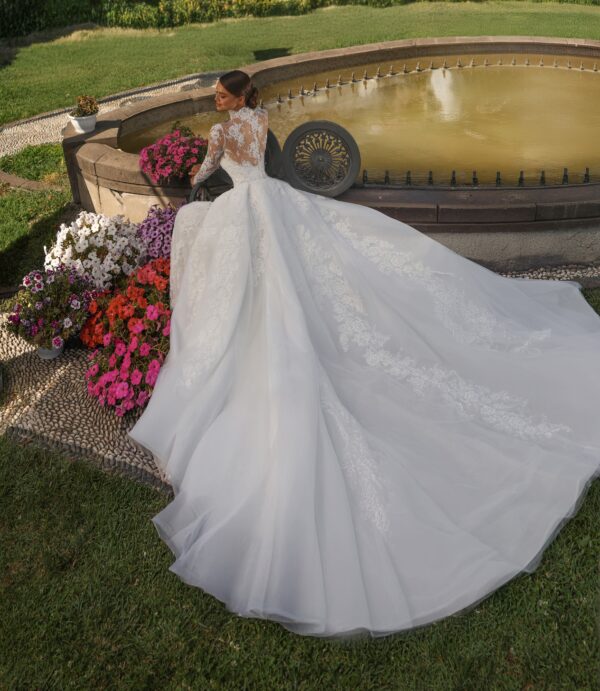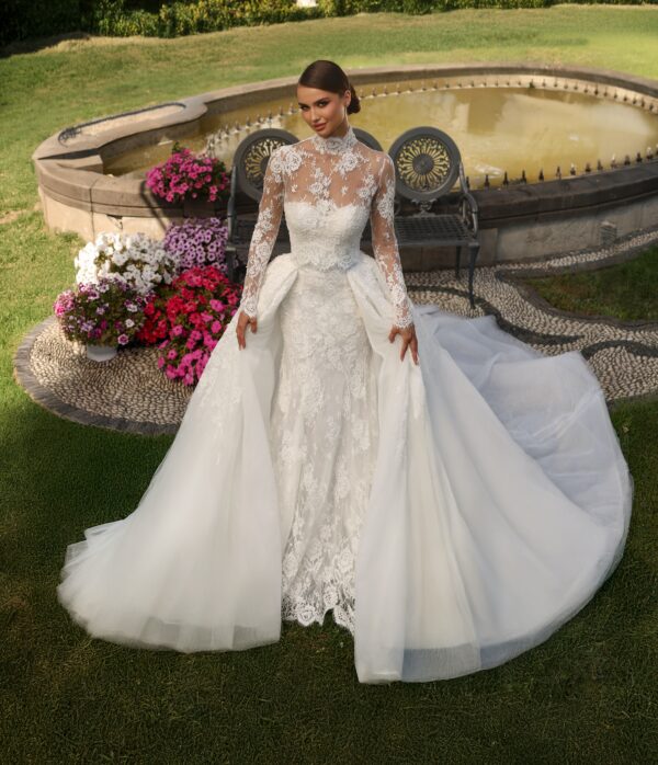 A high-neck lace wedding gown with sheer long sleeves, floral embroidery, and a voluminous overskirt with a long train.