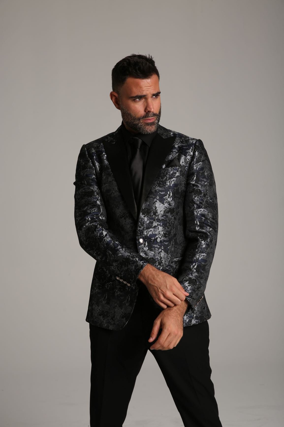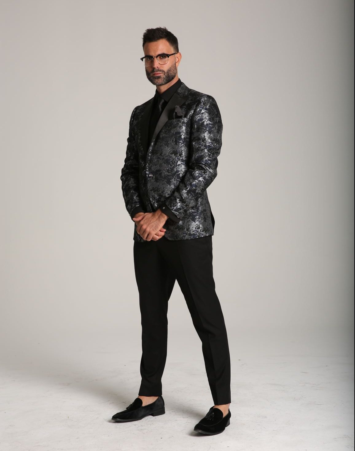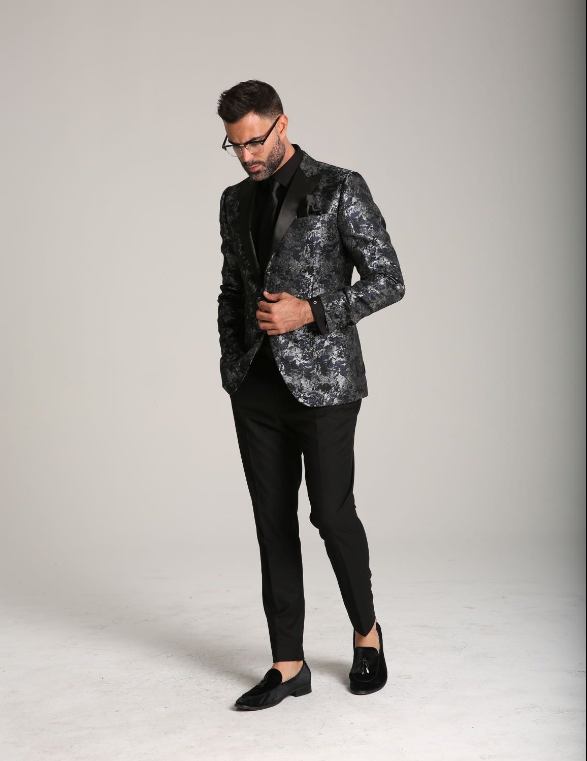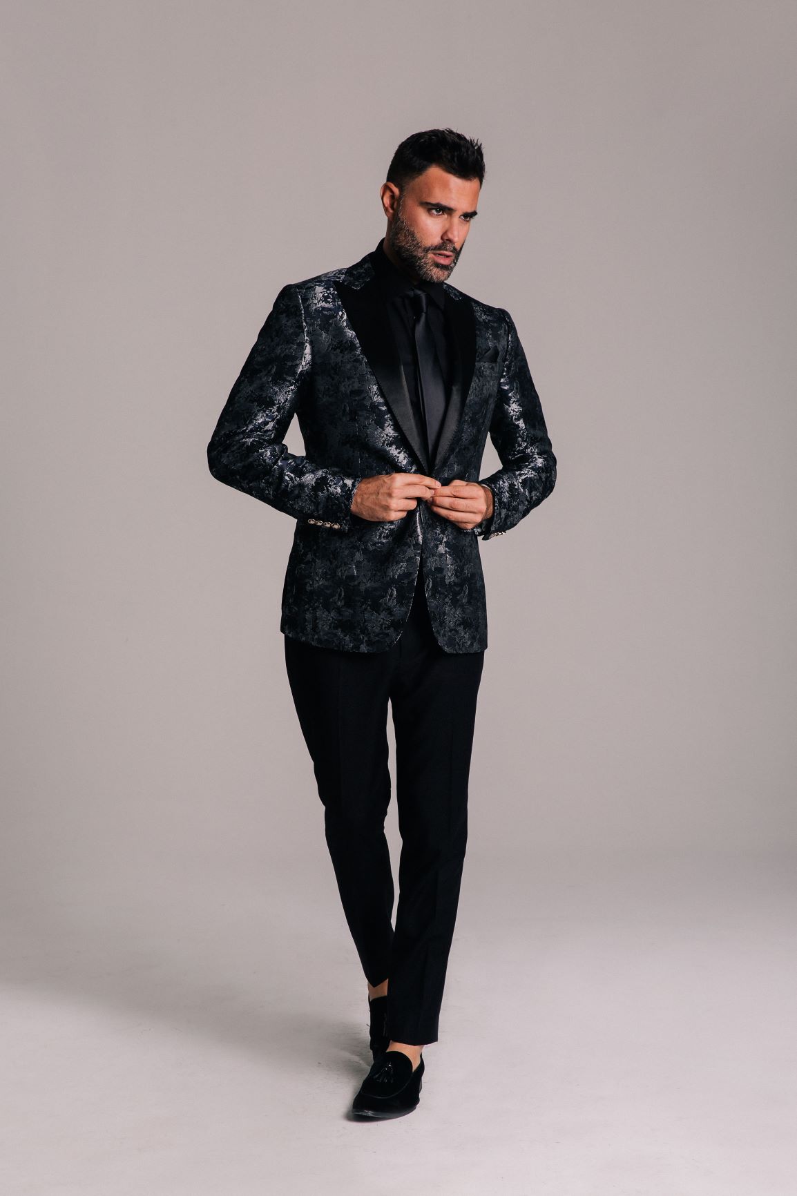Blazer in leaf Brocade. Single-button blazer. Chest and side welt pockets. Four-button cuffs. Double-vented back.