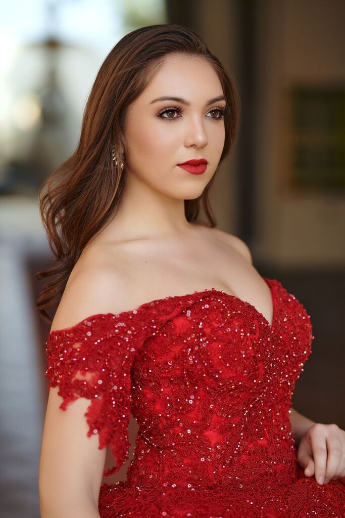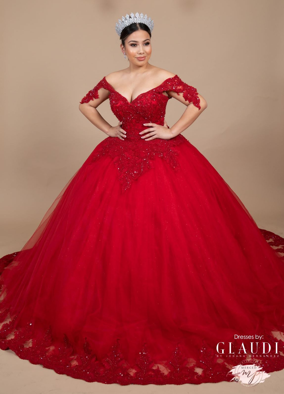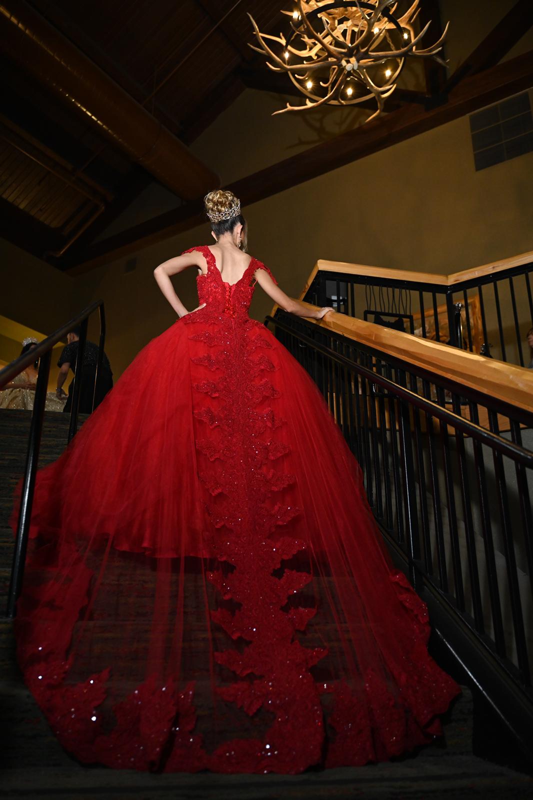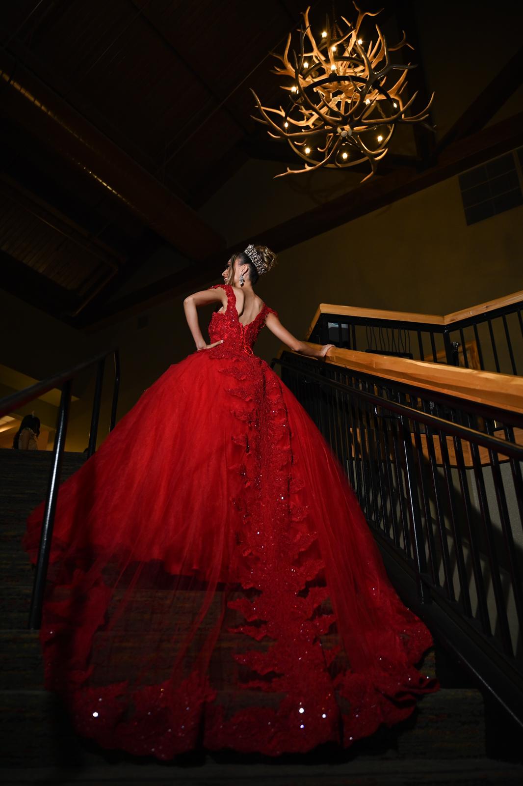 The statement piece of the night in this all hand lace beaded ballgown with built in petticoat. A tail attach to the train with lace design coming up the back and the trim. You can wear the sleeve off the shoulder or as a strap with lace design coming down. Corset back and sweetheart top covered in red beads coming down the waistline. Red sparkle tulle in the middle creating the perfect sparkle of the night.