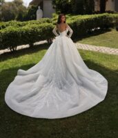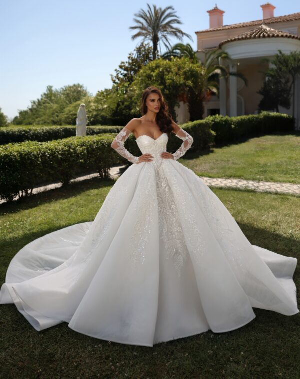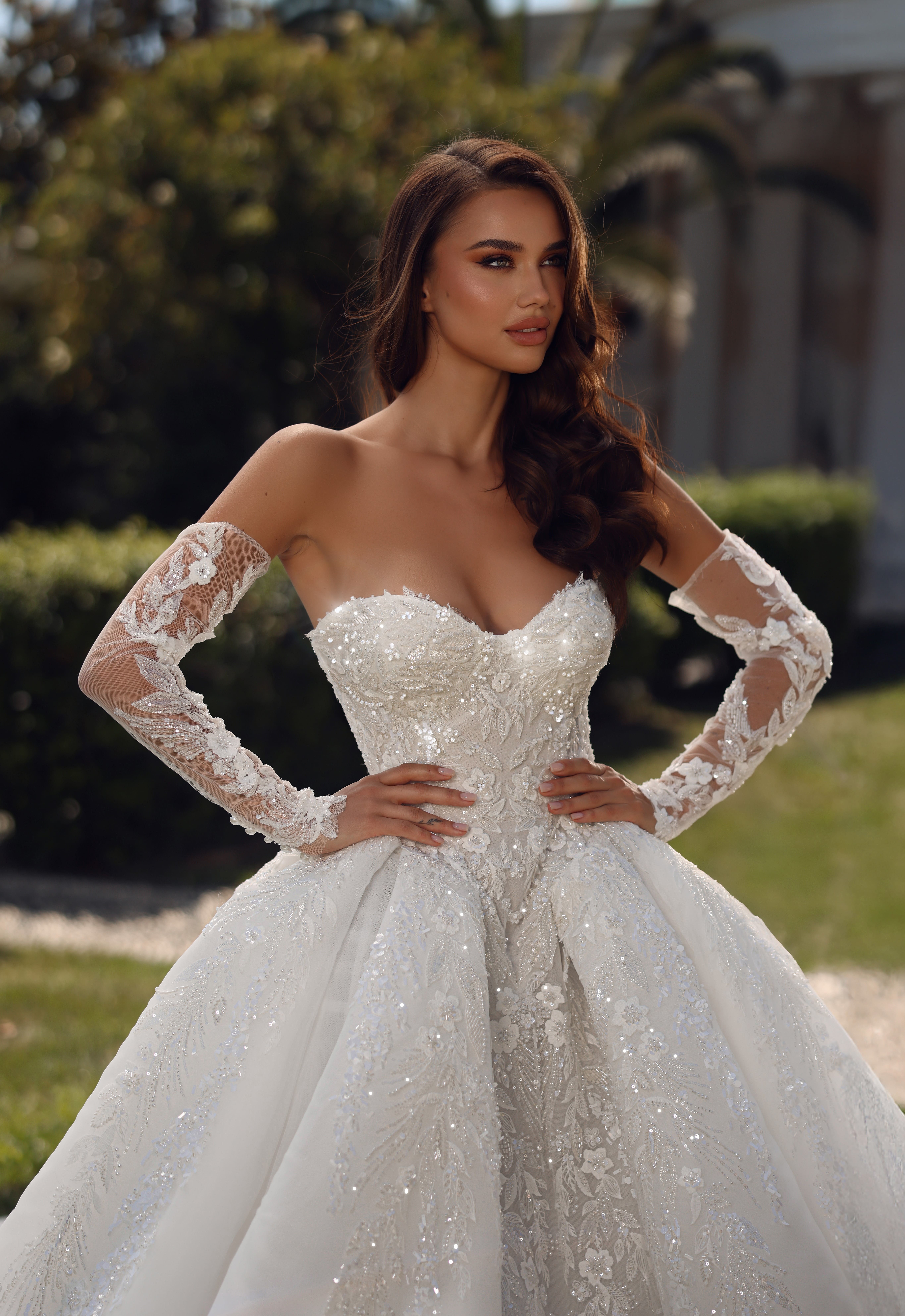 As seen on Miss Unverise Make a royal statement in this stunning ball gown wedding dress. Featuring a sweetheart neckline, intricate lace appliqués, and sparkling sequin details, it’s designed to captivate. The detachable illusion sleeves add a romantic and versatile touch. Perfect for the bride who wants elegance with a hint of glamour.