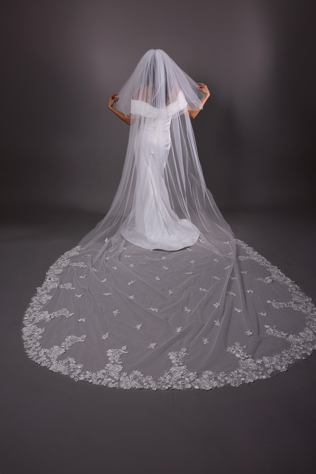 Let the whispers of a rose garden accompany your bridal journey. Our lace veil with a blusher is adorned with the beauty of roses, adding a romantic touch to your walk down the aisle.
