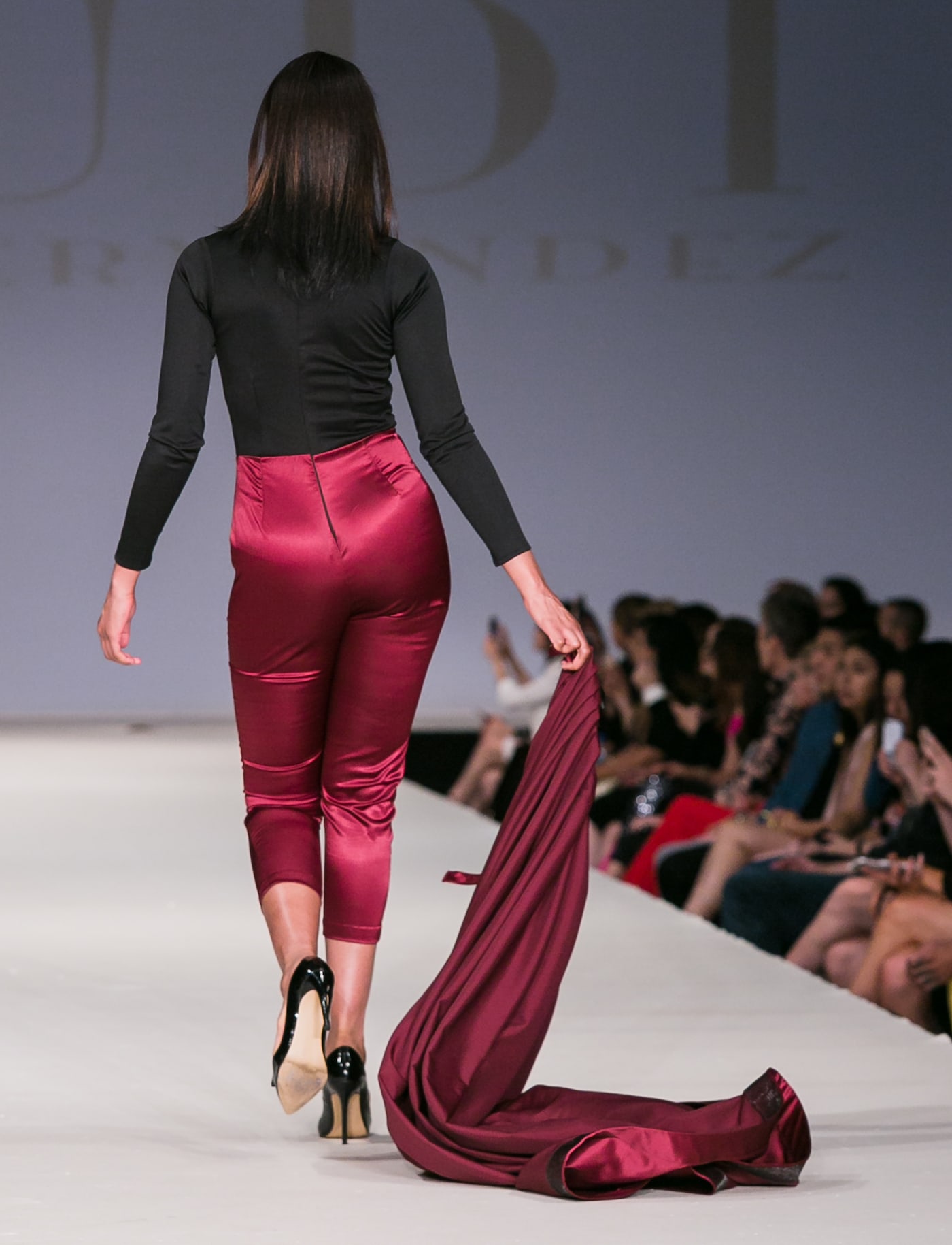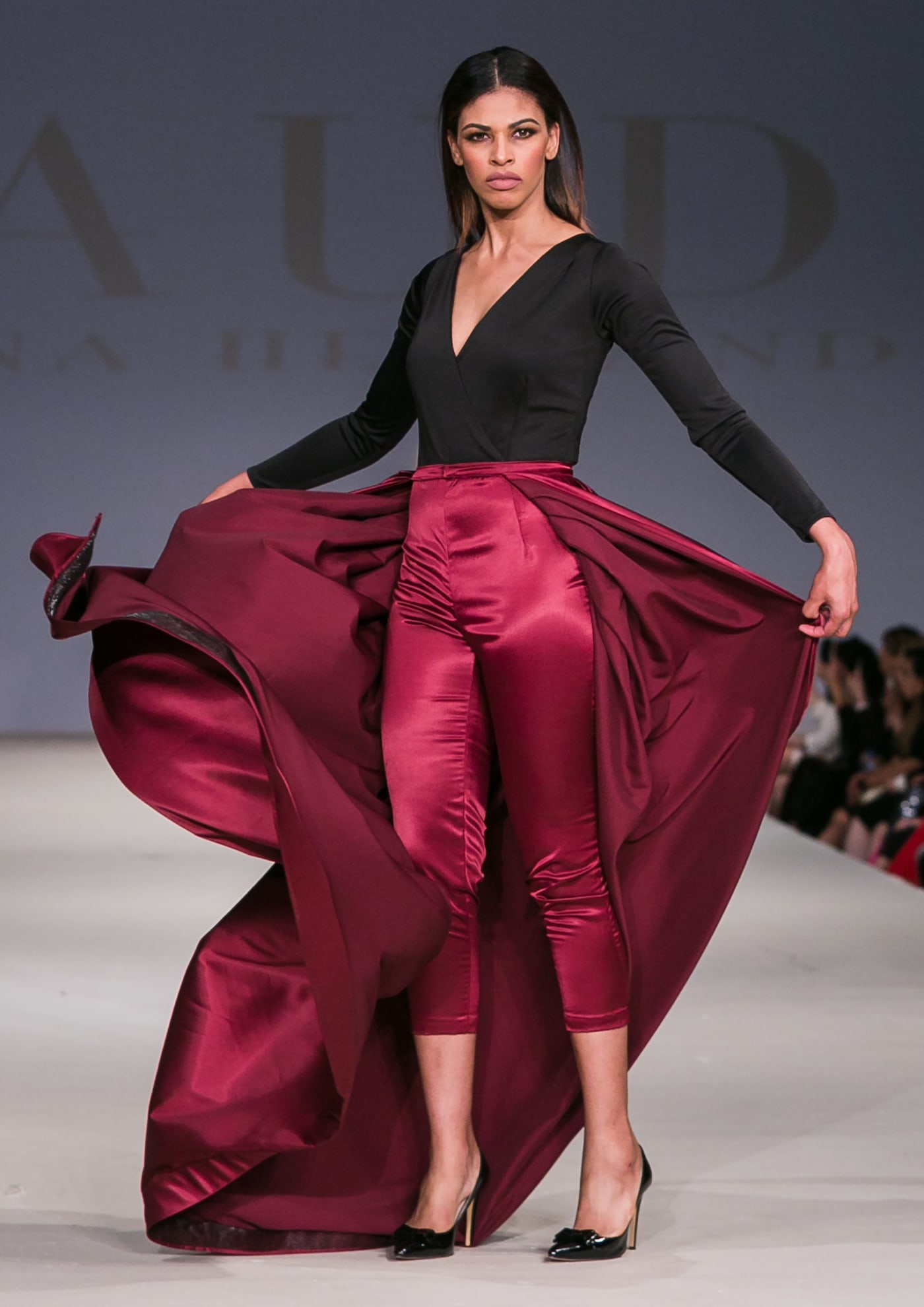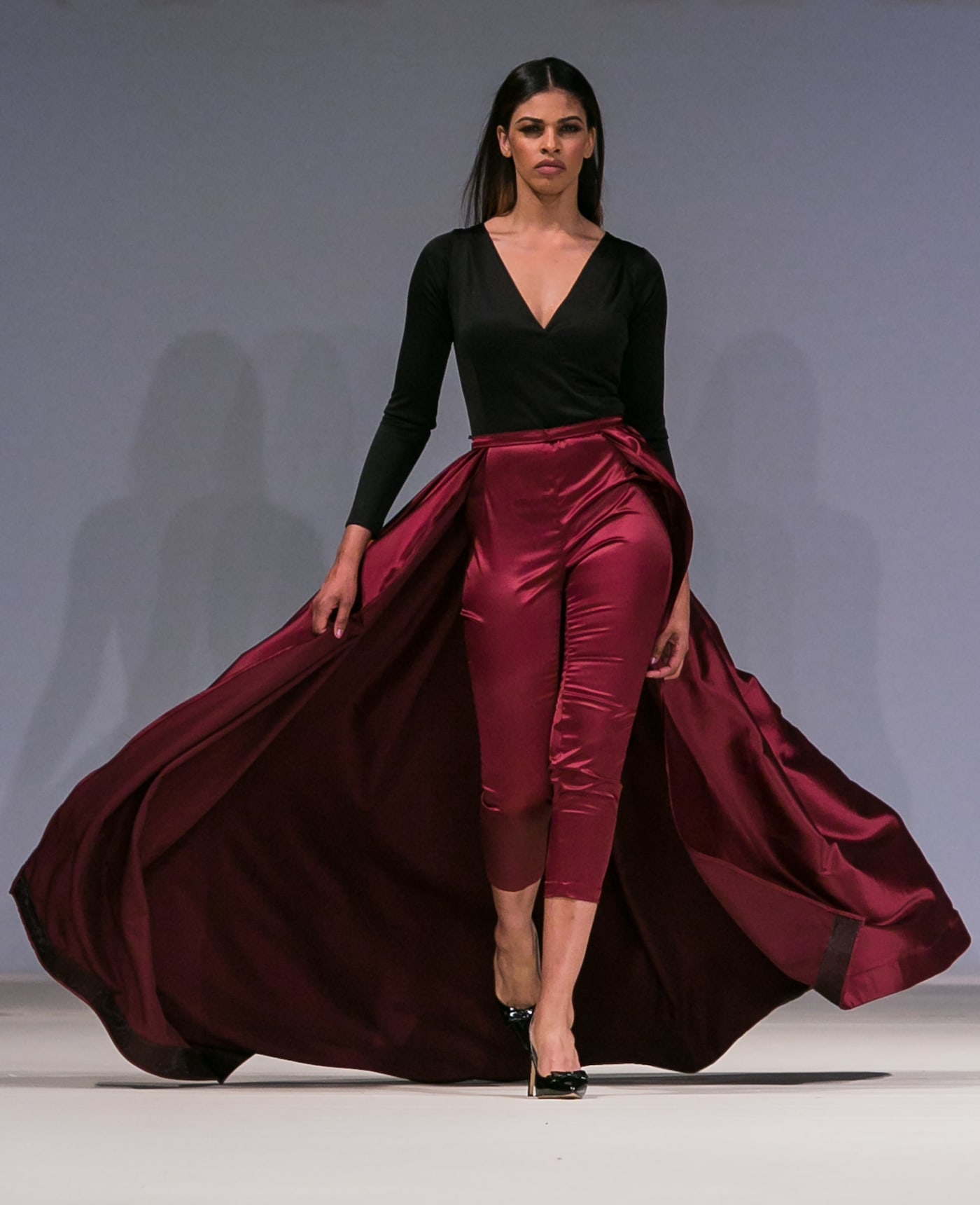 2 in 1 Jumpsuit Ball Gown- Stretch Satin pant jumpsuit ankle length with Ponti stretch knit top fabric long sleeve with snap on ball gown skirt.
