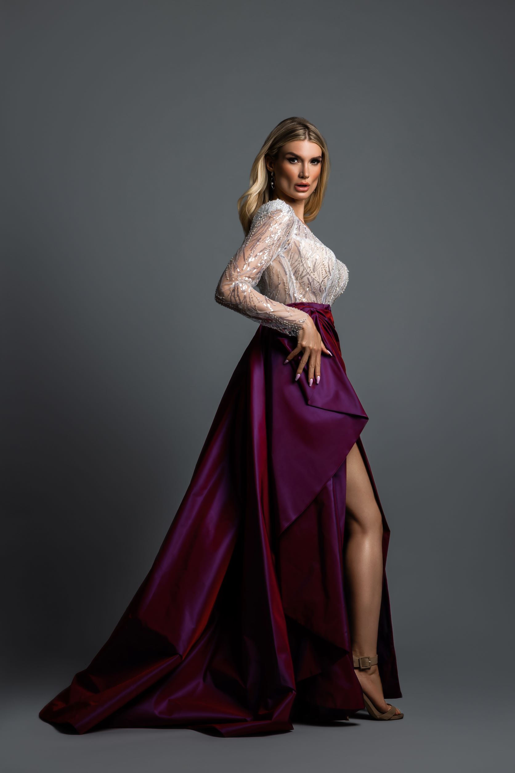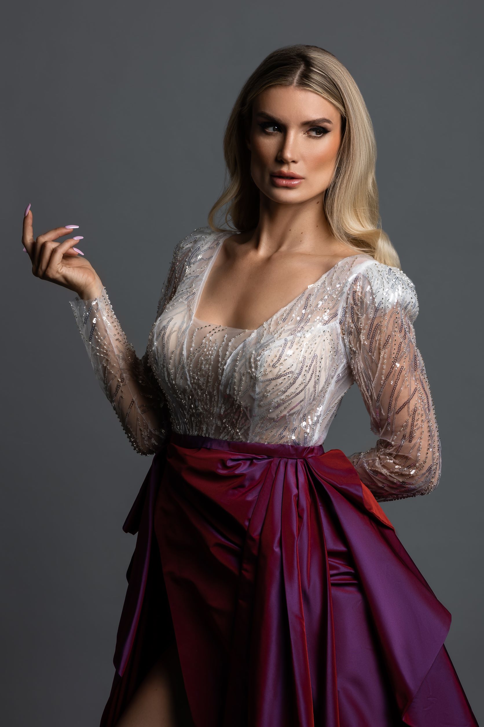 Gorgeous long sleeve with sequin details along with a full satin skirt with a sexy high slit!