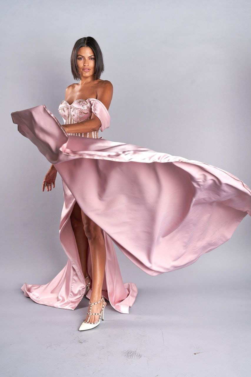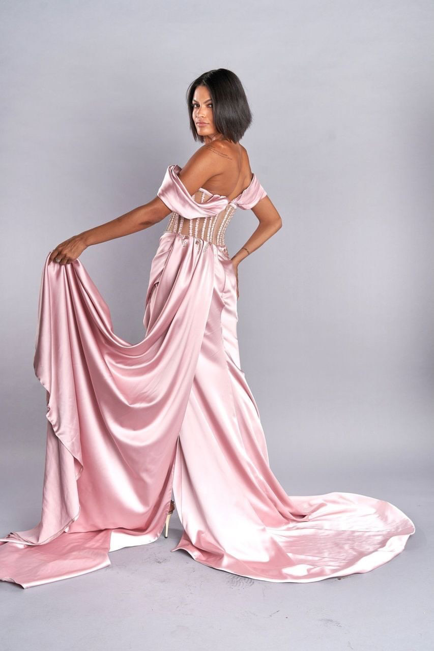 Off shoulder hand beaded sheer corset with draped satin high slit skirt. Perfect gown to flatter every shape and size.