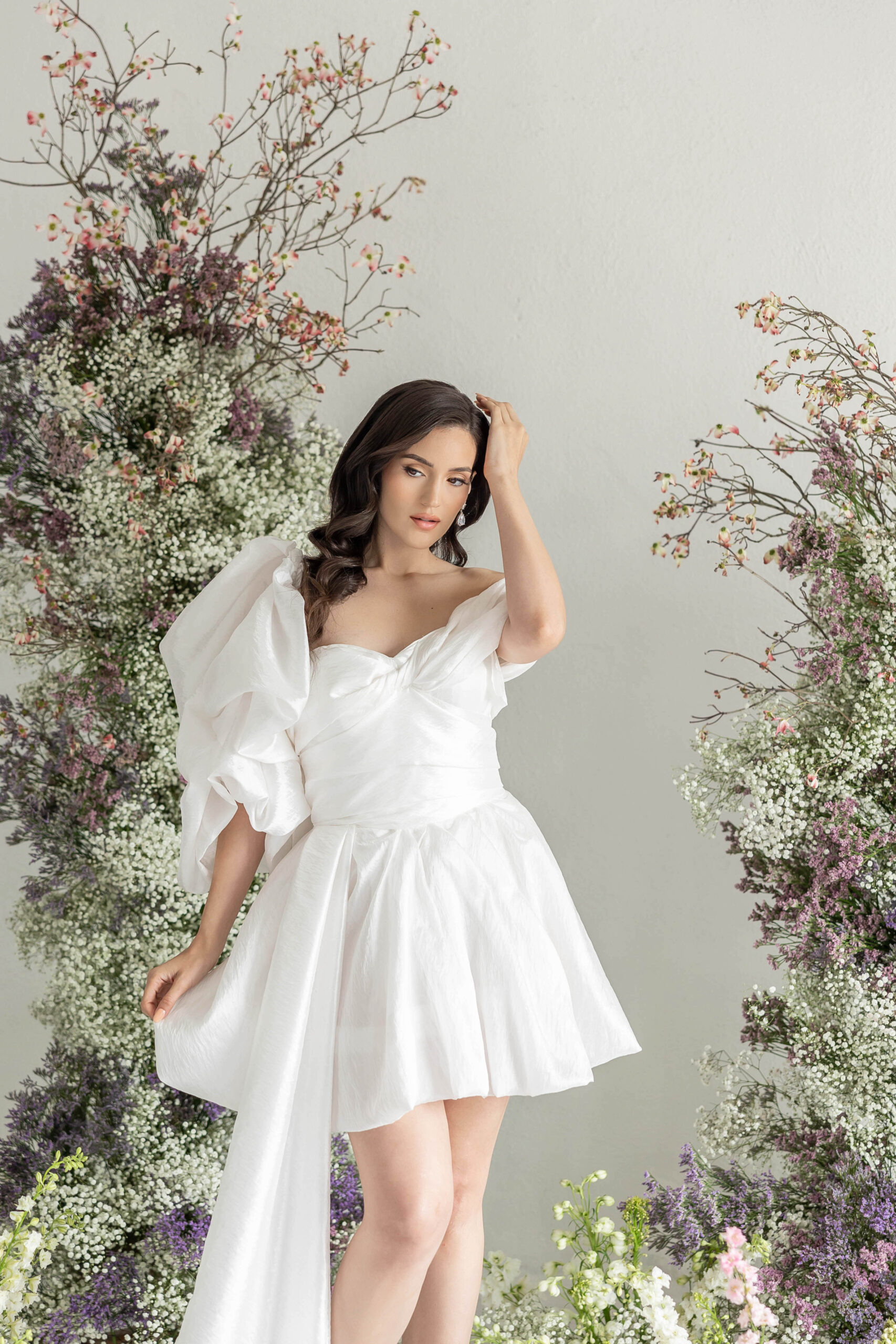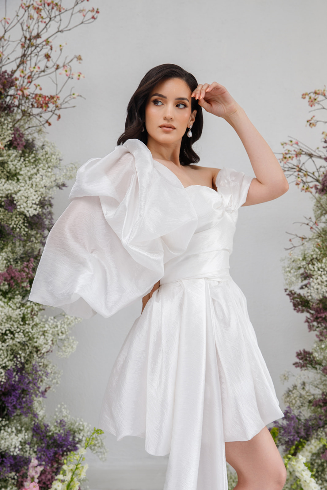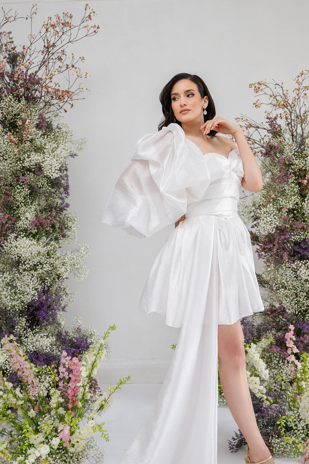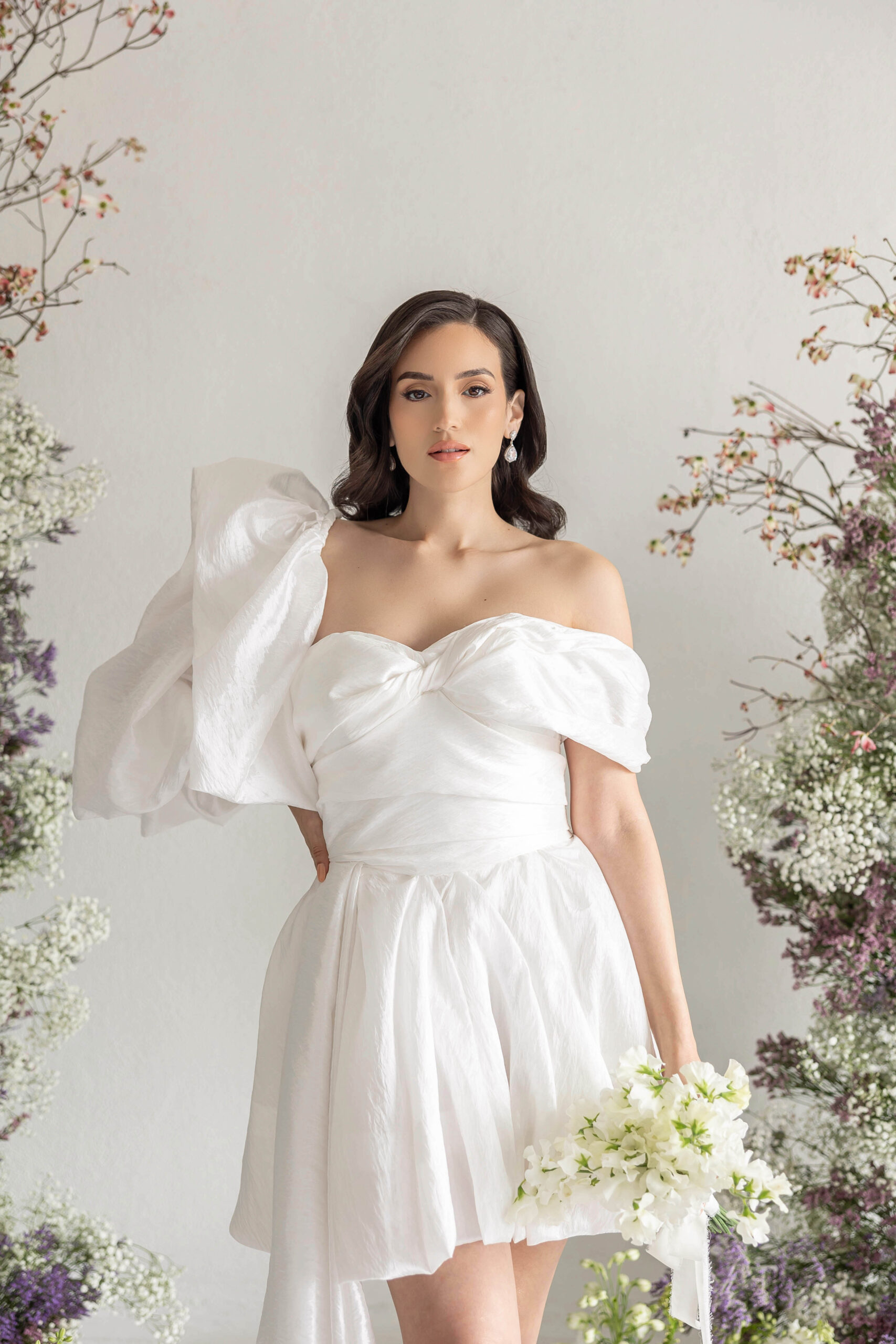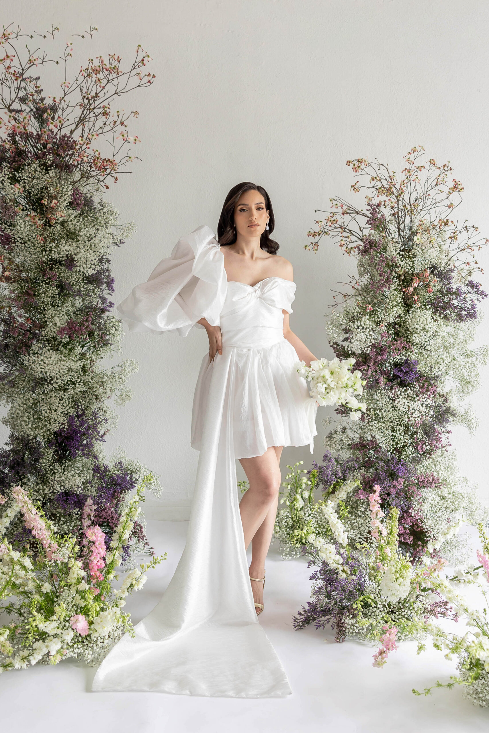A chic off-the-shoulder wedding dress with a trailing train, featuring a corset and the option to add a detachable single sleeve for extra flair.