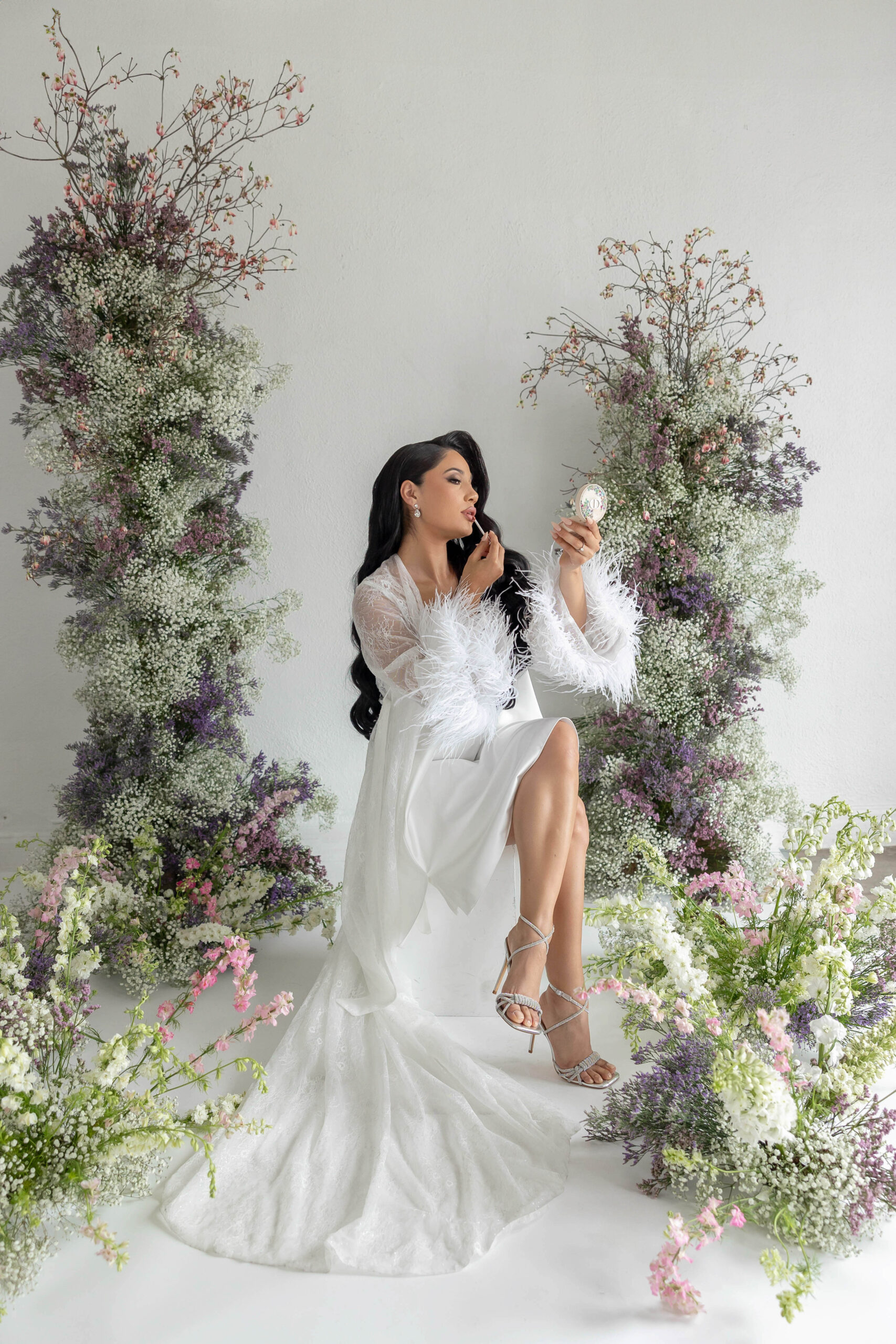 Join me as I prepare for my grand wedding day! Slip into a French lace stylist robe embellished with feather trim, perfectly paired with a satin short dress. This exquisite ensemble sets the tone for getting ready in style on your special day.