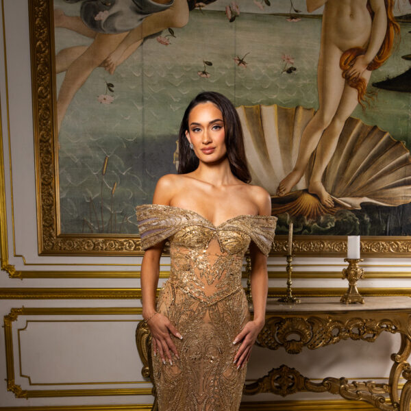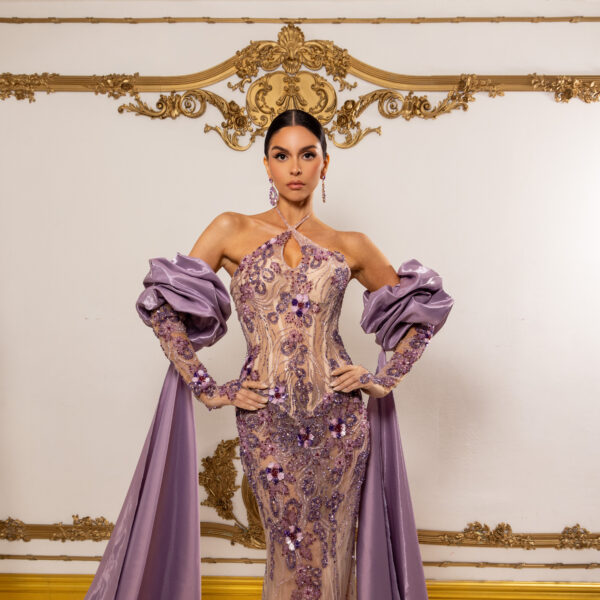 Fabric: Sheer mesh base, hand-beaded embellishments, silk chiffon removable capes