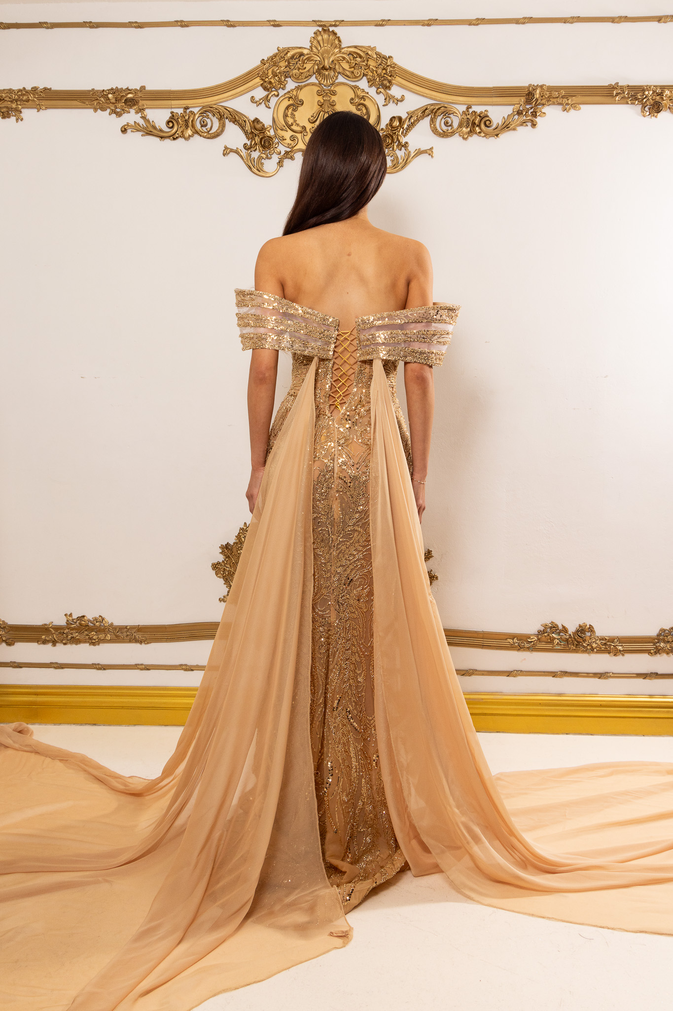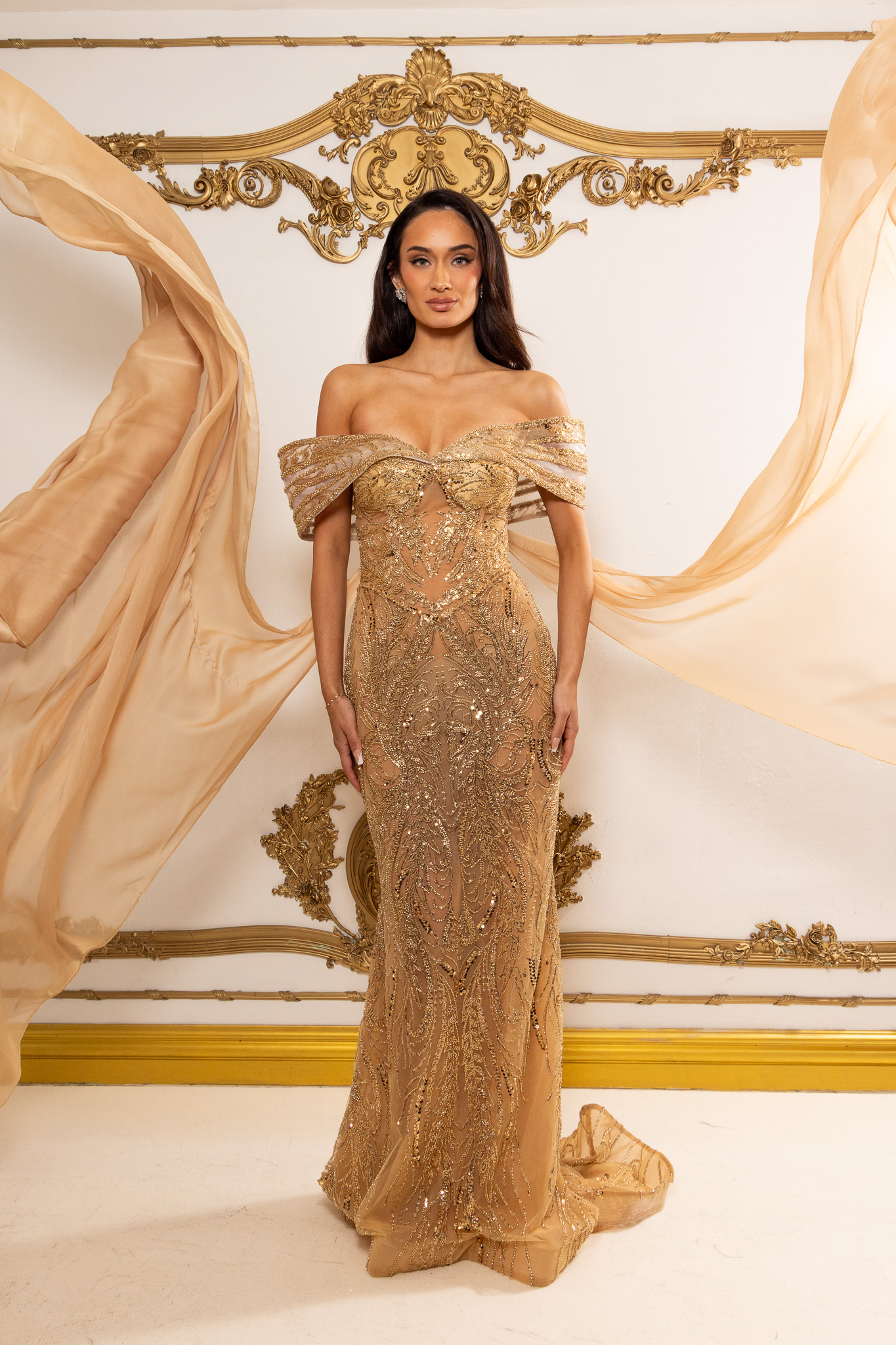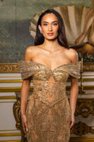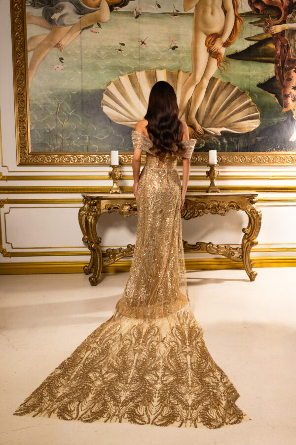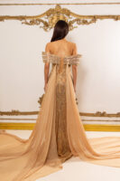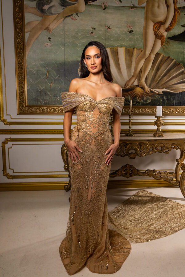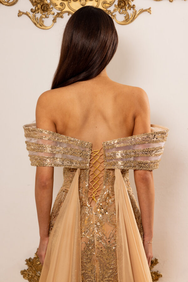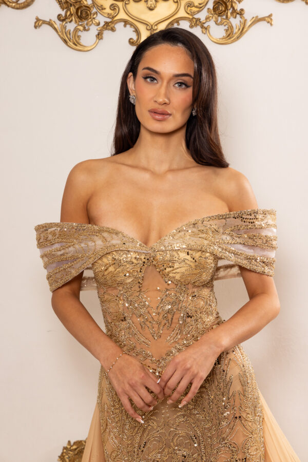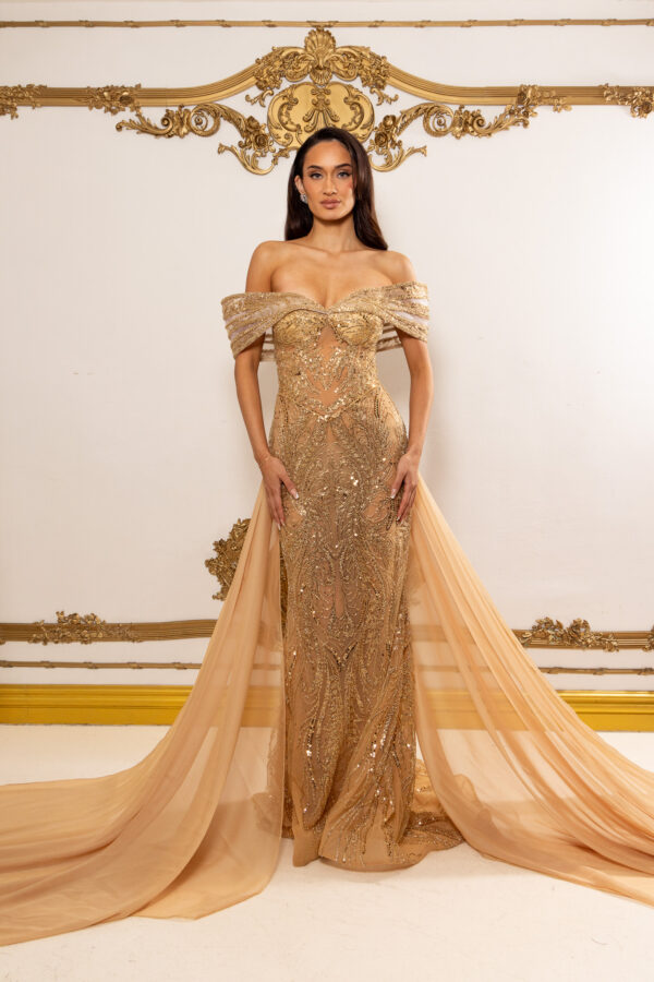 Celeste is an elegant off-the-shoulder gown crafted on a warm nude-gold base, intricately hand-beaded with luminous gold-toned embellishments that sculpt and elongate the silhouette. The softly draped neckline and fitted column skirt flow into a subtle train, while removable silk chiffon capes add dramatic, airy fluidity and versatile styling. Made entirely to measure, this luxurious design delivers a flawless, body-contouring fit with refined, statement-making elegance.
