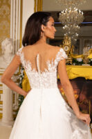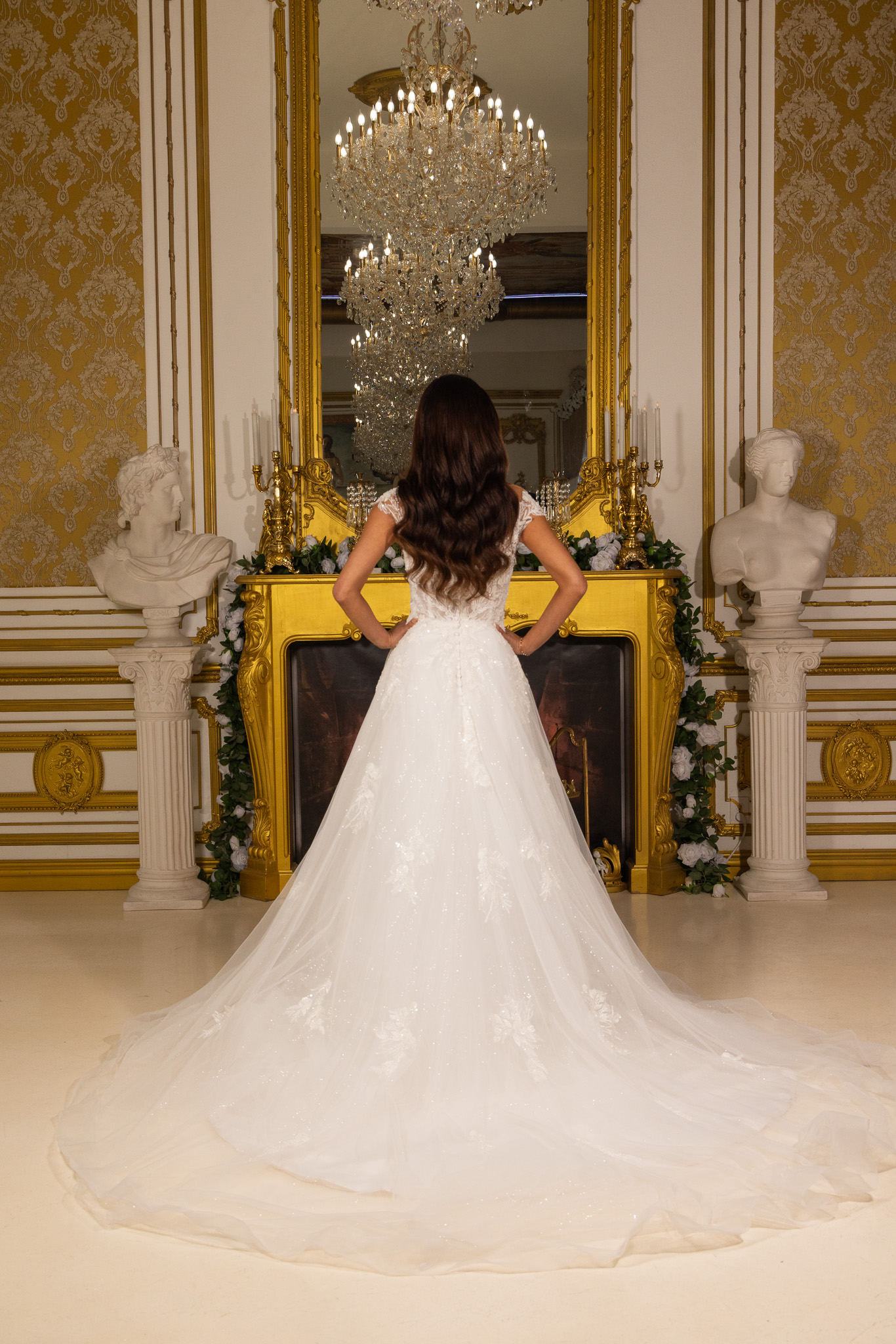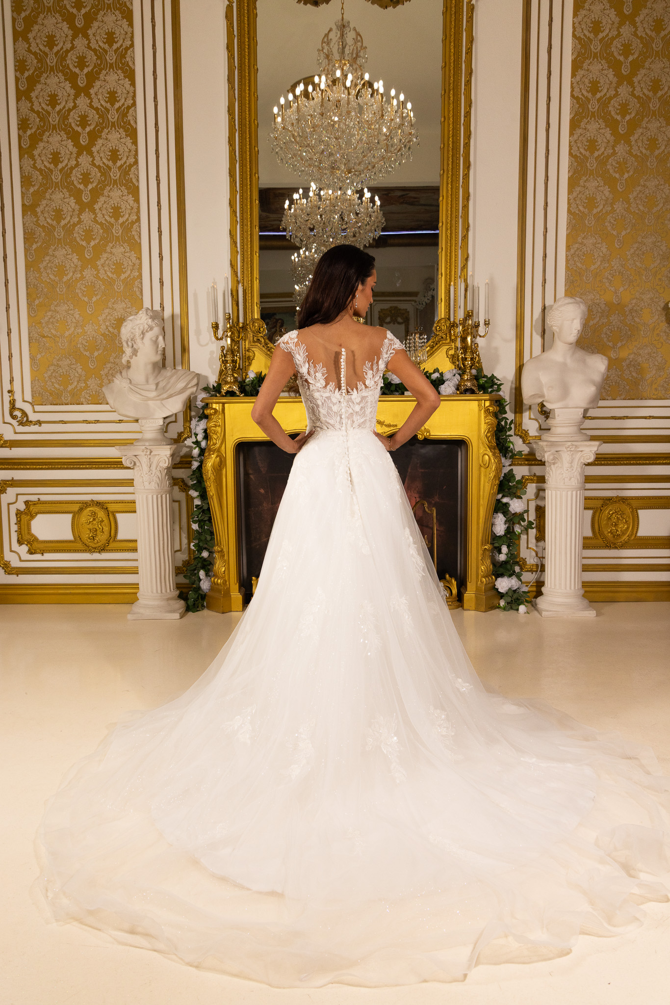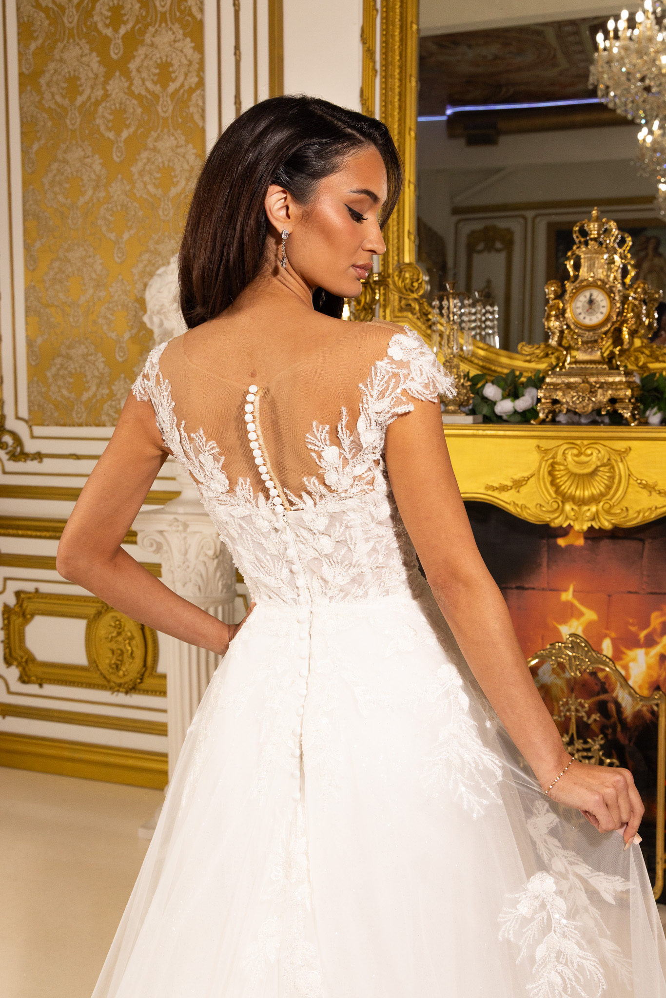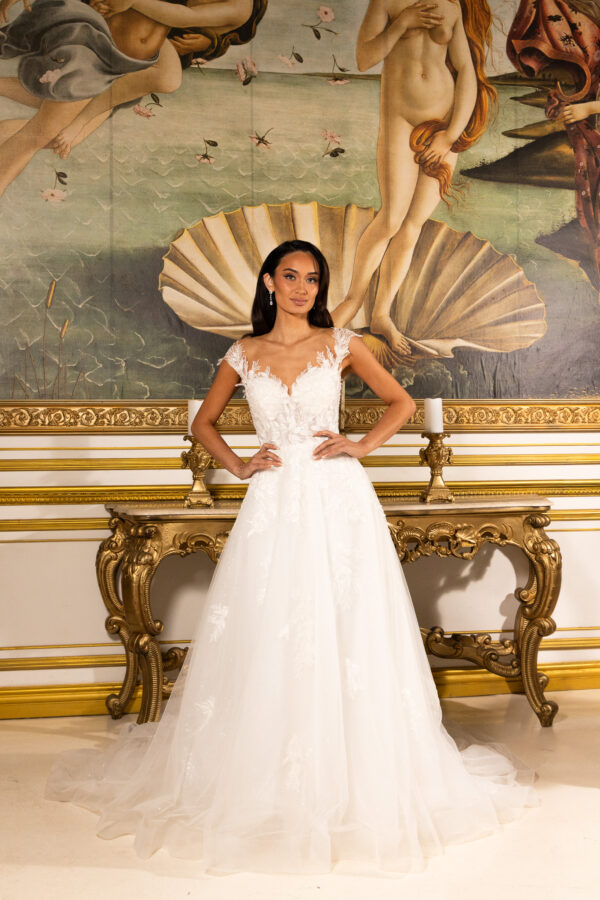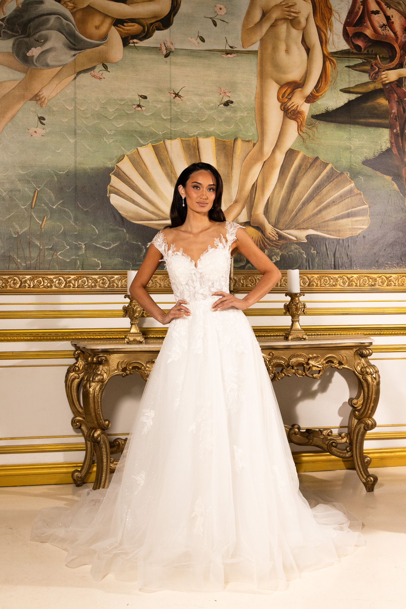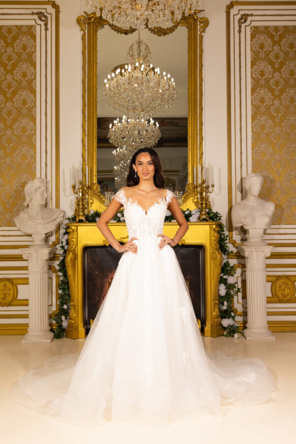 Chantel is an elegant A-line wedding gown crafted from soft layers of ivory tulle and delicate lace appliqué for a light, romantic feel. The structured lace bodice with a plunging illusion sweetheart neckline and soft cap sleeves flows into a graceful full skirt with timeless femininity. Made entirely to measure, this bespoke bridal design delivers a flawless fit with classic, confident elegance.