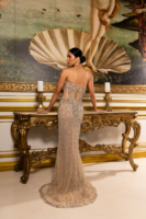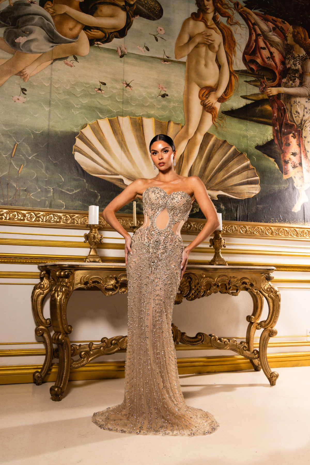 Chantelle is a dazzling strapless gown crafted on a sheer nude base in a soft champagne tone, fully embellished with cubic and zirconia cut crystals and intricate sequin embroidery that captures the light from every angle. The sculpted corset silhouette with artful cutout detailing contours the body, while the fluid, body-skimming skirt creates a sleek, elongated finish. Made entirely to measure, this couture design delivers a flawless second-skin fit with refined luxury and unforgettable impact.