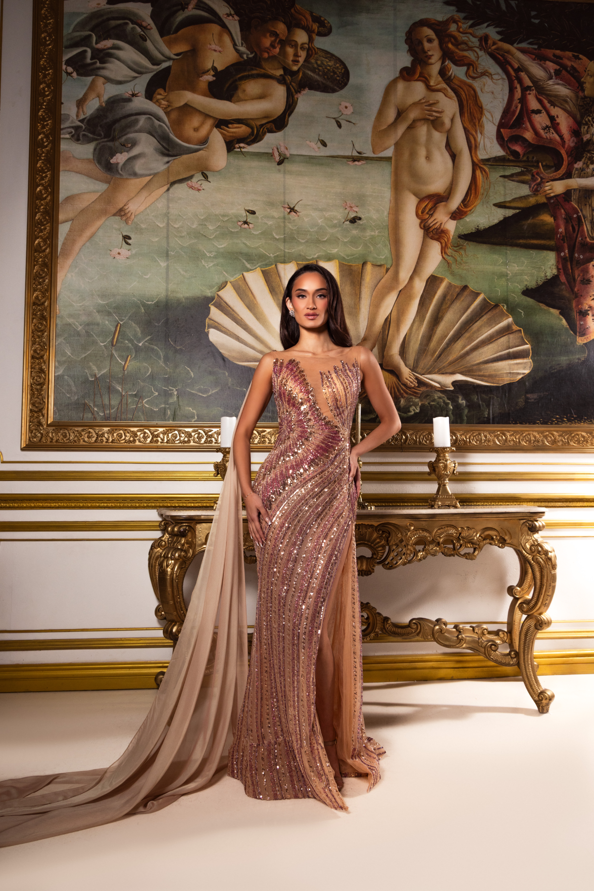 the light. Sculptural embellishment contours and elongates the figure, while the illusion neckline and thigh-high slit add modern allure and elegant movement. Made entirely to measure, this bespoke design delivers a flawless, body-skimming fit with refined, unforgettable elegance.