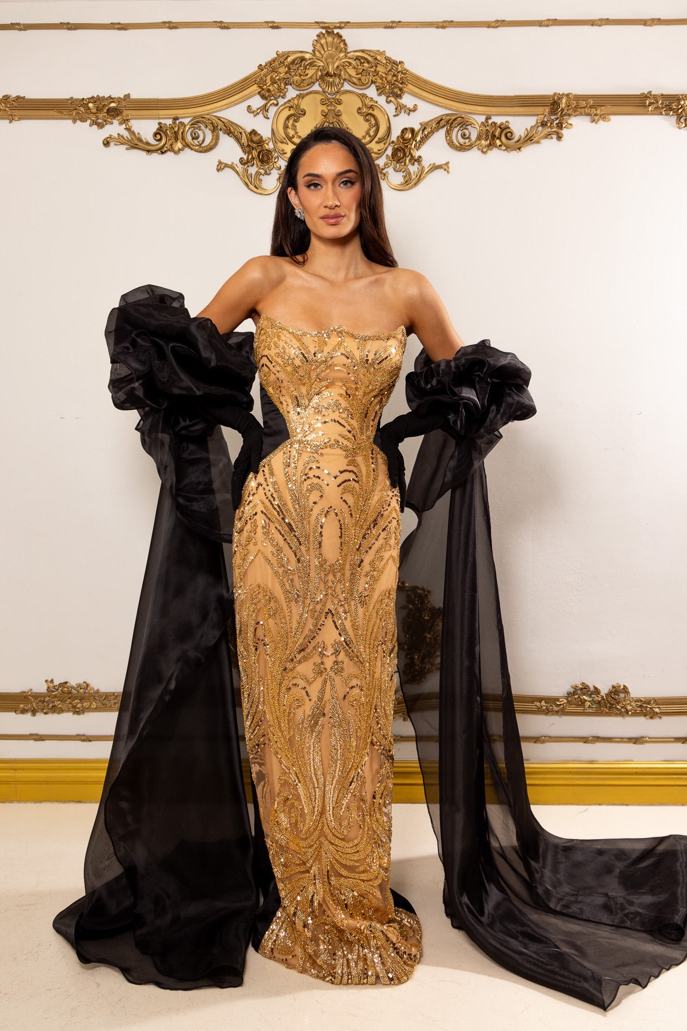 that sculpts the body with dramatic precision. The strapless corset silhouette is paired with removable black organza sleeves and detachable gloves, allowing a seamless transformation from bold high-fashion drama to sleek strapless elegance. Made entirely to measure, this versatile design delivers a flawless custom fit with confident, statement-making glamour.