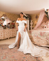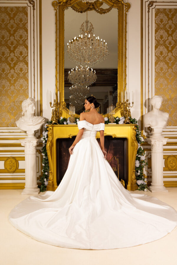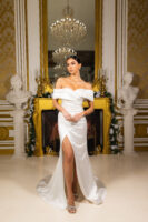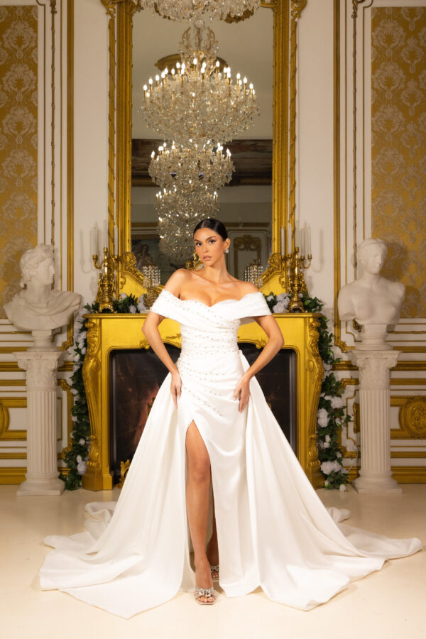 Fabric: Stretch bridal satin with sequin and beading accents.